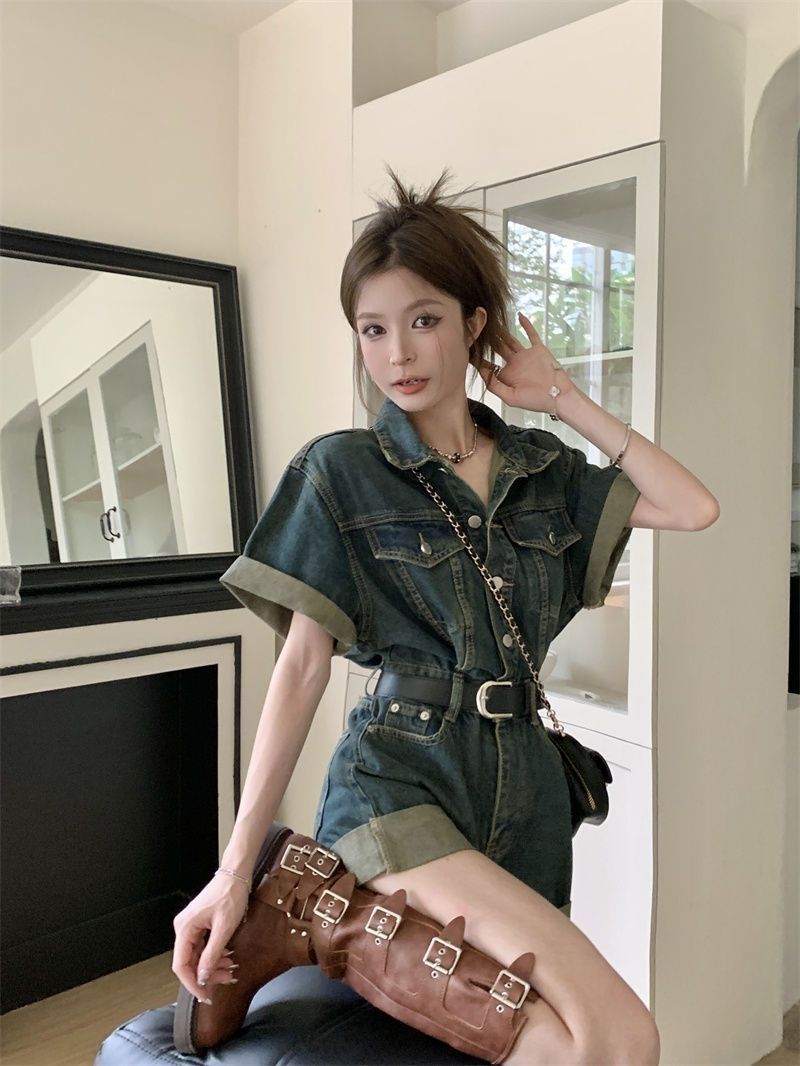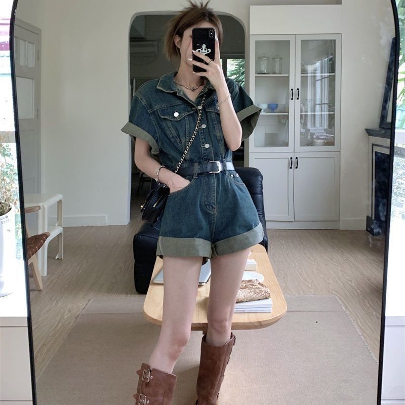 곡선 결합 된 청바지 여름 데님 2024 새로운 디자인 귀여운 복고풍 슬림 넓은 허리 반바지 바지스토어 가기