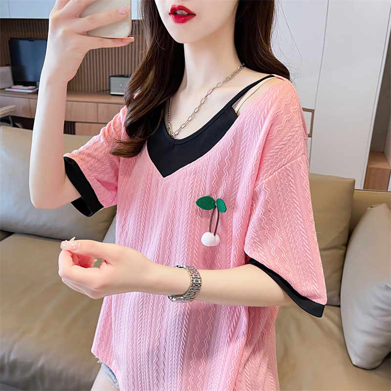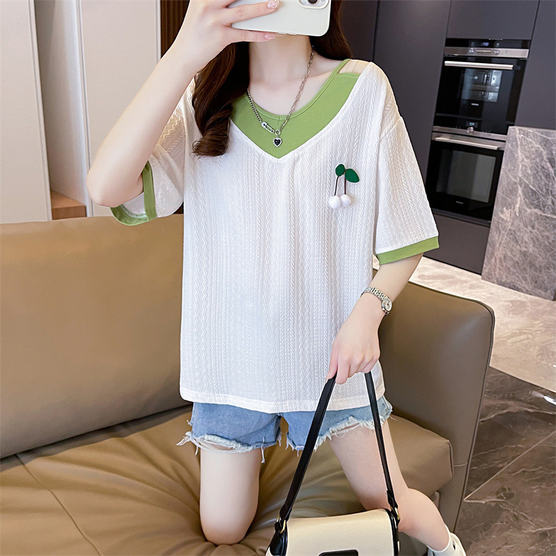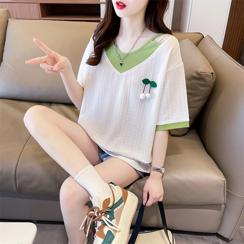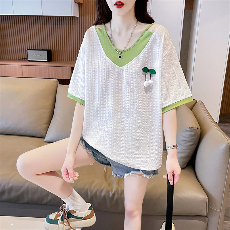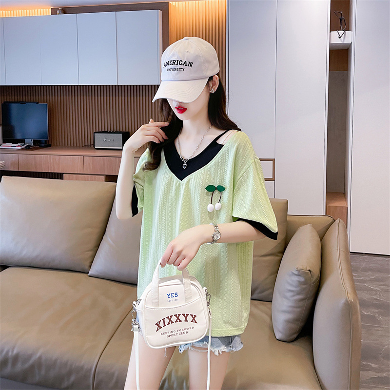 디자인 센스 틈새 가짜 투피스 V 넥 반팔 티셔츠 여성용 여름 플러스 사이즈 느슨한 콜라본 컬러 블록 작은 탑
