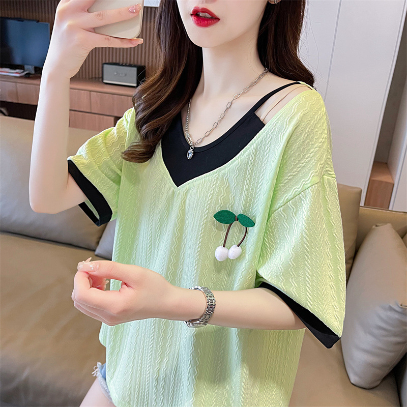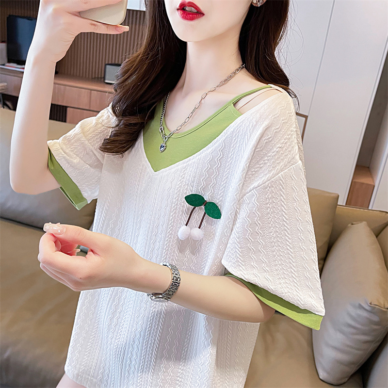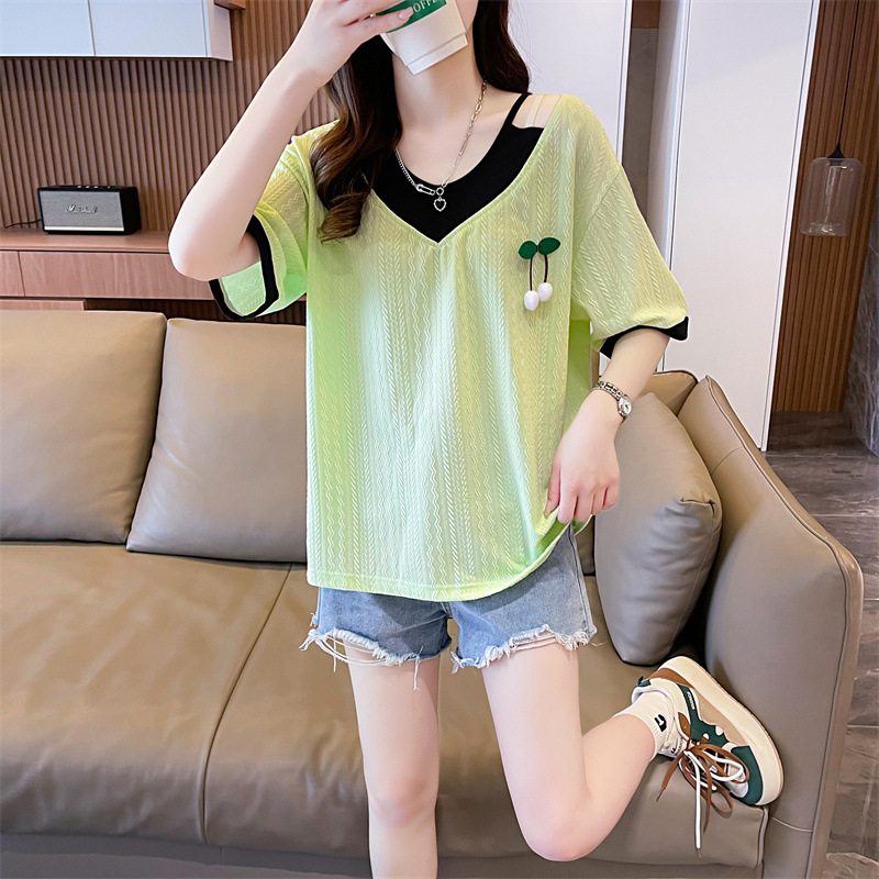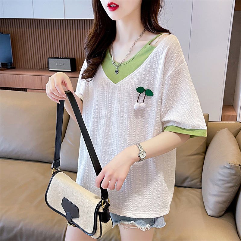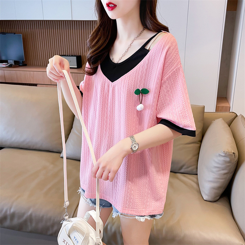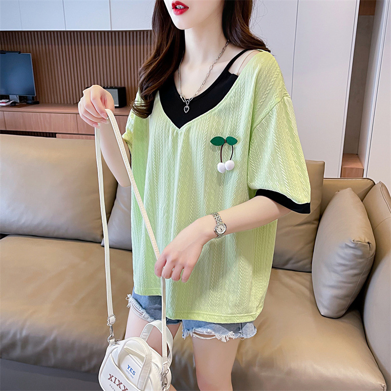 디자인 센스 틈새 가짜 투피스 V 넥 반팔 티셔츠 여성용 여름 플러스 사이즈 느슨한 콜라본 컬러 블록 작은 탑