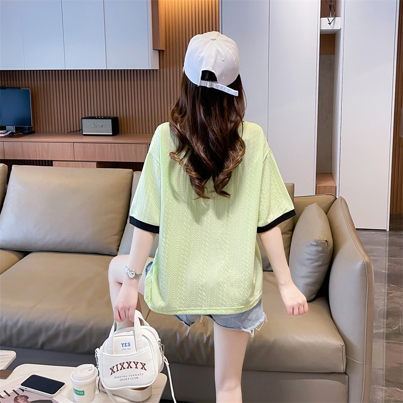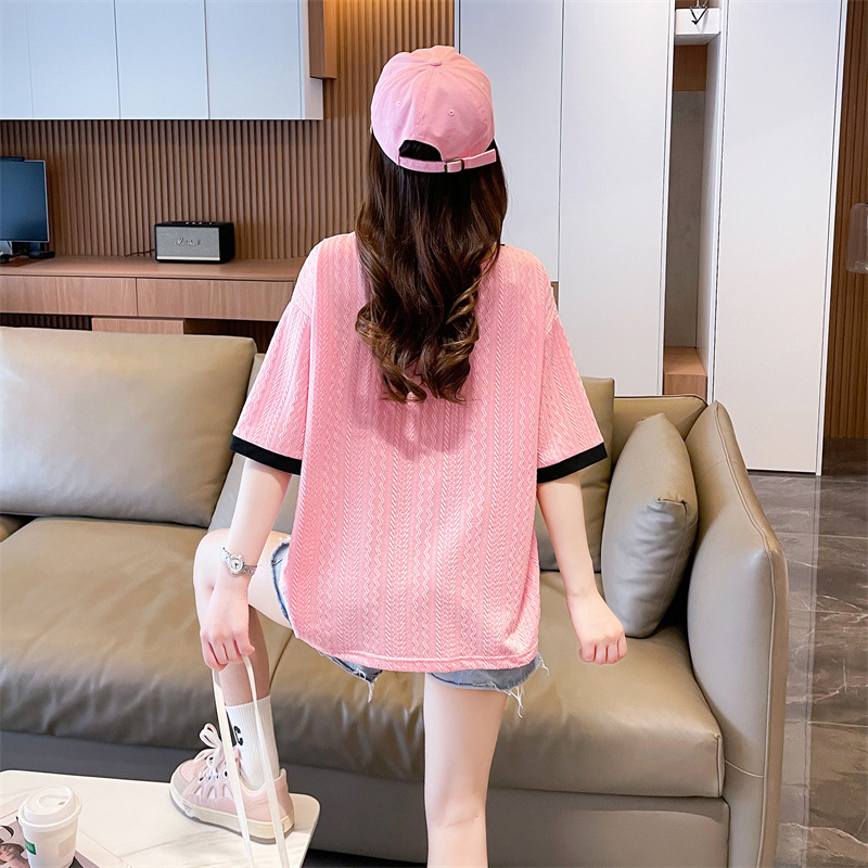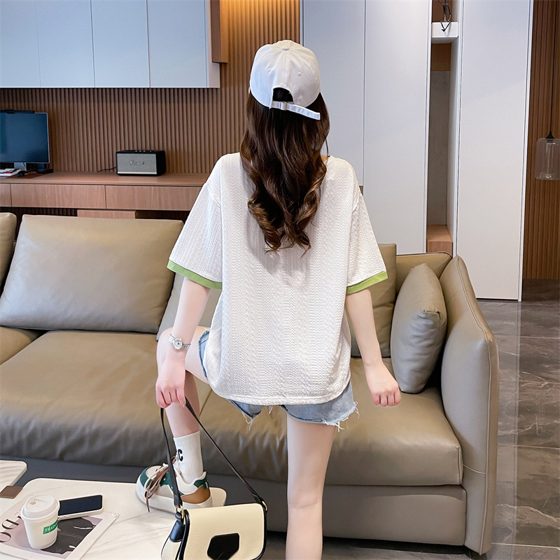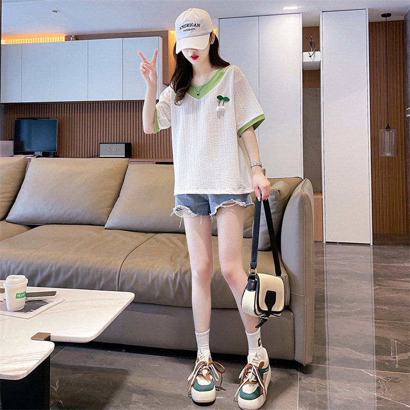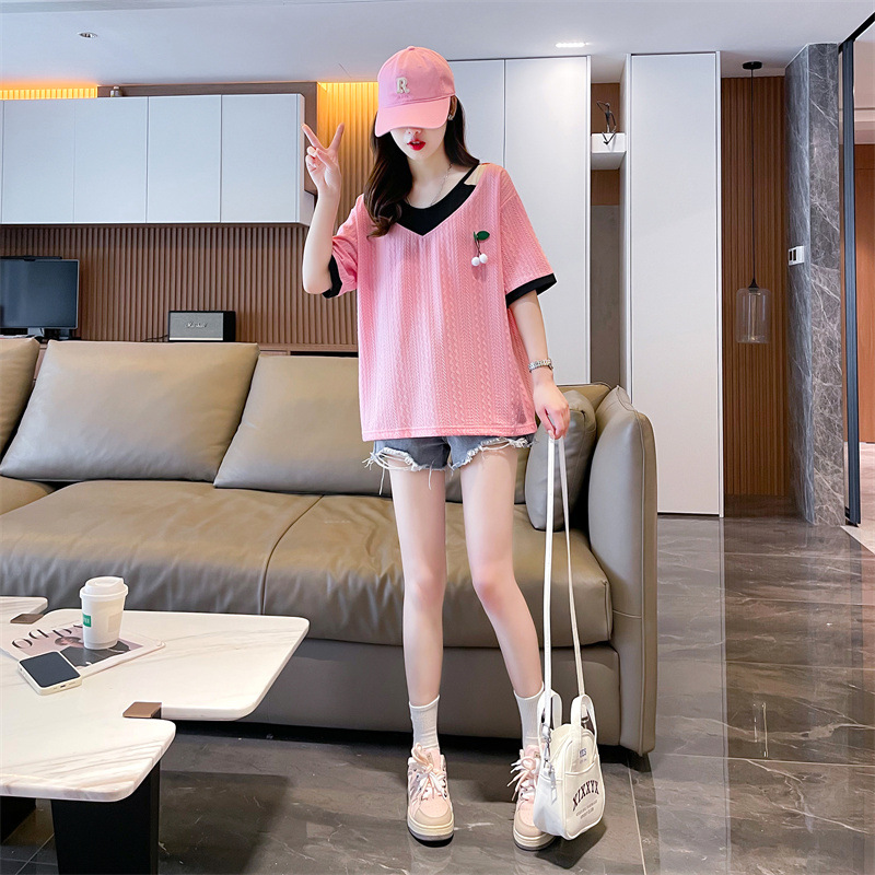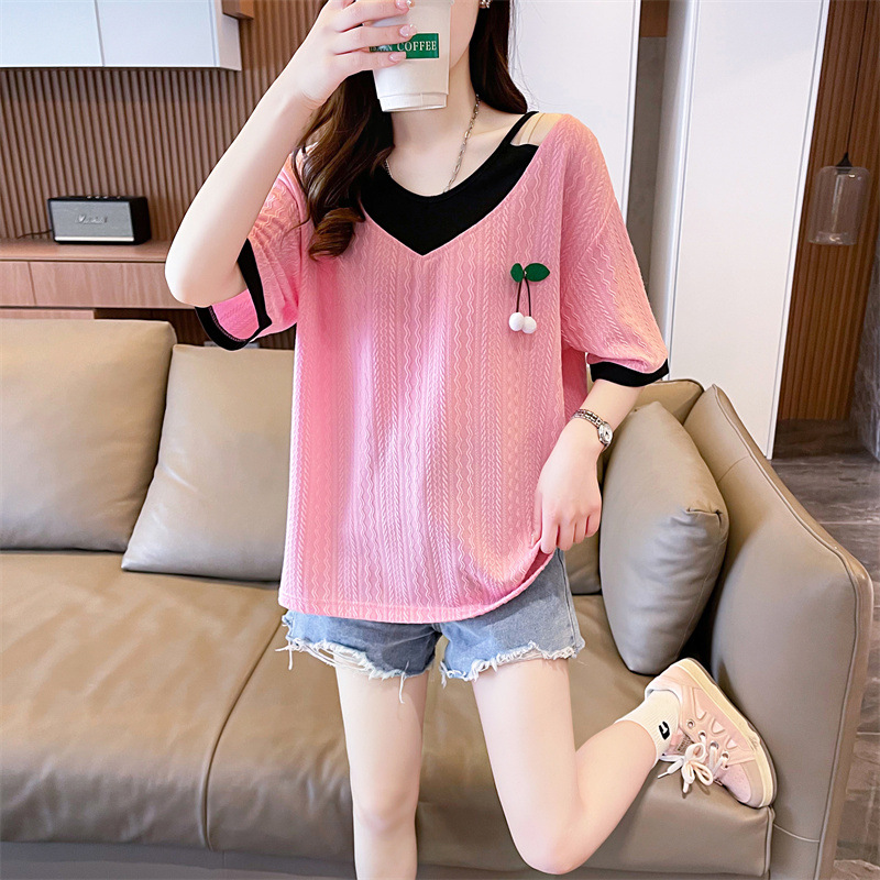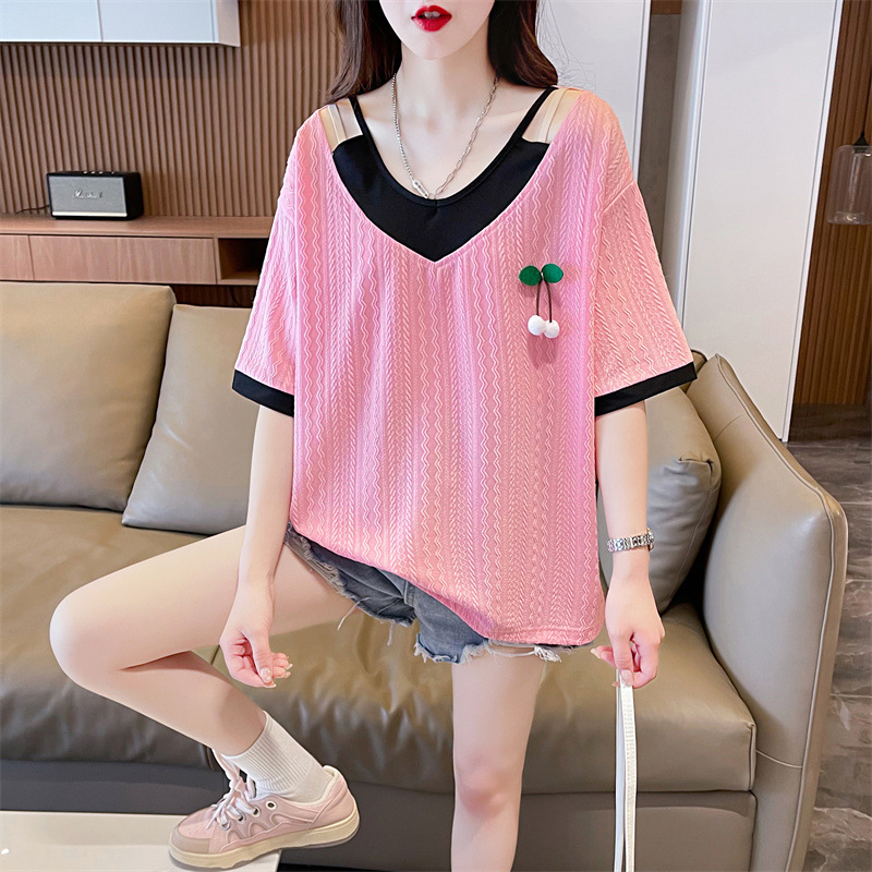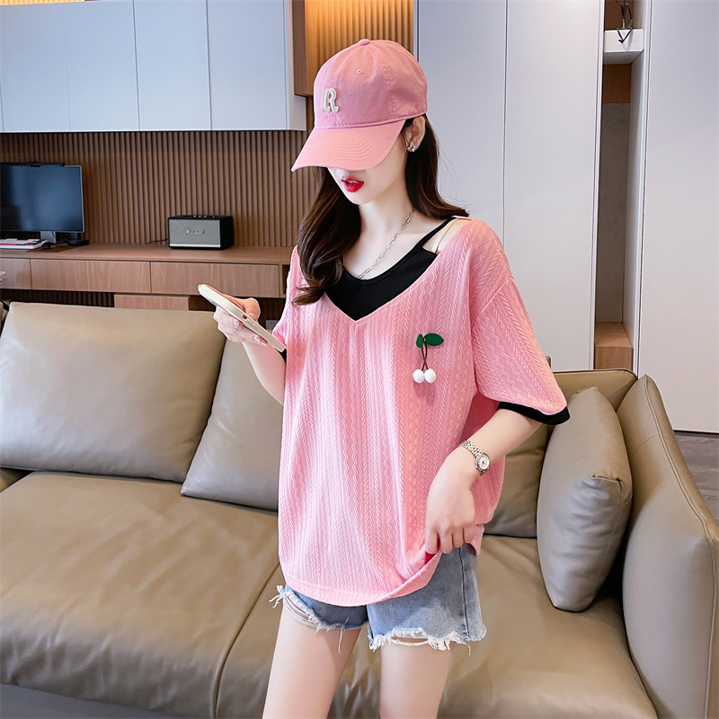 디자인 센스 틈새 가짜 투피스 V 넥 반팔 티셔츠 여성용 여름 플러스 사이즈 느슨한 콜라본 컬러 블록 작은 탑스토어 가기