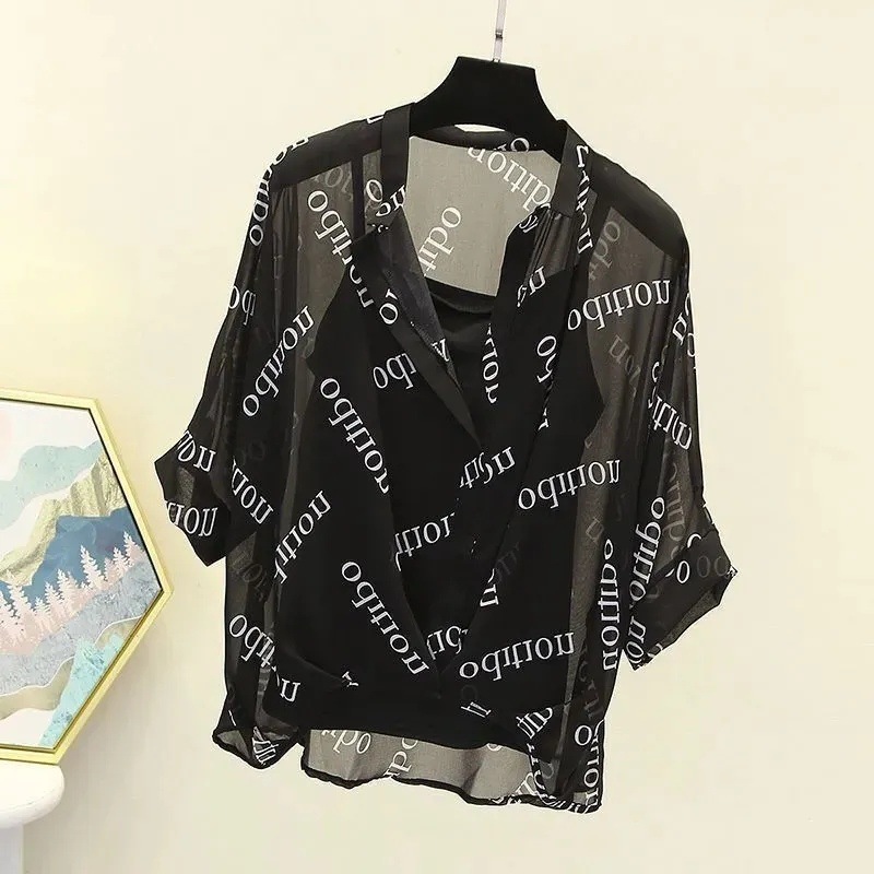 2025 Dolman Sleeve Top Women's Korean style Loose Belly-climm Chiffon 셔츠 투피스 세트 레오파드 무늬 Dolman Collar