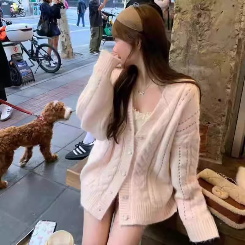 여성용 요정 부드러운 V 넥 니트 가디건 핑크 봄 느슨한 게으른 트위스트 스웨터 코트 탑