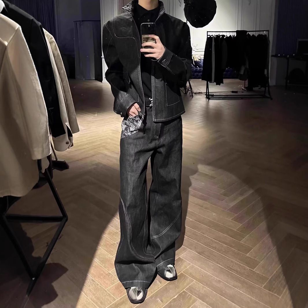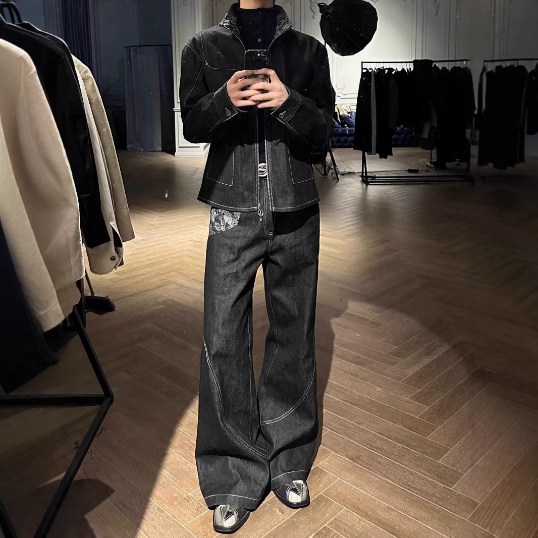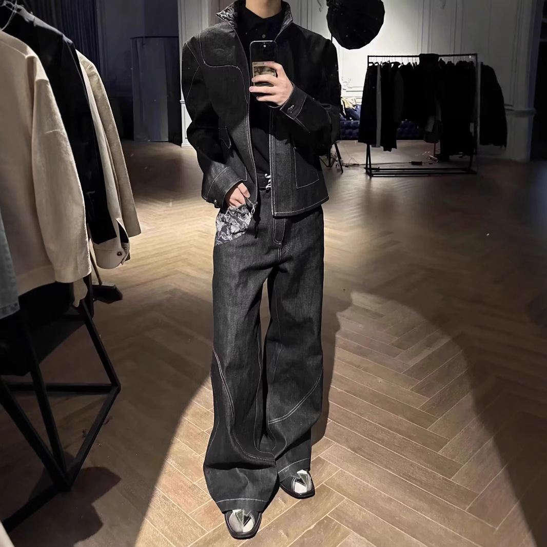 스네이크 트레일 오리지널 소 좁은 붉은 귀 불타는 꽃 자카드 스티칭 마이크로 핏 청바지 남성 스트레이트 루즈 캐주얼 긴 트렌디 바지