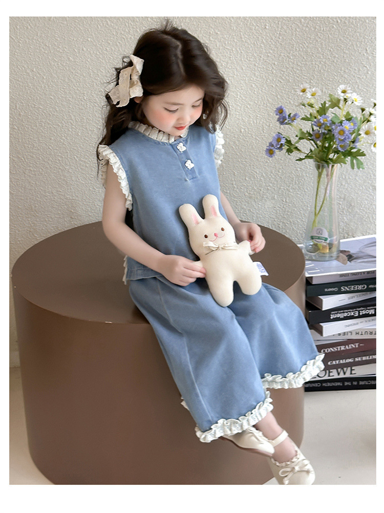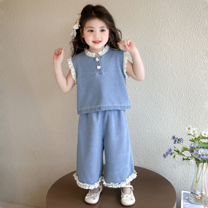 소녀의 세련된 느슨한 여름 얇은 데님 넓은 다리 바지 세트 아기 소녀 유행 2025 새로운 두 조각 세트