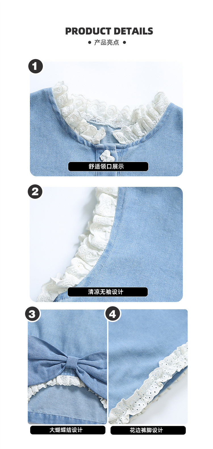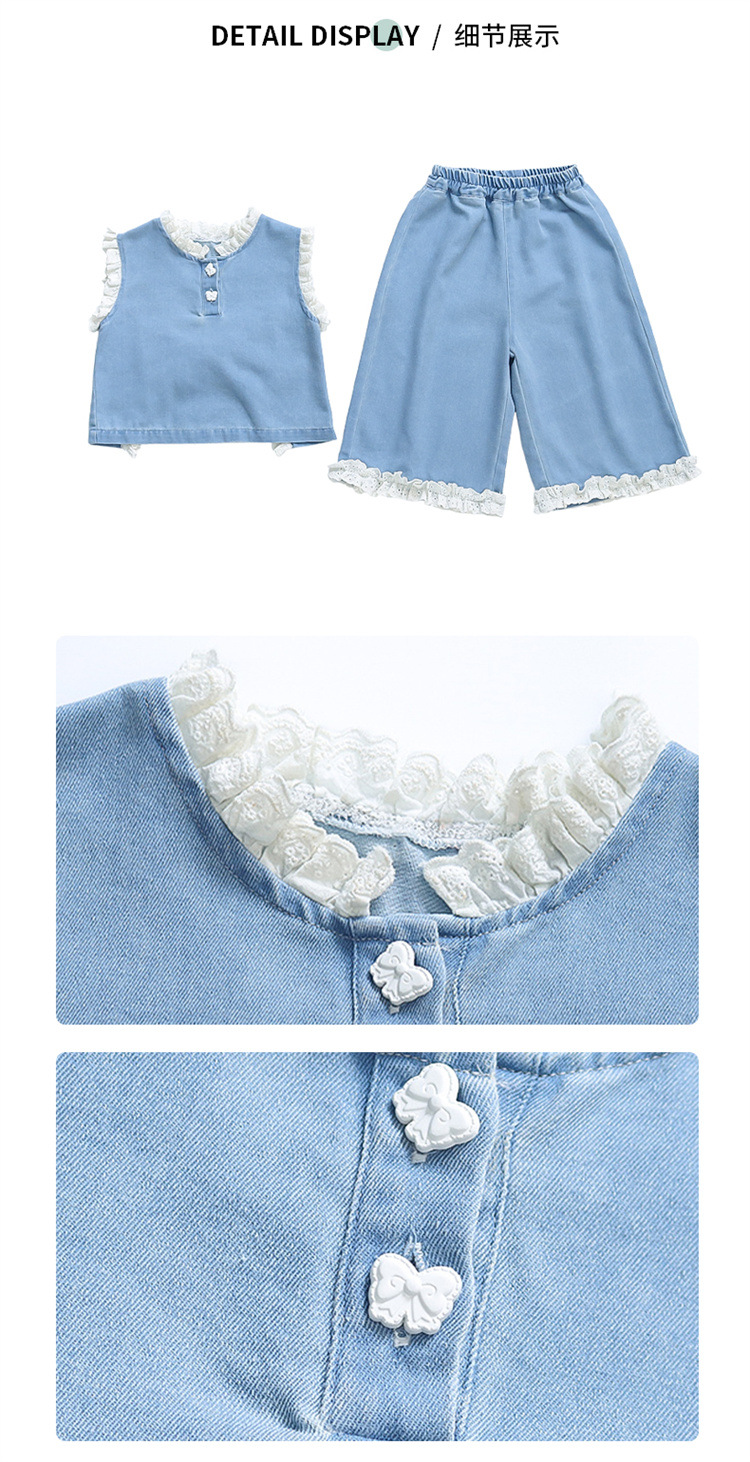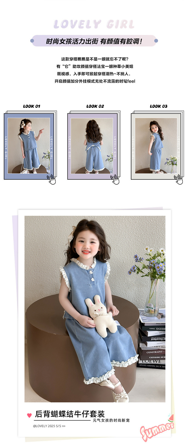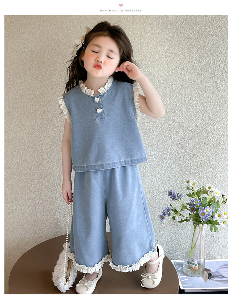 소녀의 세련된 느슨한 여름 얇은 데님 넓은 다리 바지 세트 아기 소녀 유행 2025 새로운 두 조각 세트스토어 가기