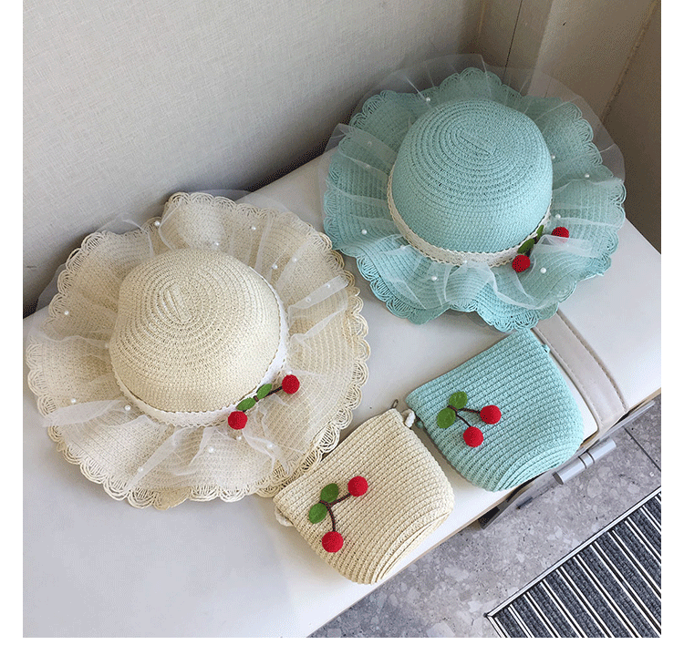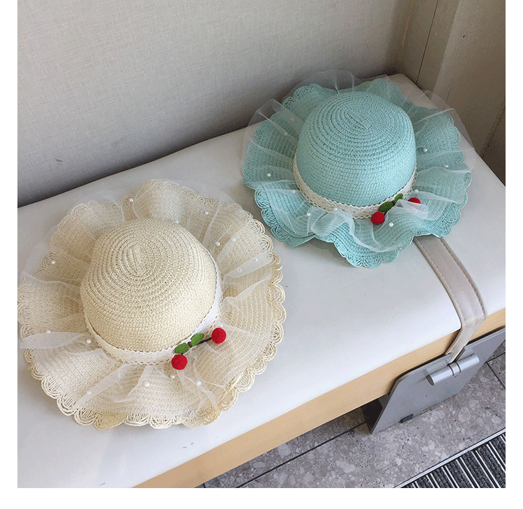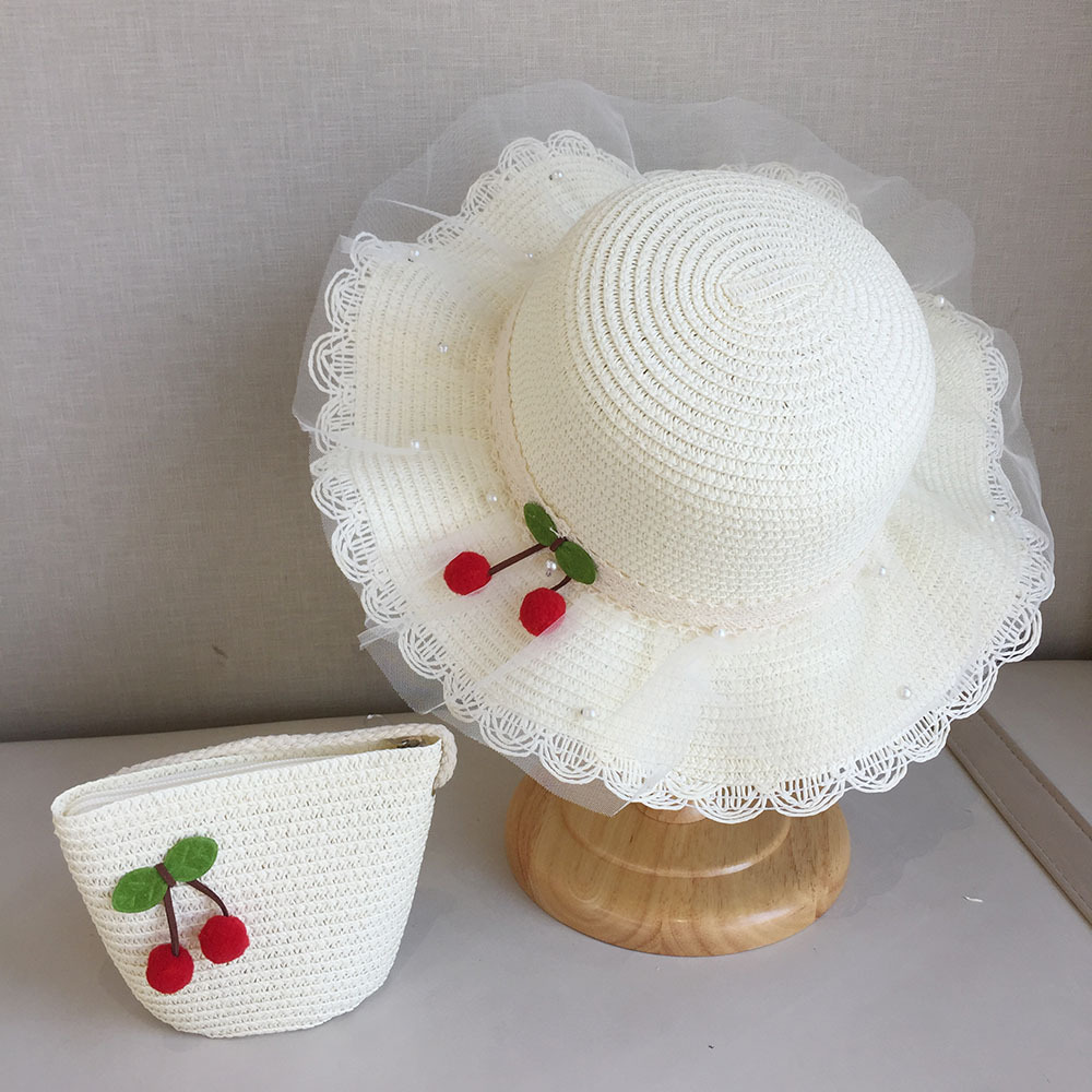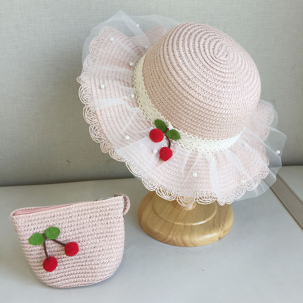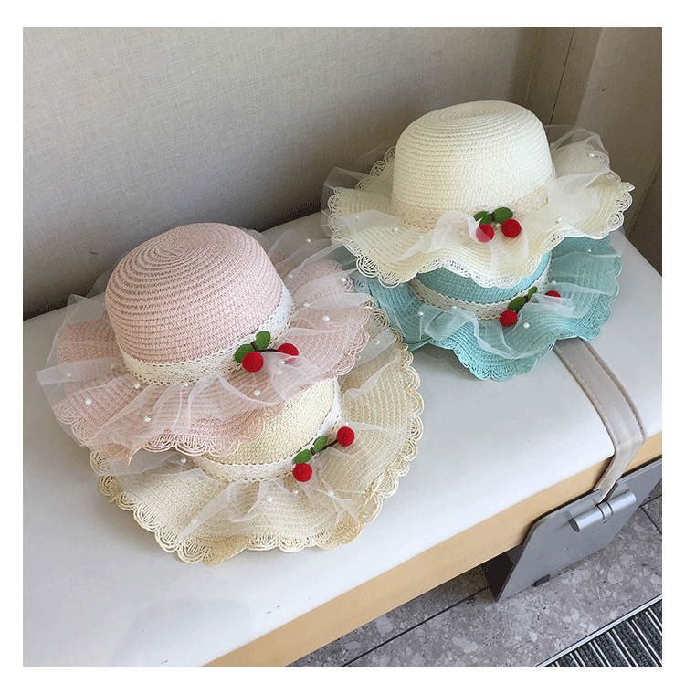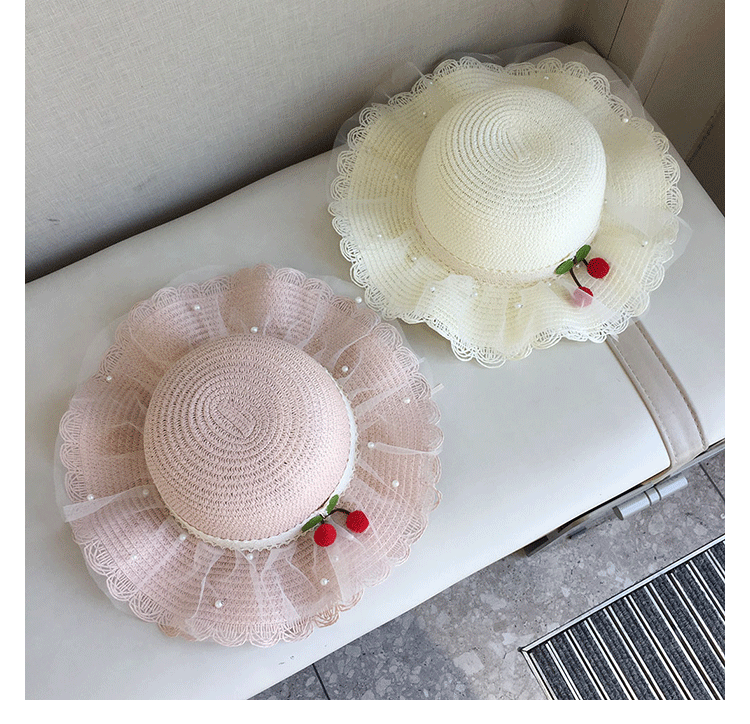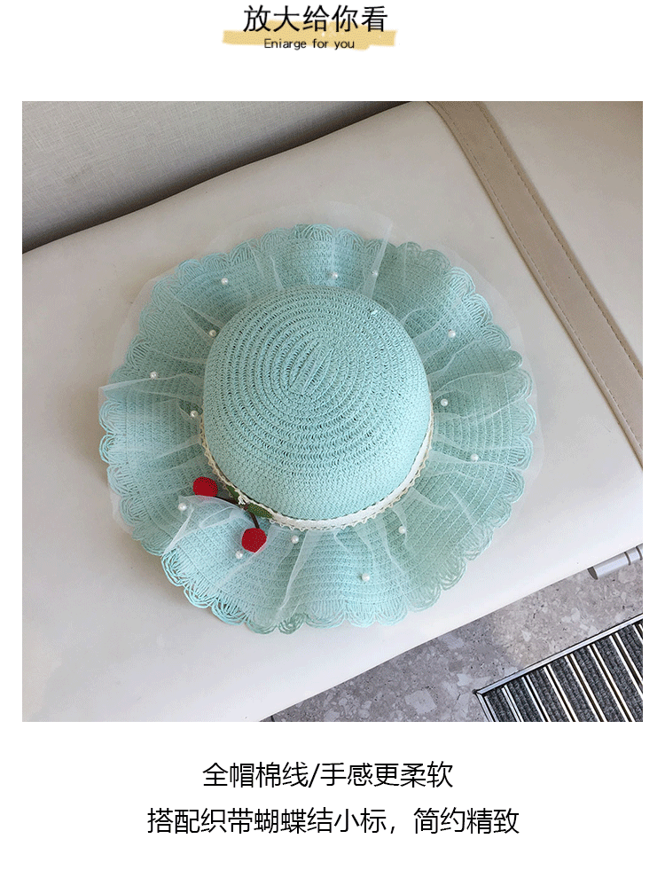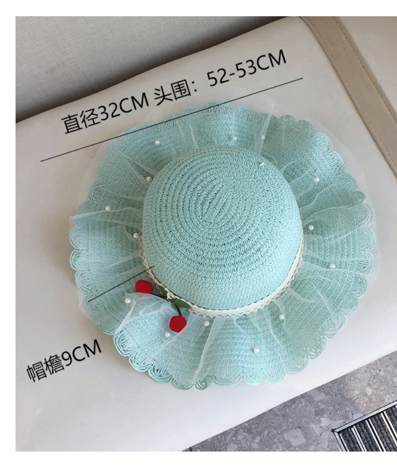 2025 여름 해변 여행 어린이 밀짚 모자 큰 챙 태양 모자 간단한 레이스 체리 밀짚 모자 제조 업체스토어 가기