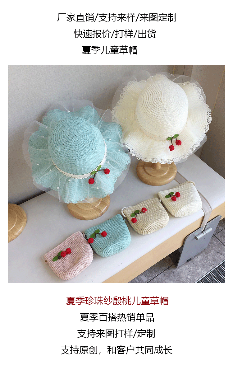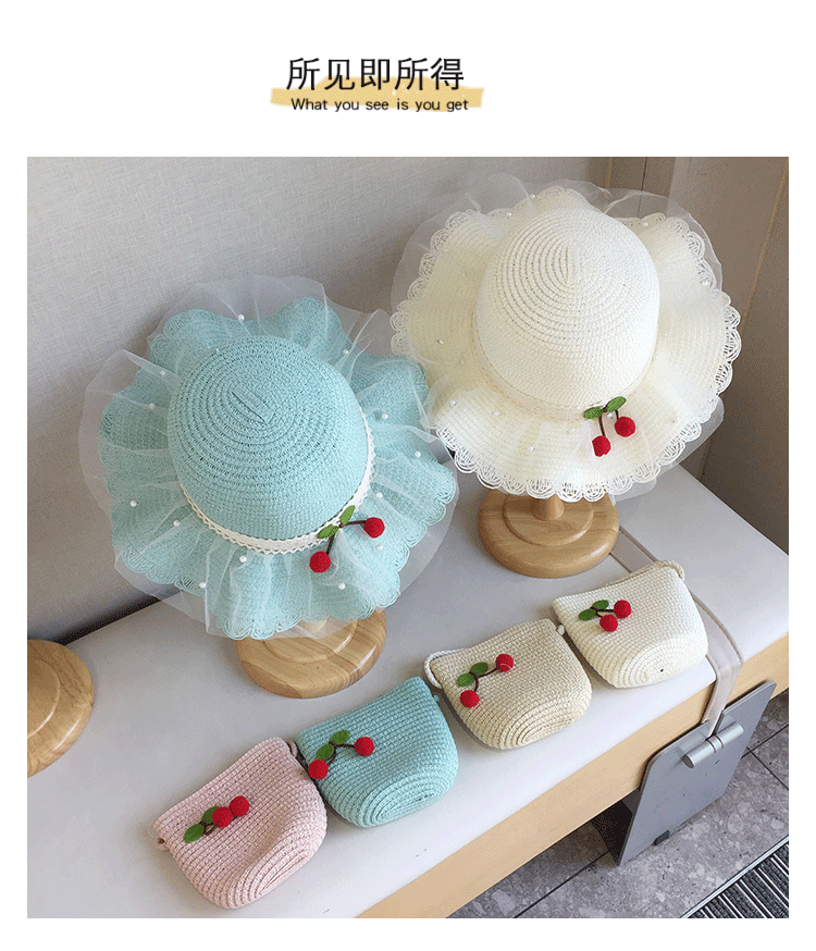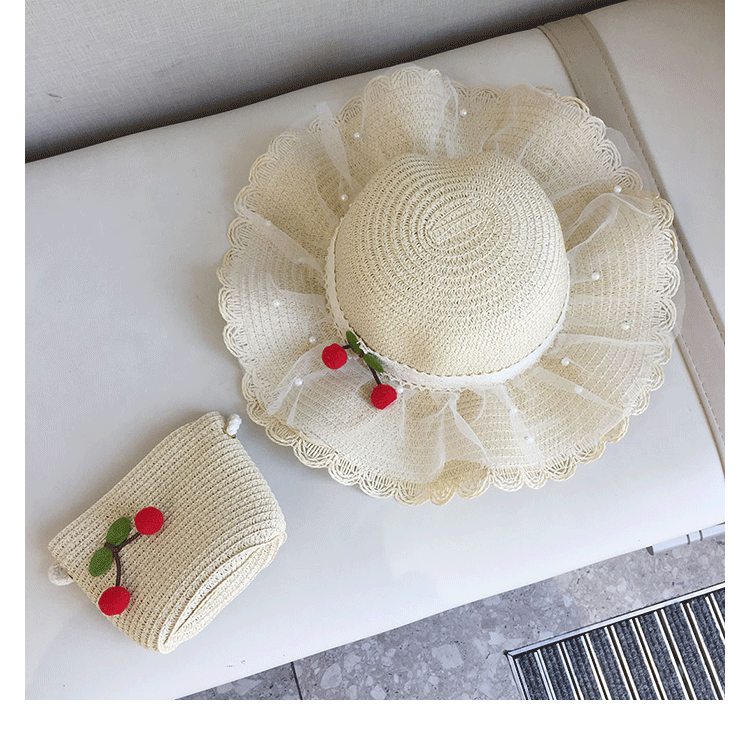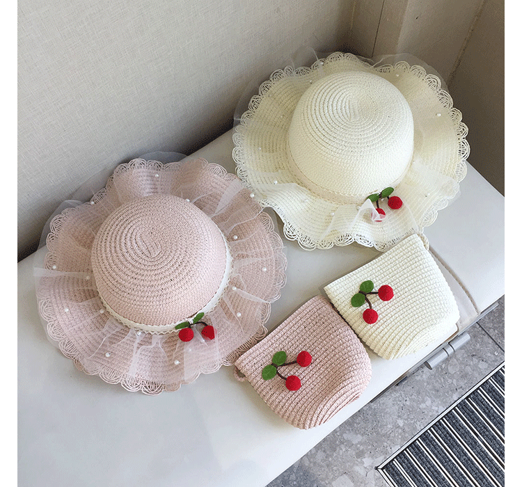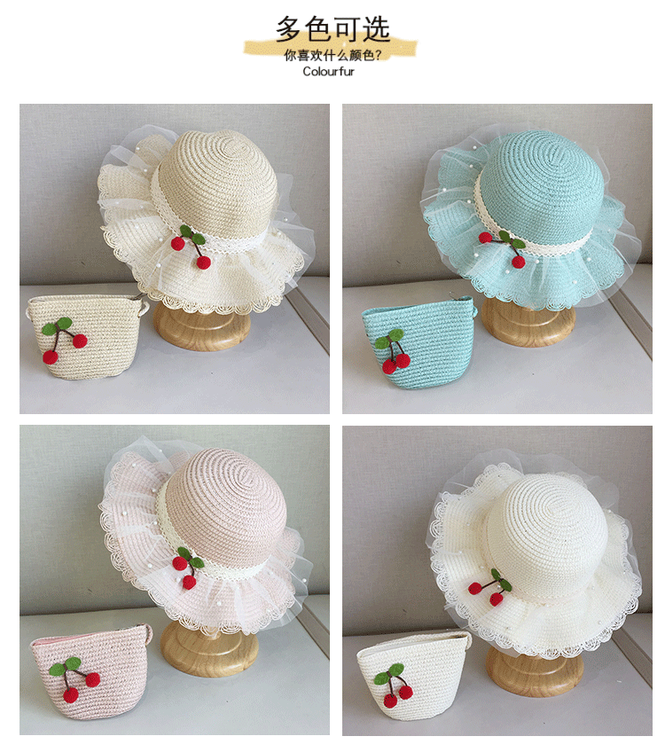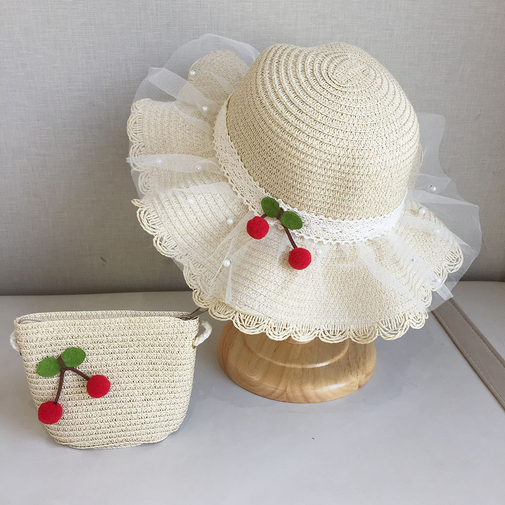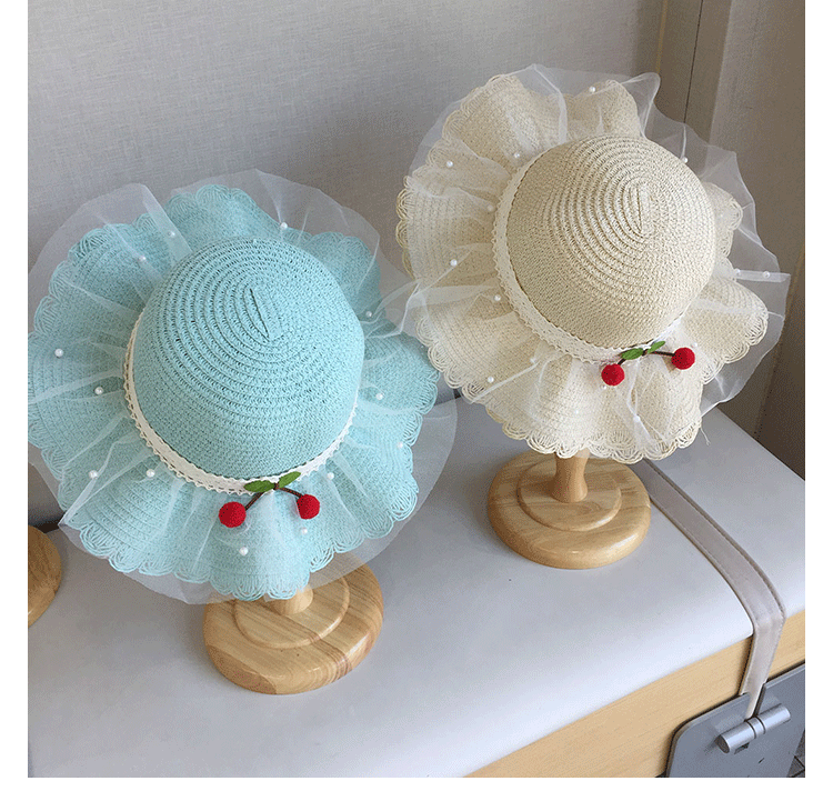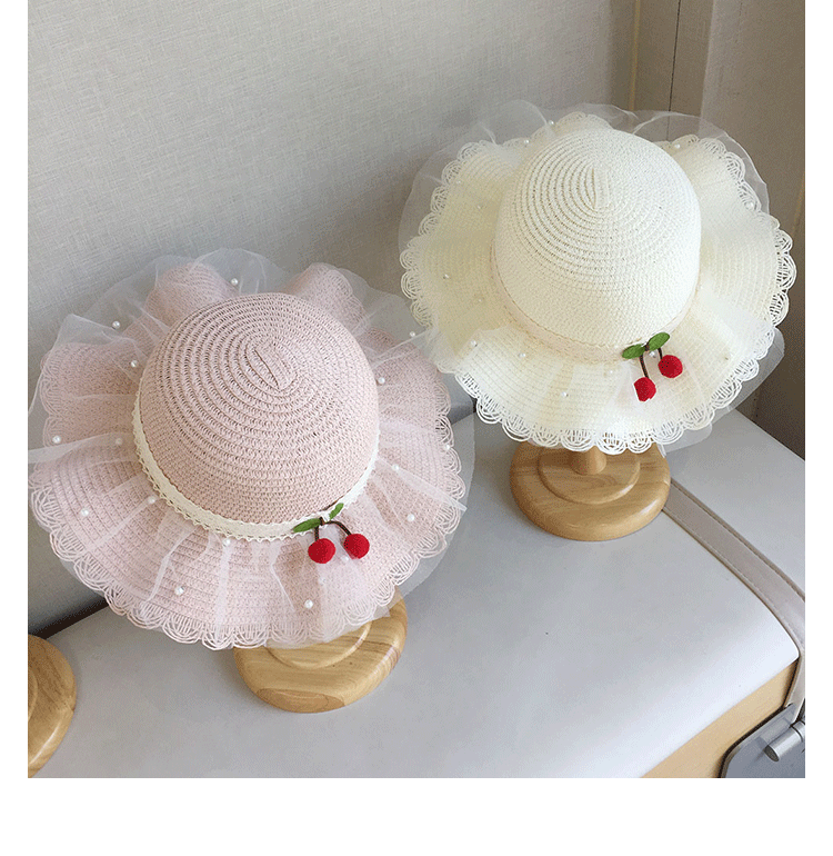 2025 여름 해변 여행 어린이 밀짚 모자 큰 챙 태양 모자 간단한 레이스 체리 밀짚 모자 제조 업체스토어 가기
