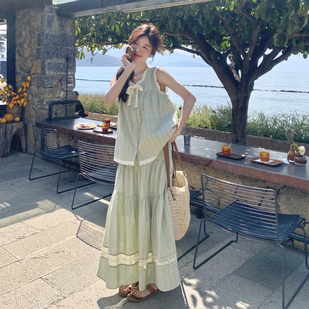 리얼 샷 2025 새로운 패션 시대 감소 작은 신선한 레이스 스티칭 스트라이프 조끼 높은 허리 탄성 스커트 세트스토어 가기
