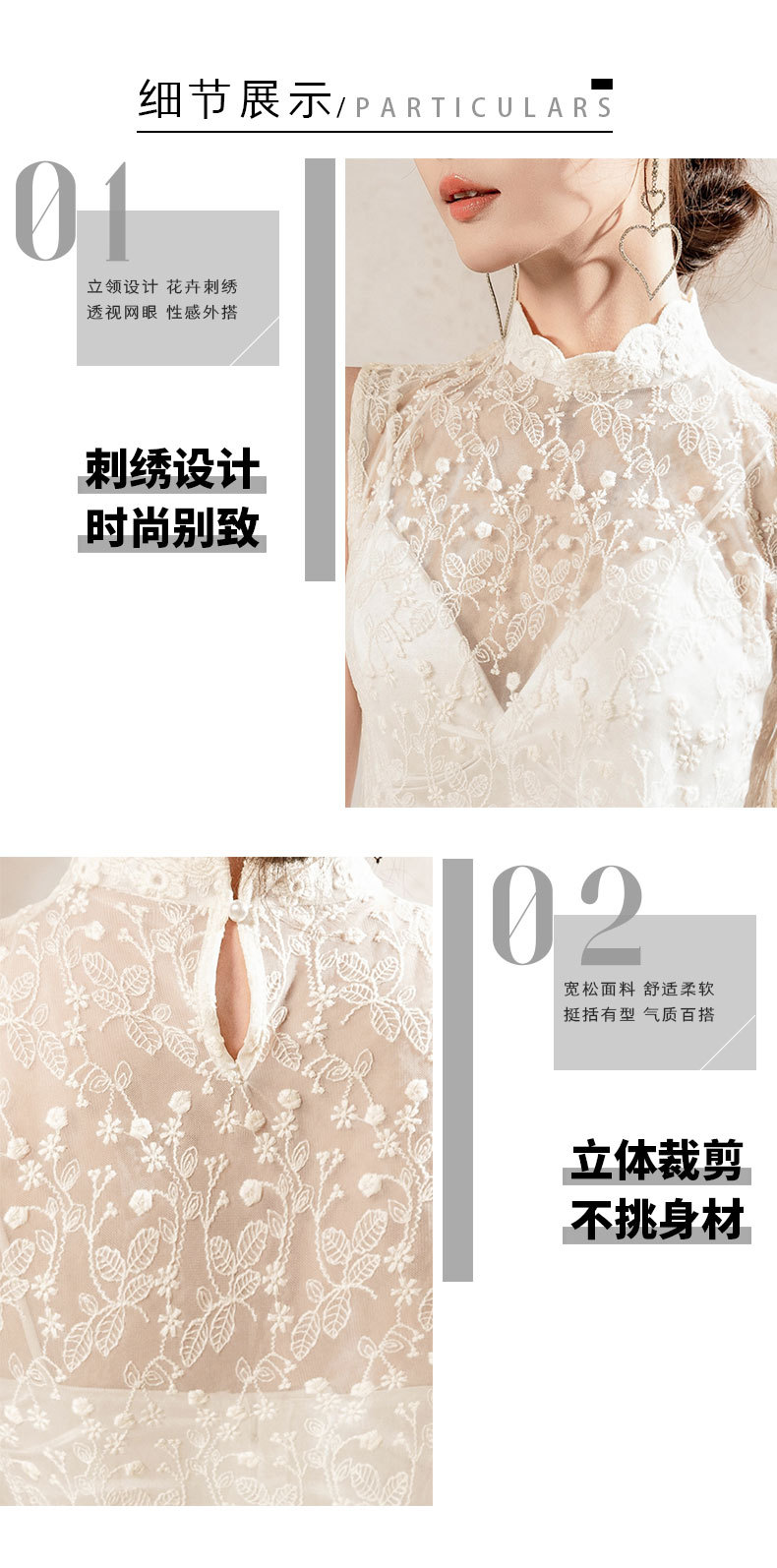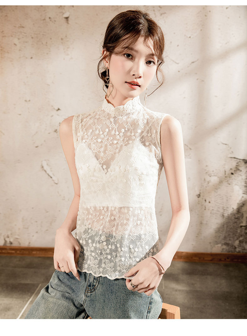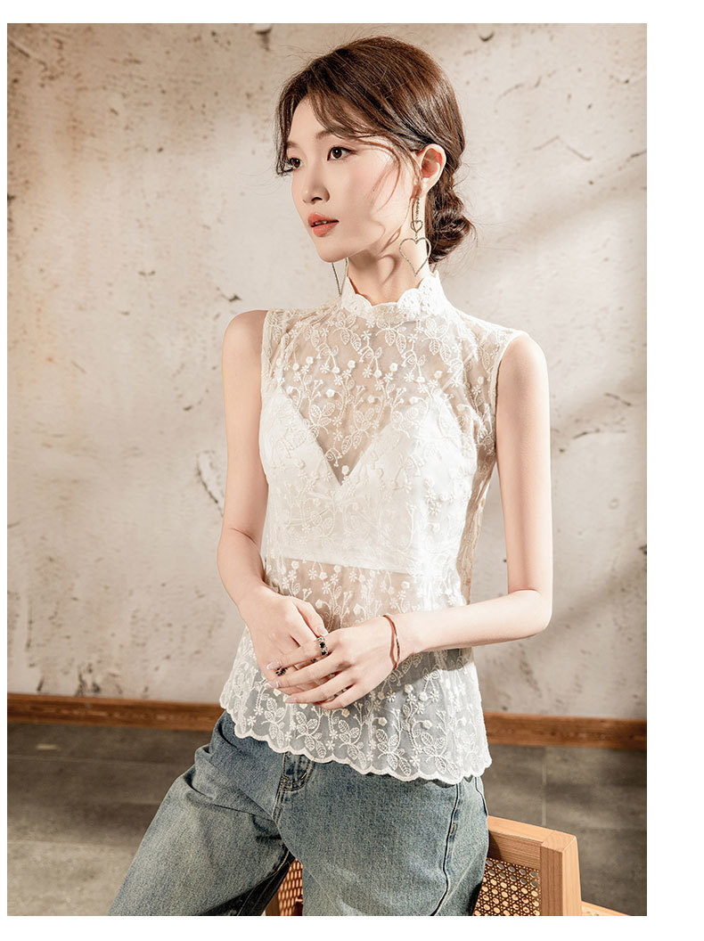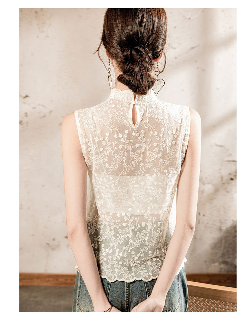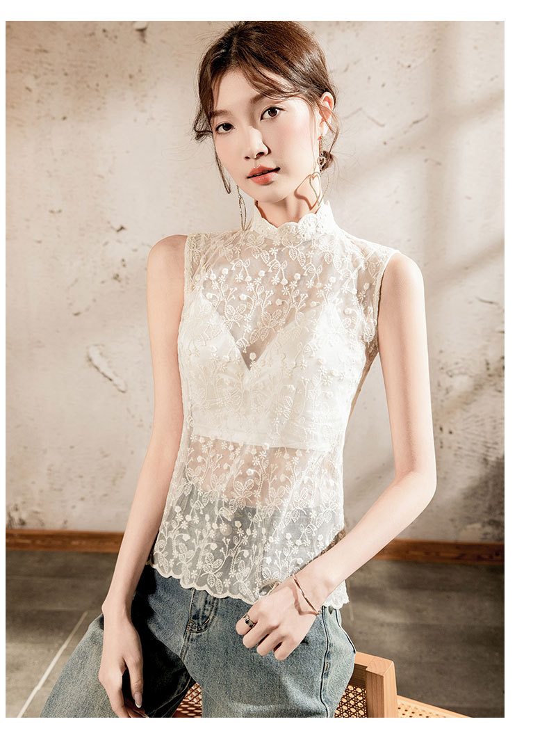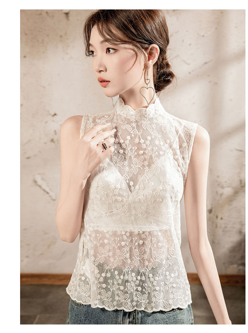스탠드 칼라 꽃 자수 느슨한 겉옷 셔츠 여성 민소매 2025 봄 여름 메쉬 관점 섹시한 여성상의스토어 가기