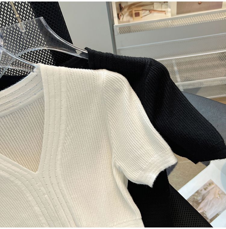 여름 새로운 V 넥 아이스 실크 니트 스웨터 여성 디자인 센스베이스 셔츠 내부 탑 티셔츠 올 매치스토어 가기