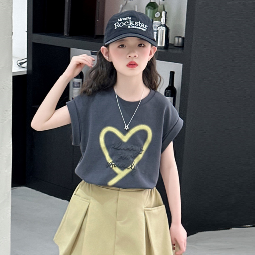 소녀 반팔 세트 2025 년 여름 새로운 어린이 사랑 티셔츠 소녀 스커트 여름 캐주얼 착용