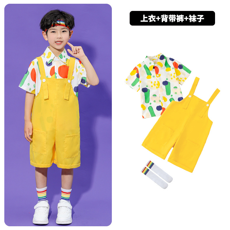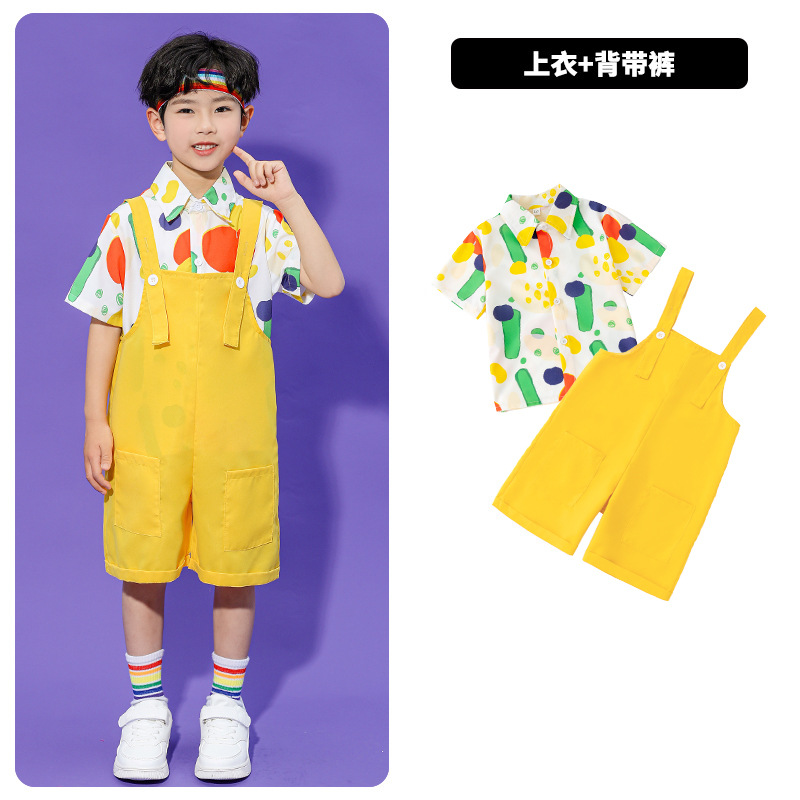 • 서스펜더 반바지 정장 [빨간색과 녹색 반팔 셔츠 + 밝은 노란색 서스펜더 반바지]