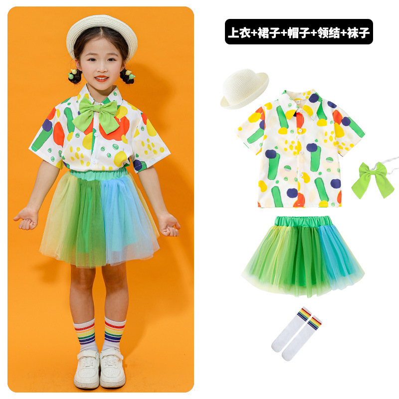 • 짧은 치마 정장 + 흰색 밀짚모자 + 밝은 녹색 리본 + 무지개 양말