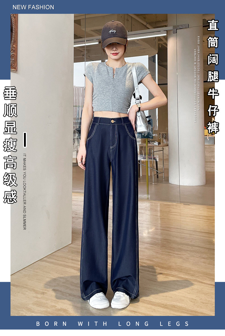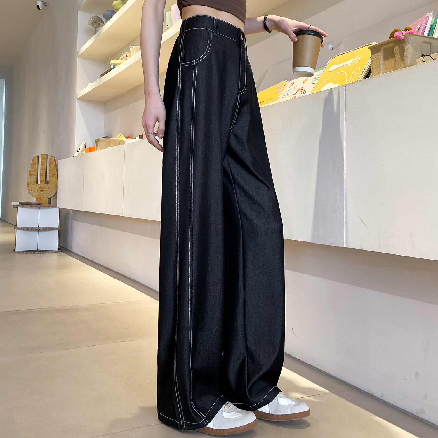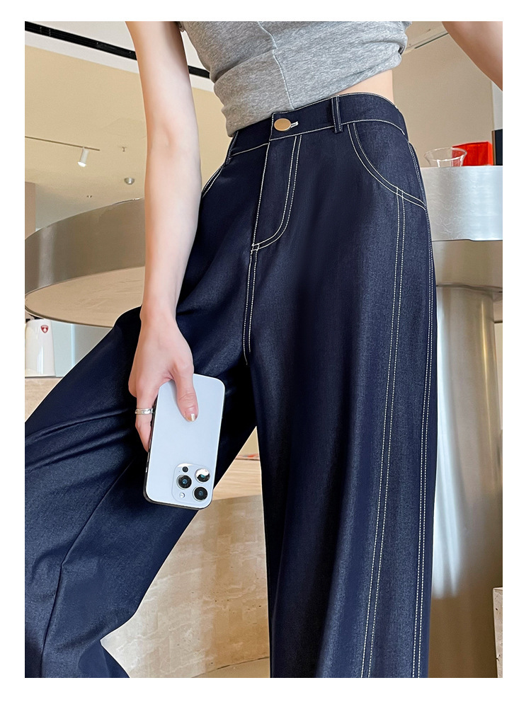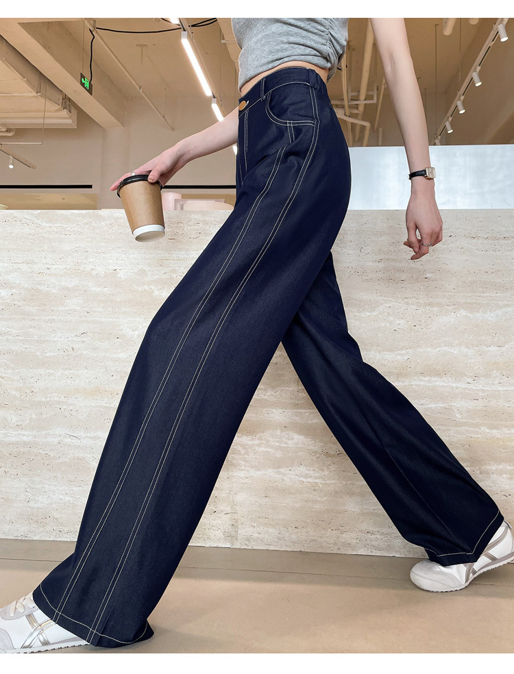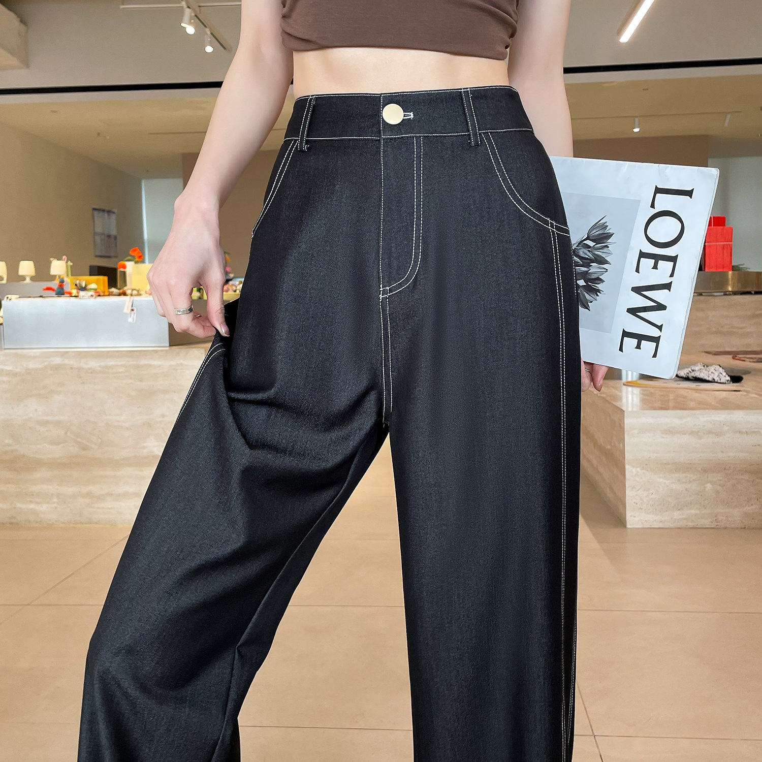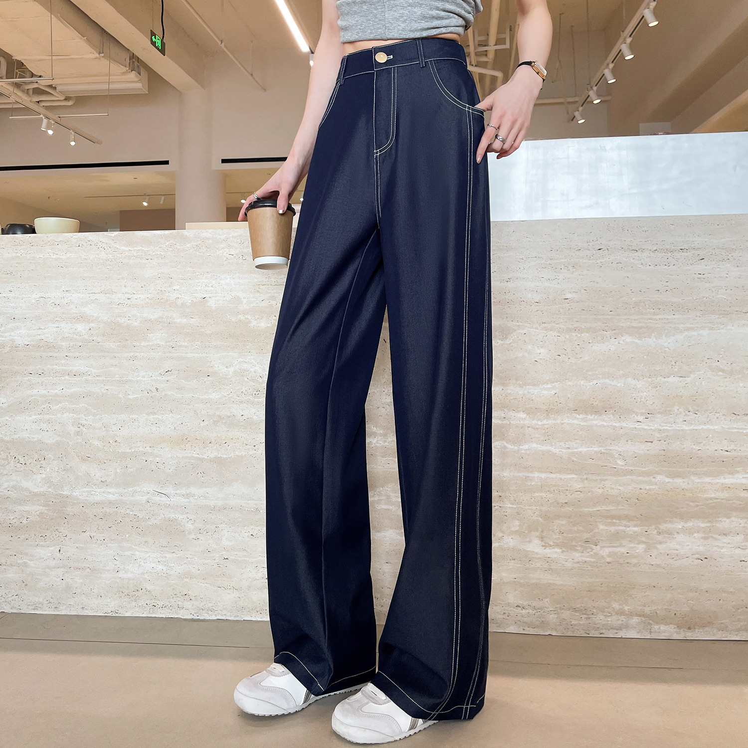 다크 블루 텐셀 소프트 청바지 여자 2025 여름 얇은 아이스 실크 와이드 다리 바지 좁은 캐주얼 스트레이트 바지스토어 가기