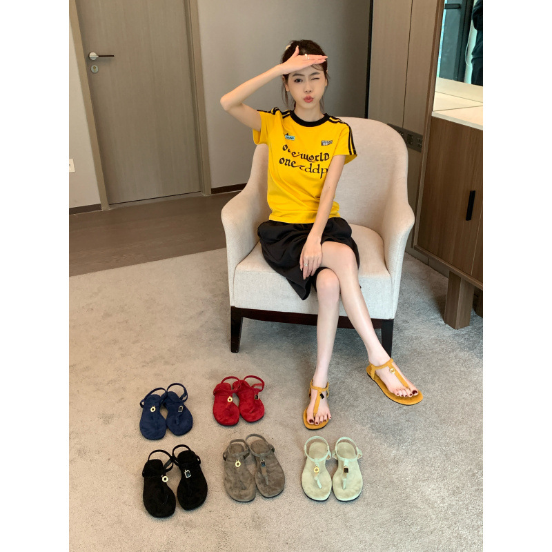 플랫 바닥 복고풍 노란색 플립 플롭 프렌치 샌들 요정 신발 2025 새로운 여름 스커트와 검은 색 로마 신발스토어 가기
