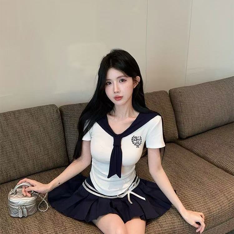 대학 스타일 해군 칼라 자수 티셔츠 세트 여성 여름 높은 허리 주름 치마 우아한 나이 감소 반팔 탑