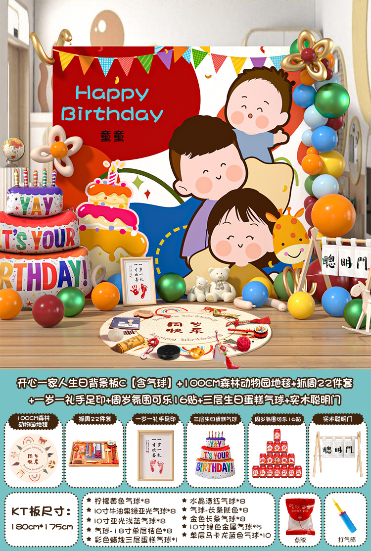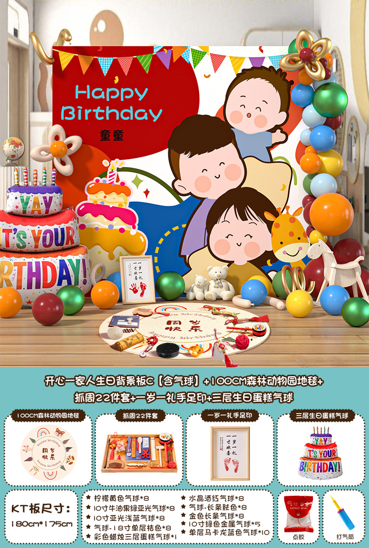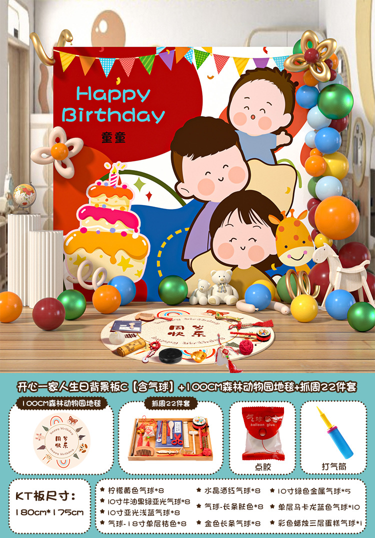 • [3인가족] 해피패밀리 생일 배경판 C [풍선포함] + 100CM 삼림동물원 카펫 + 22종세트