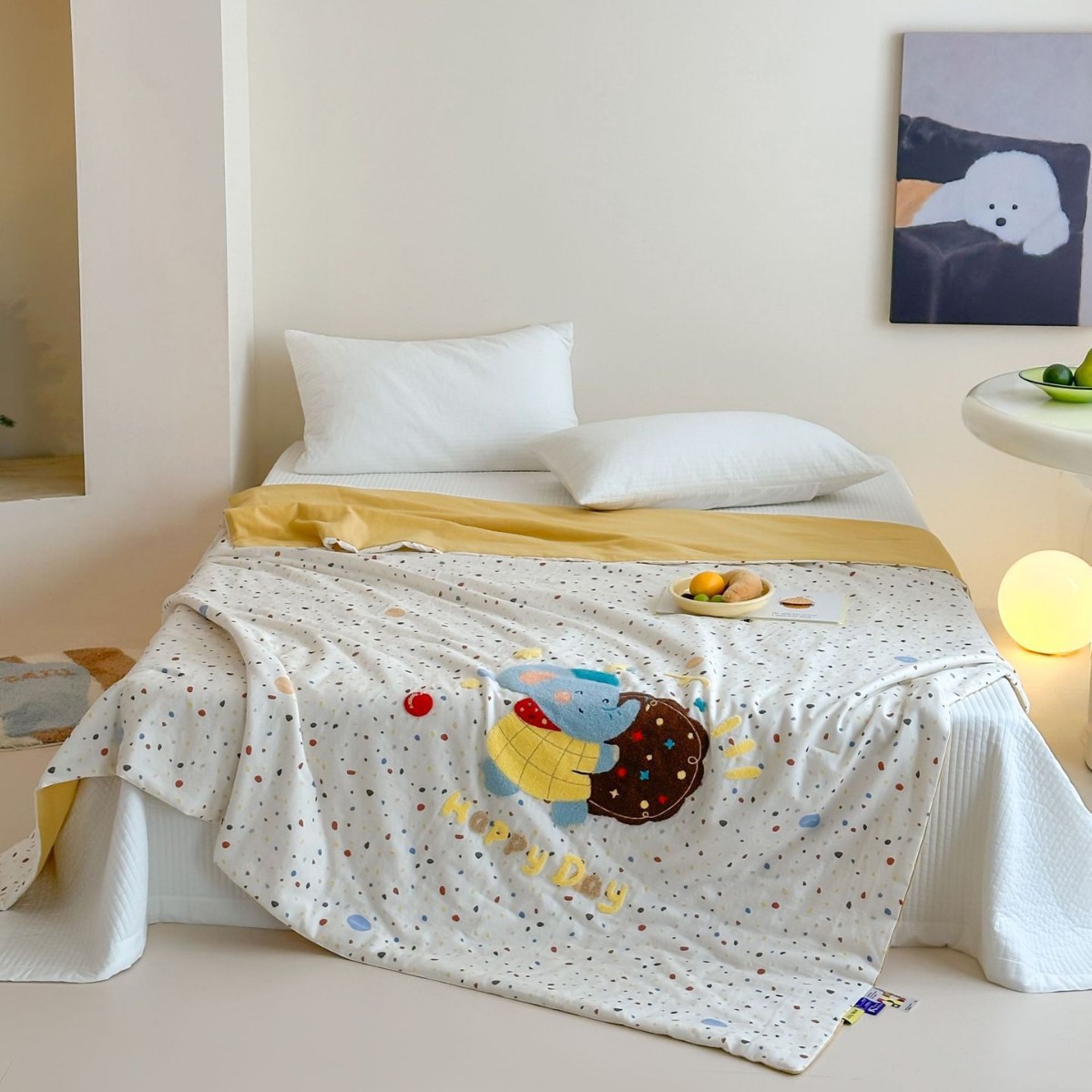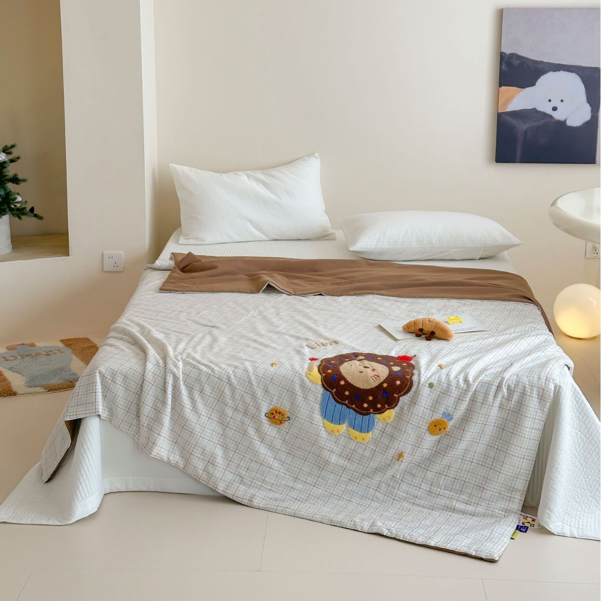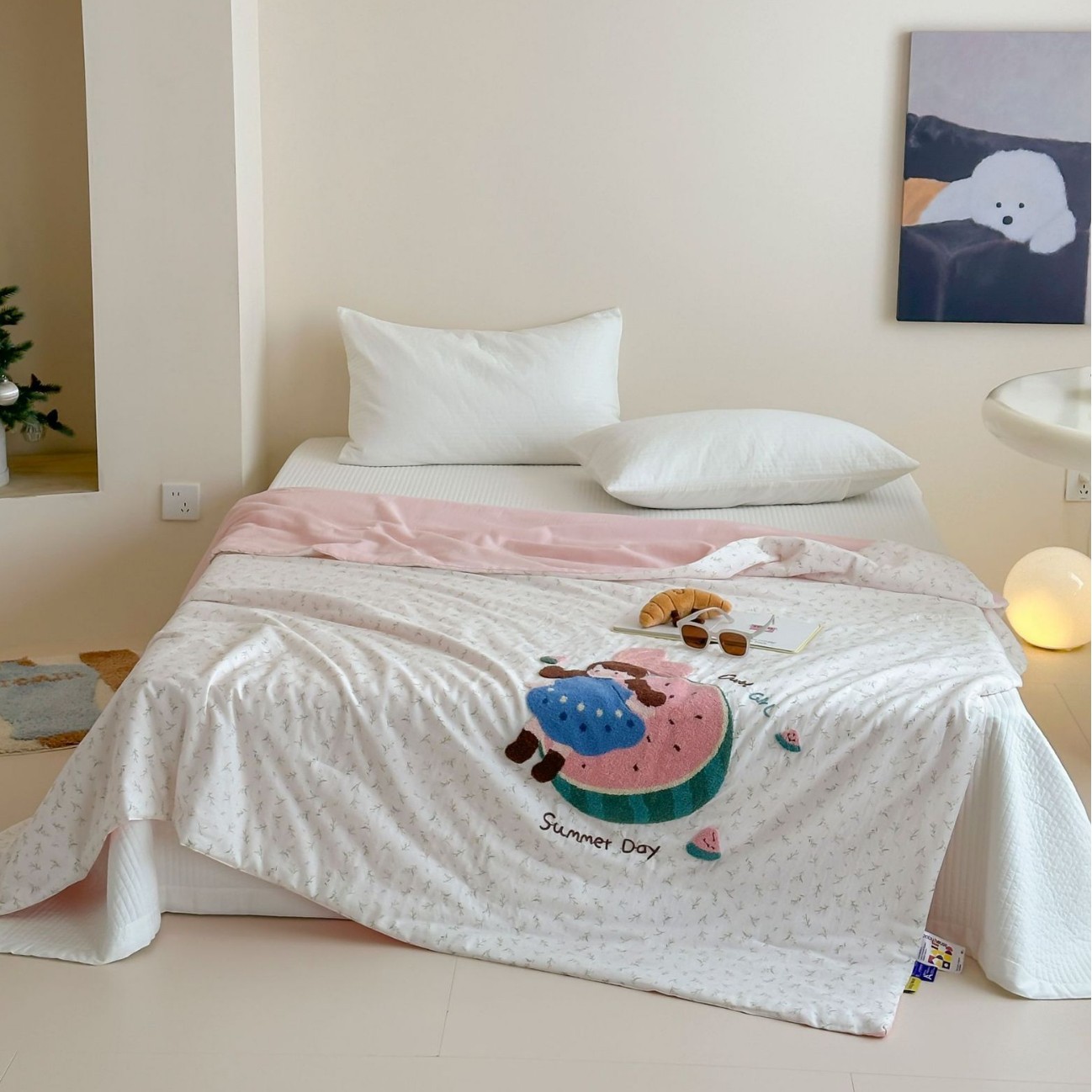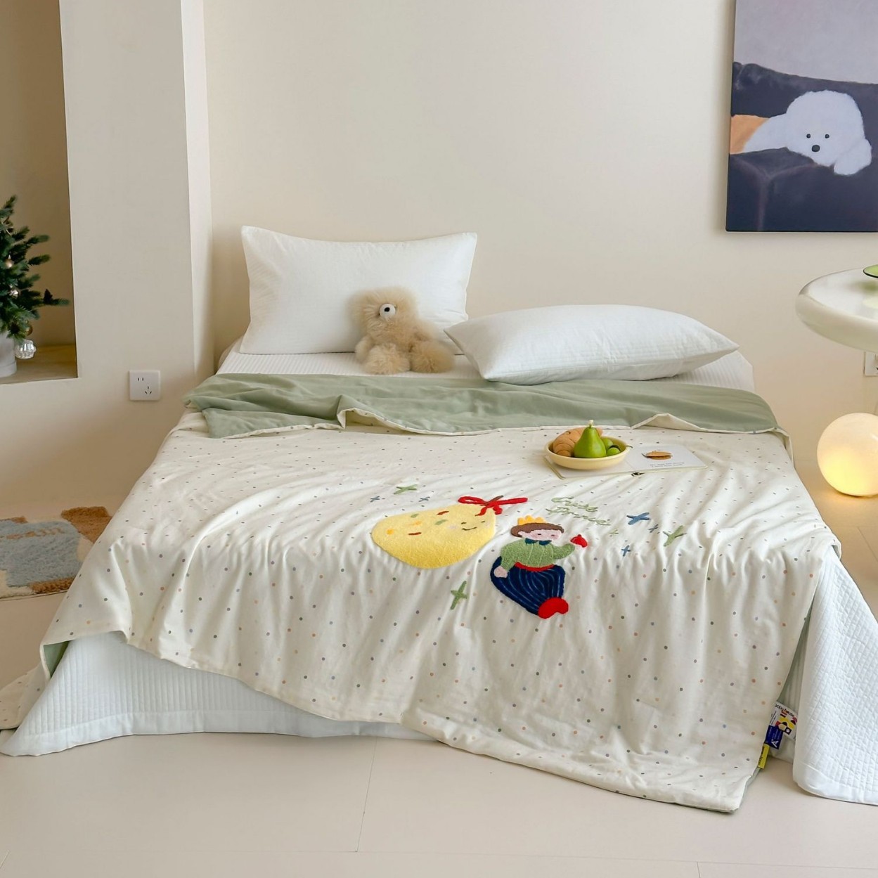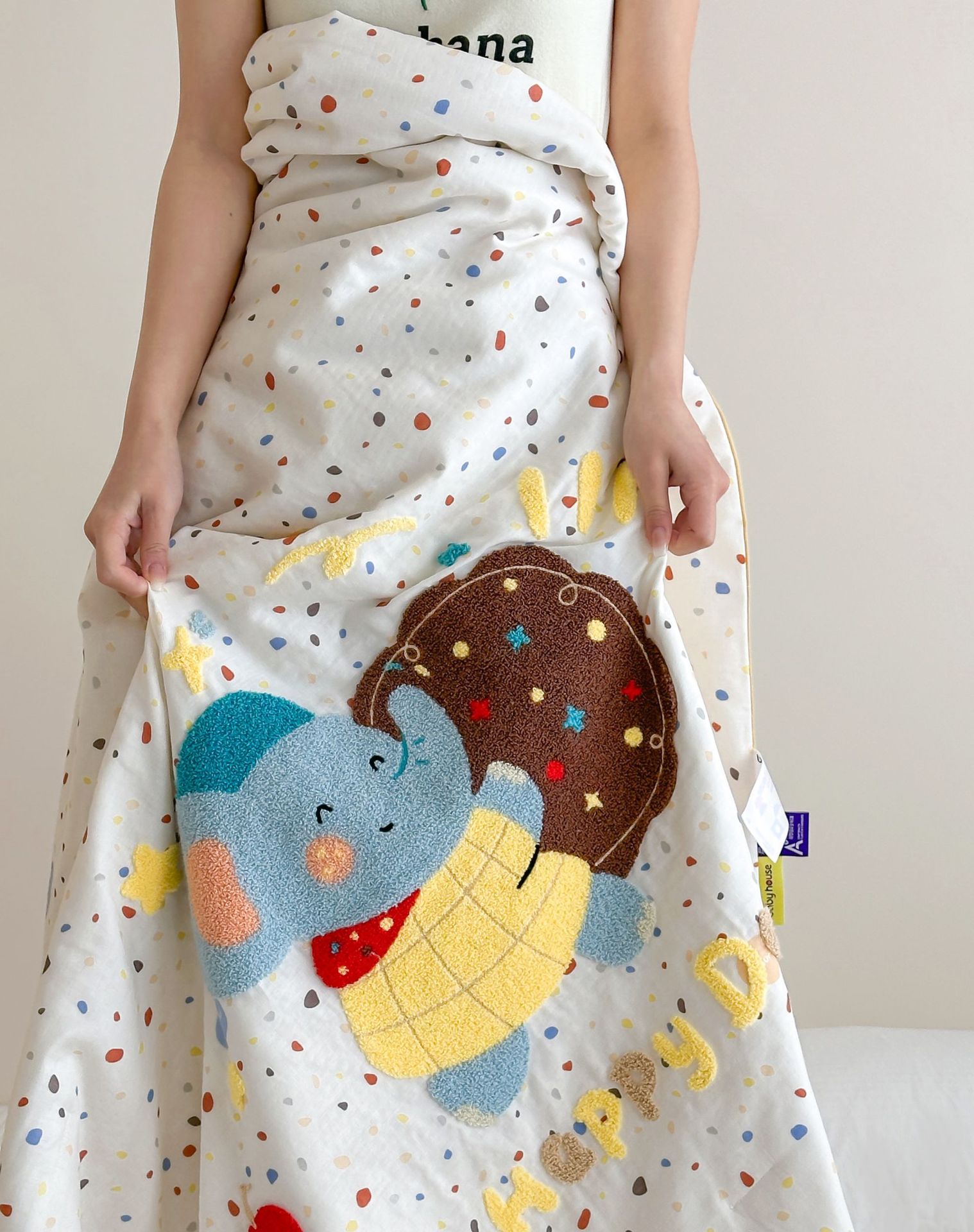 糖果被芯系列将精湛的毛巾绣工艺发挥得淋漓尽致。绣针如灵动画笔,在被芯表面精心勾勒出梦幻梨王子、甜心女孩、甜甜圈小狮、俏皮小