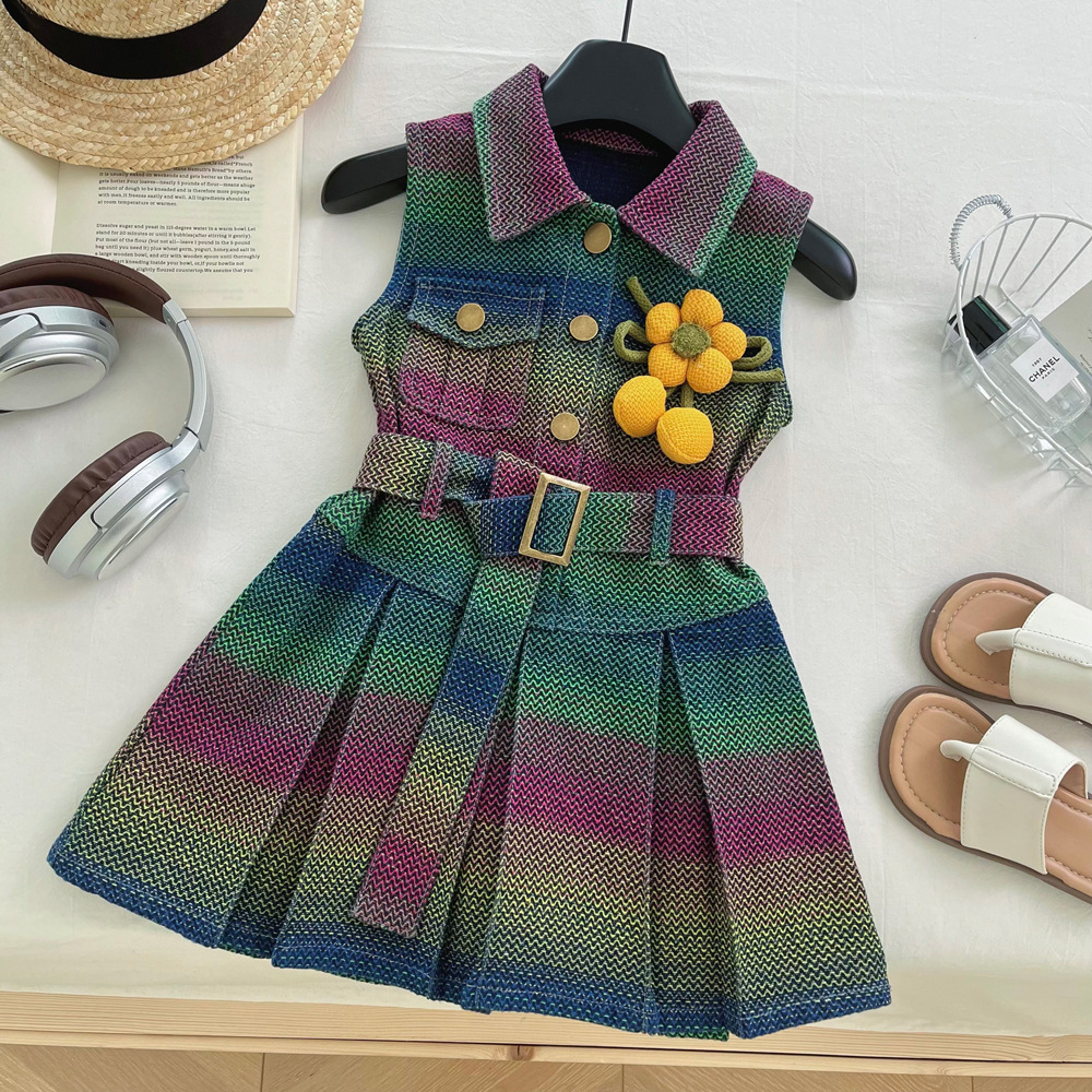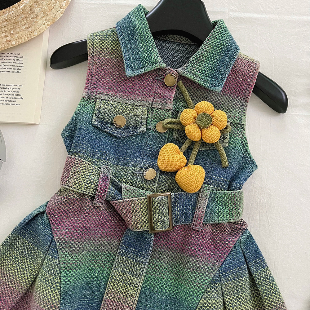 어린이의 새로운 여름 아기 소녀의 세련되고 다채로운 데님 얇은 드레스 그라데이션 폴로 칼라 조끼 드레스