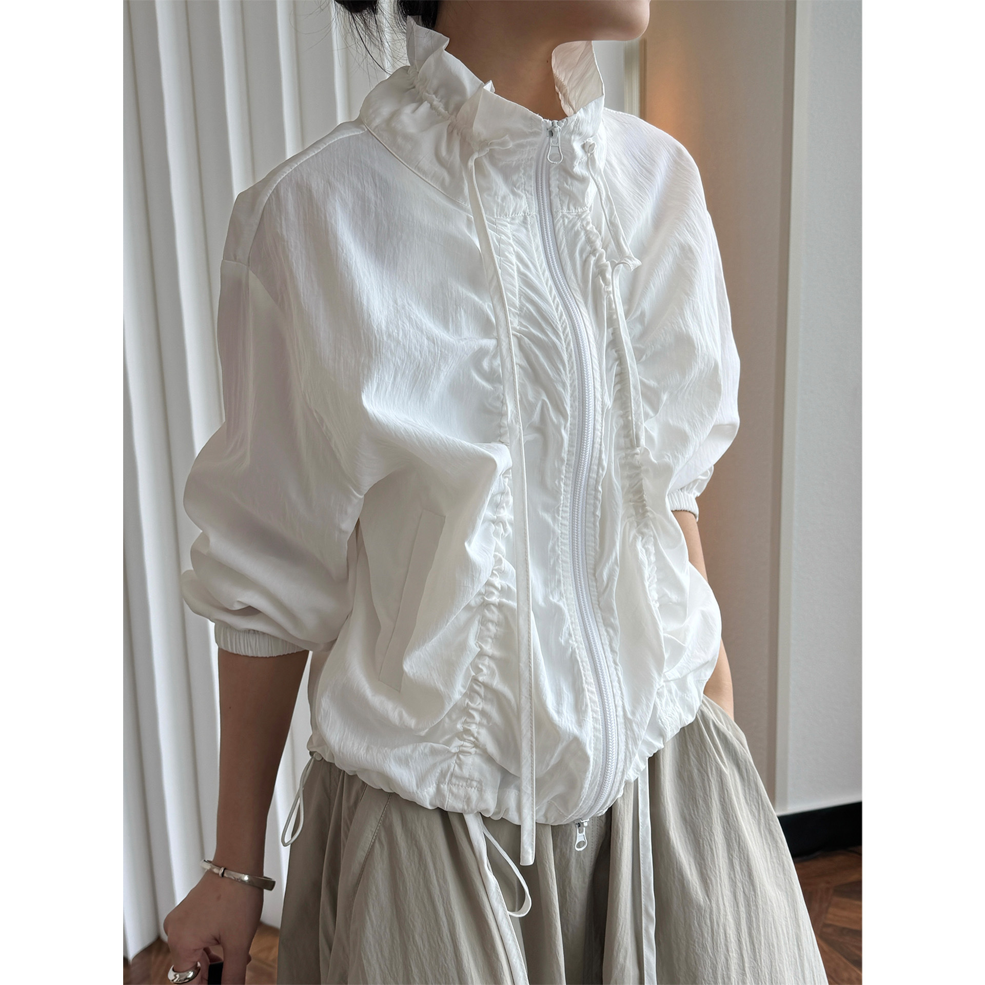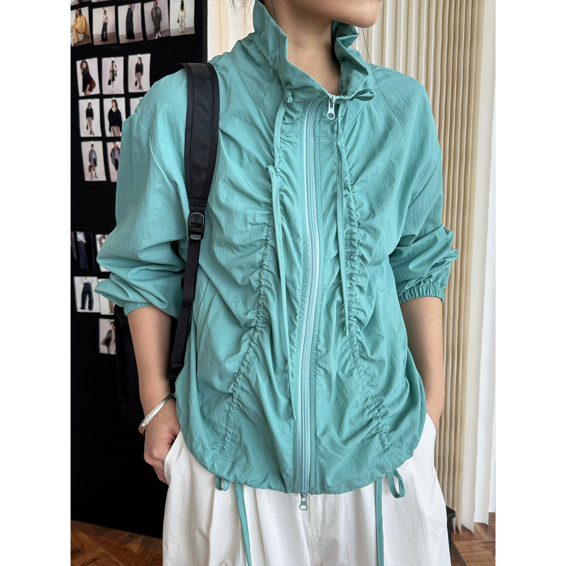 봄 새로운 한국어 INS 디자인 사이드 드로스트링 주름 자외선 차단제 재킷 여성을위한 가볍고 통기성 재킷