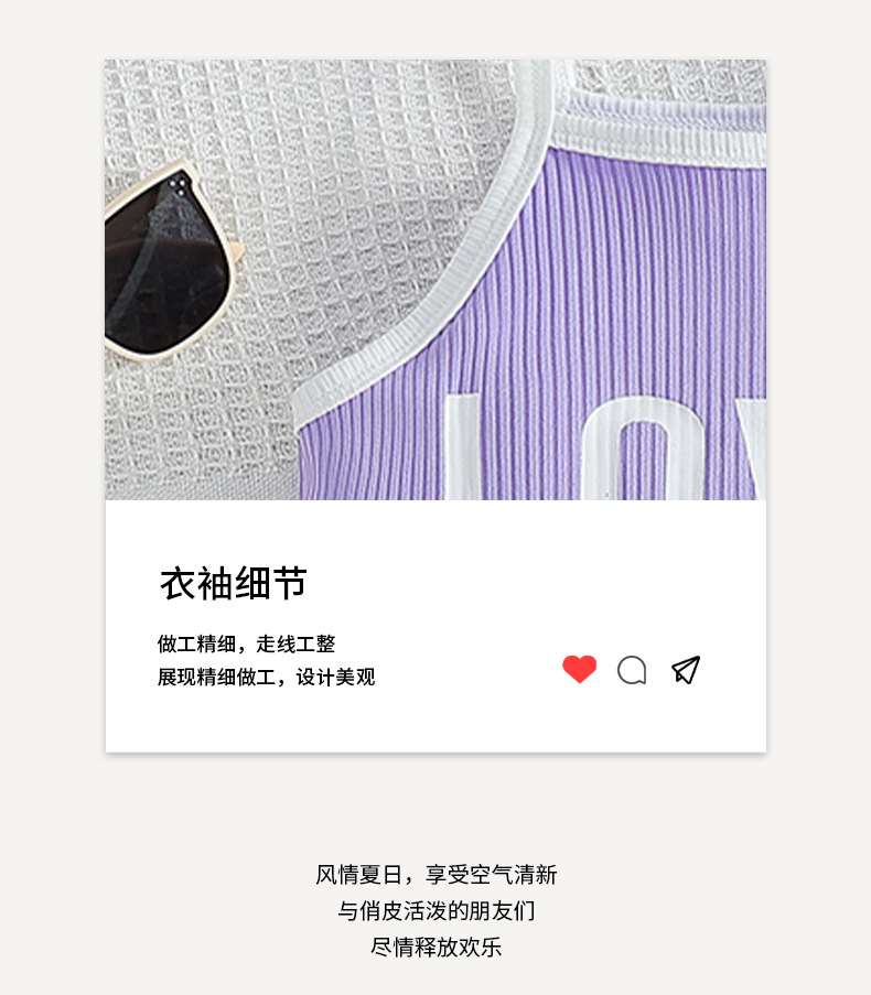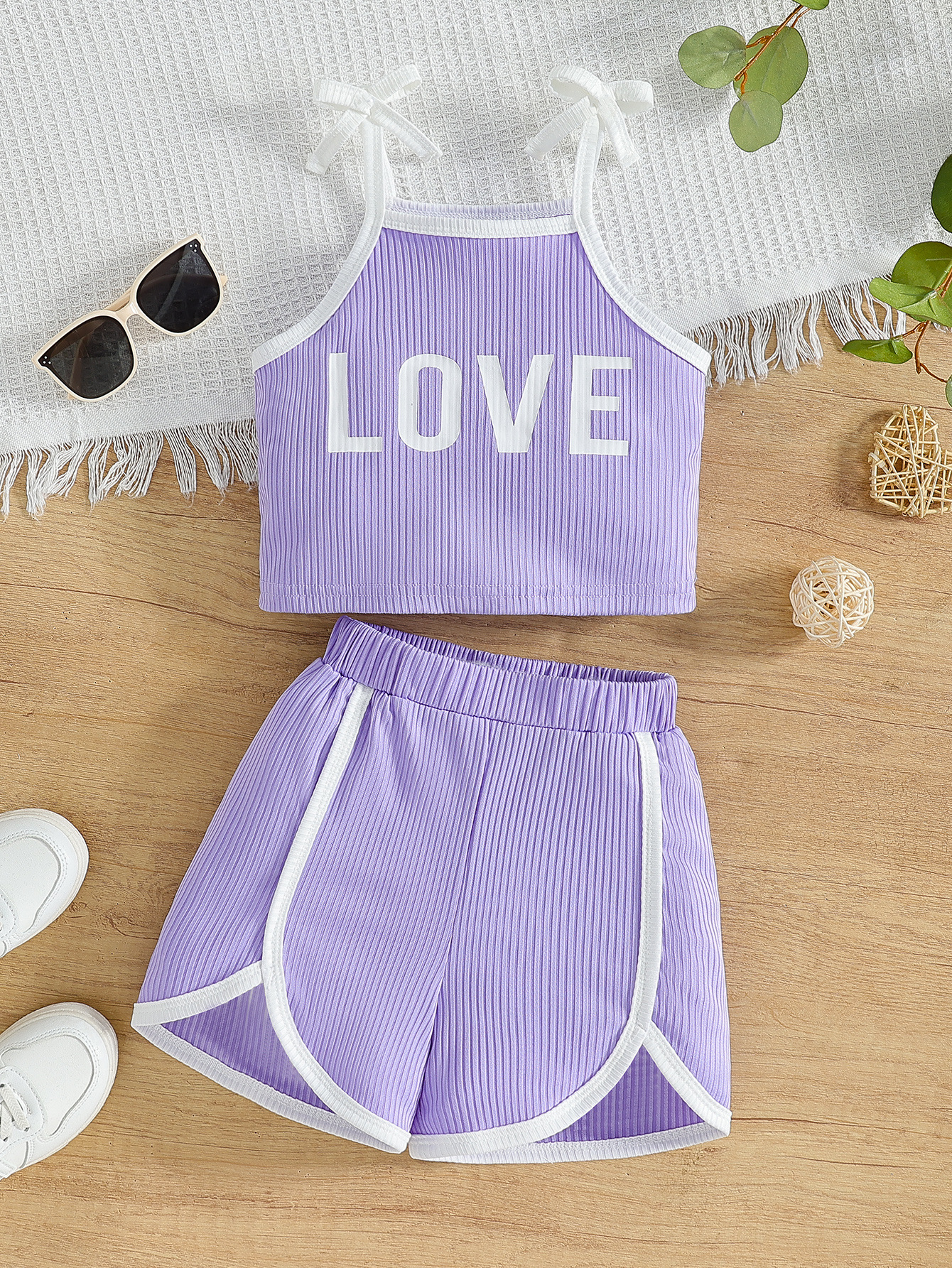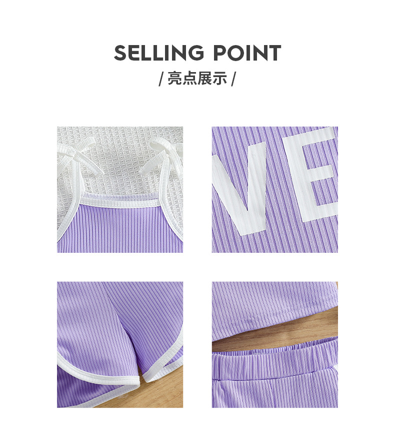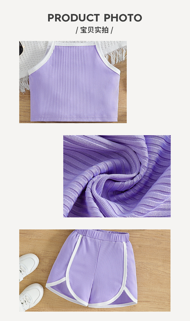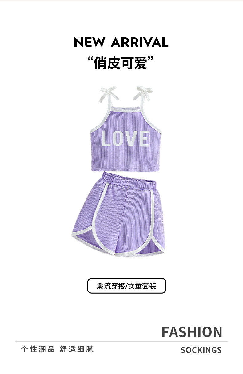여름 어린이 슬링 세트 세로 줄무늬 보라색 문자 스포츠 스타일 소녀 아기 솔리드 컬러 반바지 투피스 세트