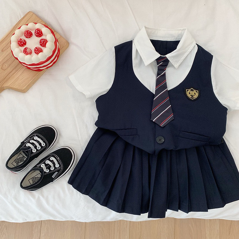 한국 아동복 여름 어린이 대학 스타일 가짜 2 피스 세트 소년 소녀 유행 반팔 셔츠 아기 바지 세트