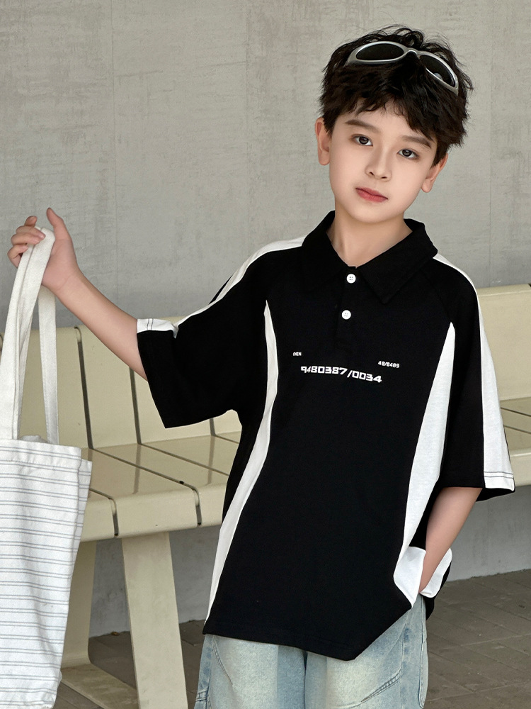 소년 반팔 2025 여름 새로운 한국 스타일 아동 의류 대비 색상 접합 얇은 옷깃 폴로 셔츠 반팔 탑