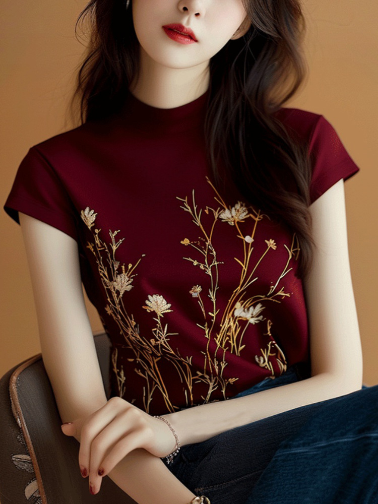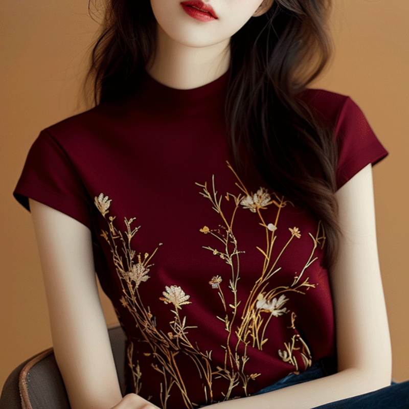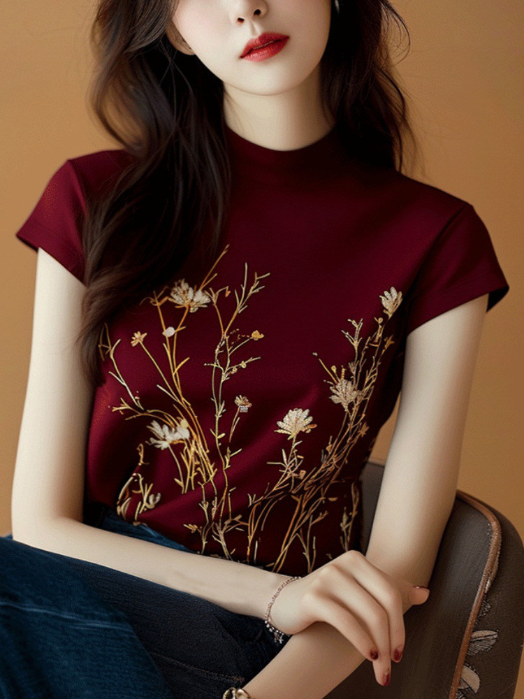 세련된 우아하고 아름다운 버건디 인쇄 된 반쪽 터틀넥 반팔 티셔츠 여성용 여름 우아한 나이 감소 잘 생긴 탑