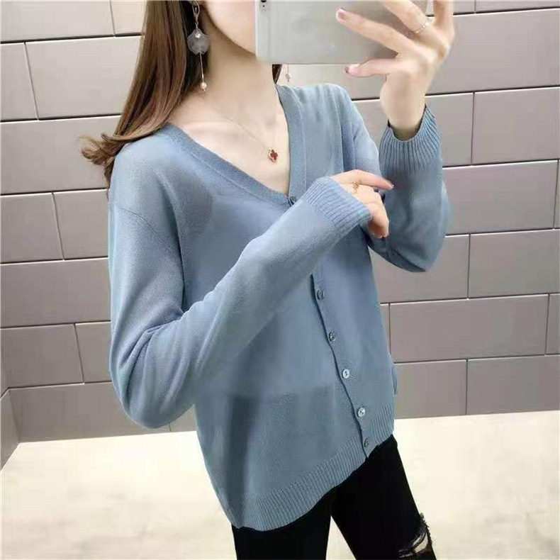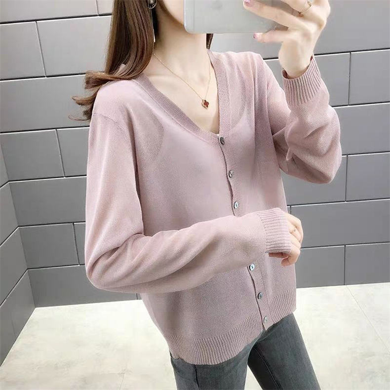 봄과 여름 긴 소매 얇은 느슨한 선 스크린 탑 유행 세련된 단색 간단한 V 넥 아이스 실크 니트 스웨터스토어 가기