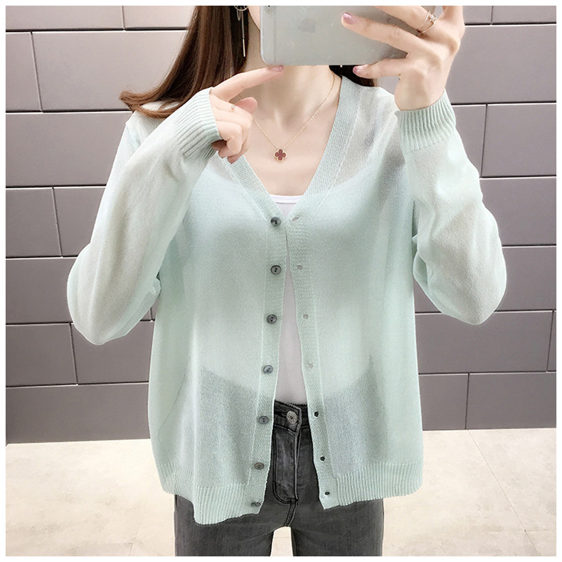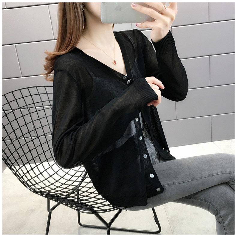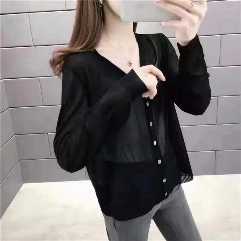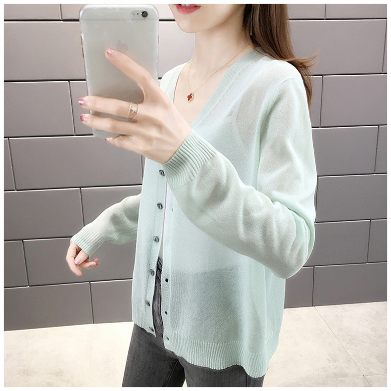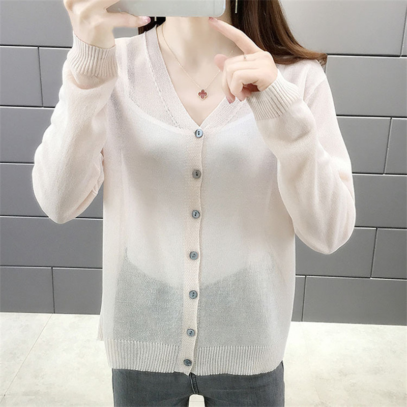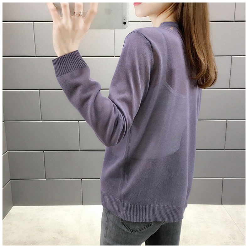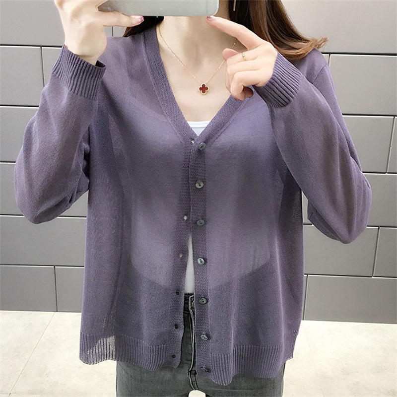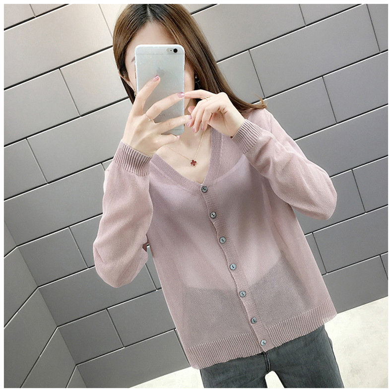 봄과 여름 긴 소매 얇은 느슨한 선 스크린 탑 유행 세련된 단색 간단한 V 넥 아이스 실크 니트 스웨터