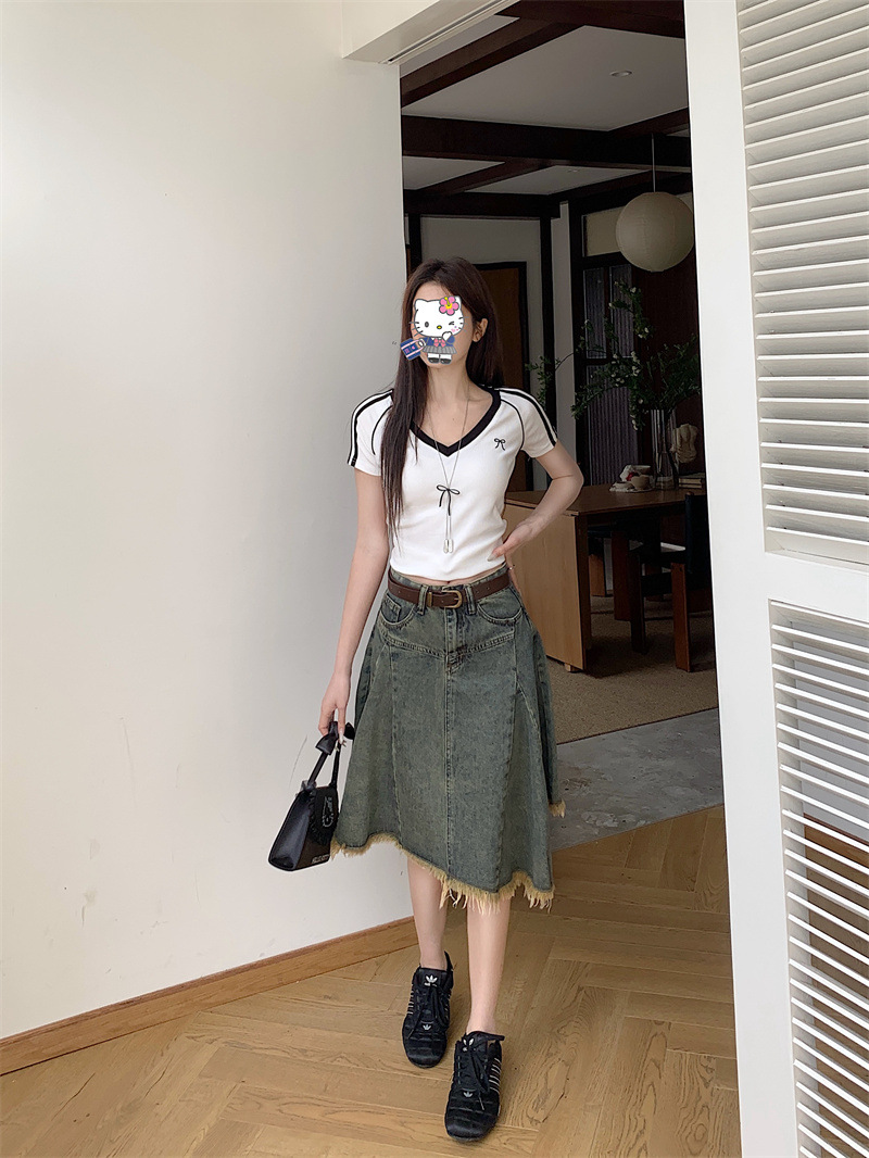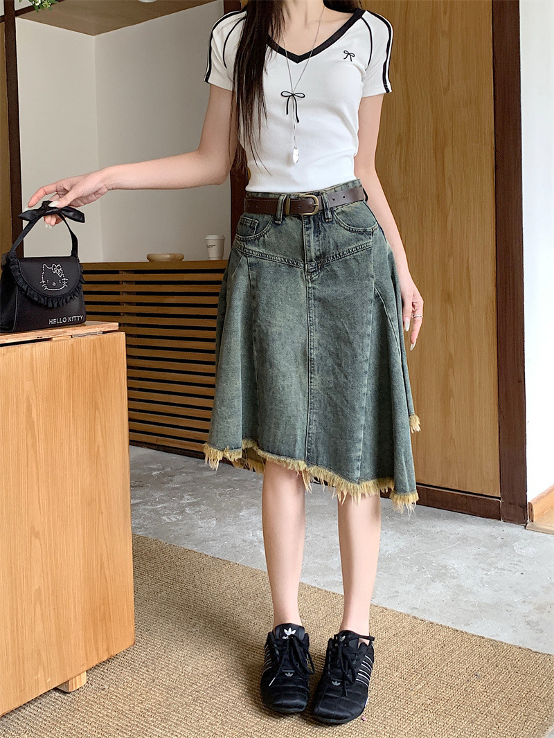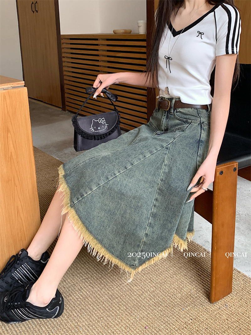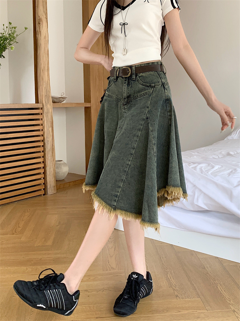 2025 뉴 코리안 hcic 디자인 불규칙 패션 스플라이싱 기질 데님 스커트 하이웨이스트 미드기장 스커트
