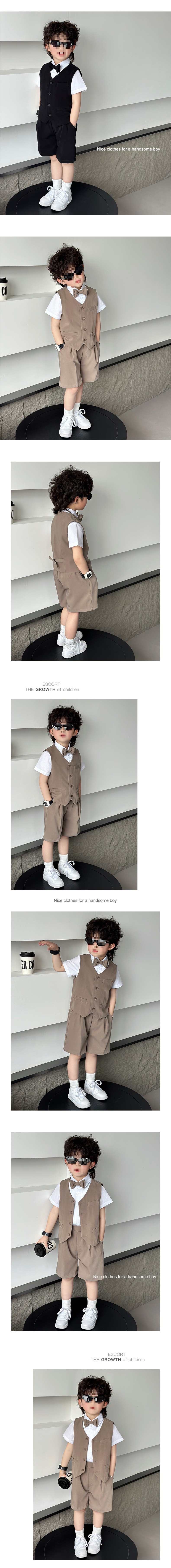 • 그레이 (조끼 + 화이트 플리츠 반팔 셔츠 + 반바지 + 그레이 더블 보타이)