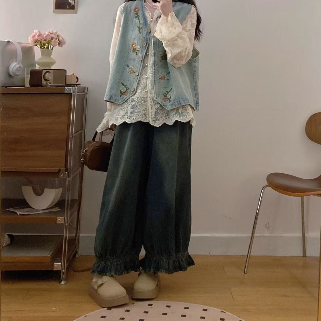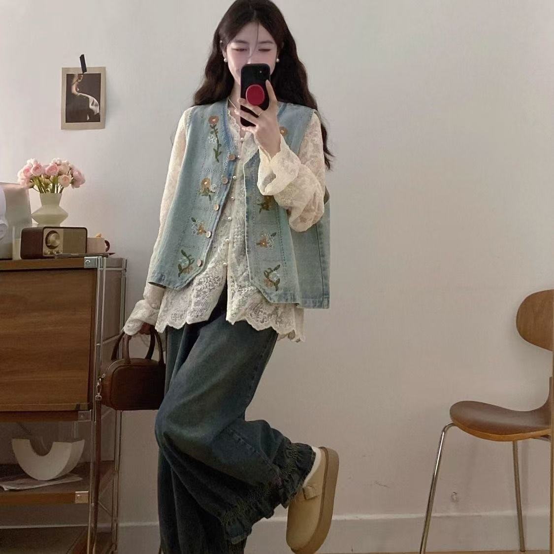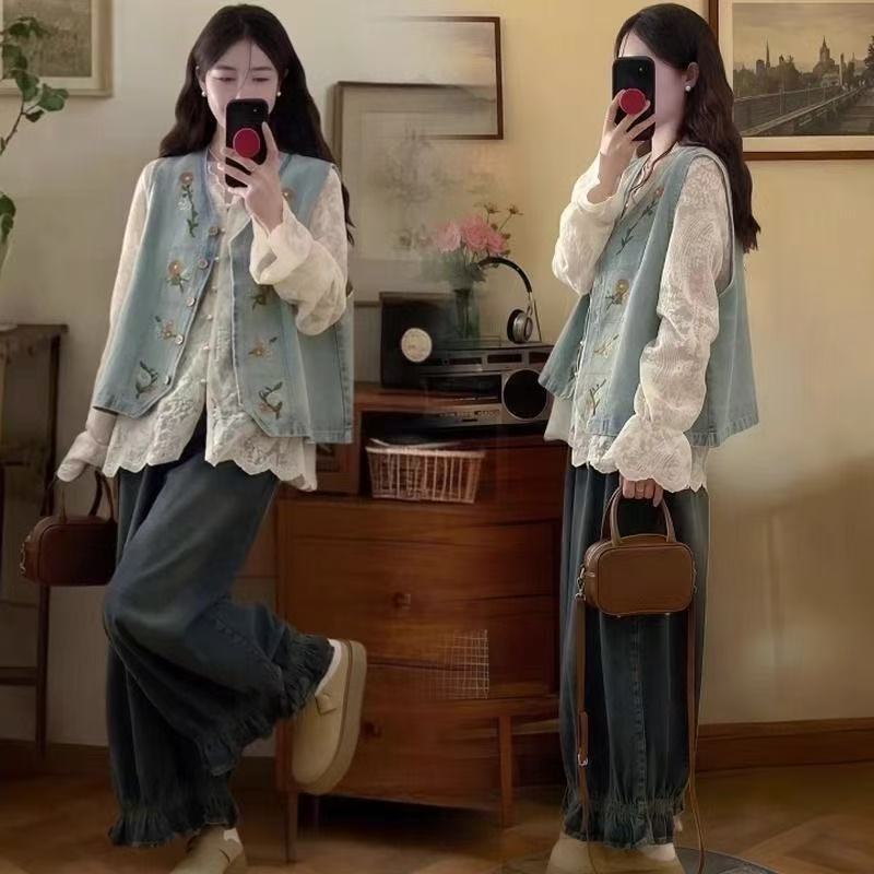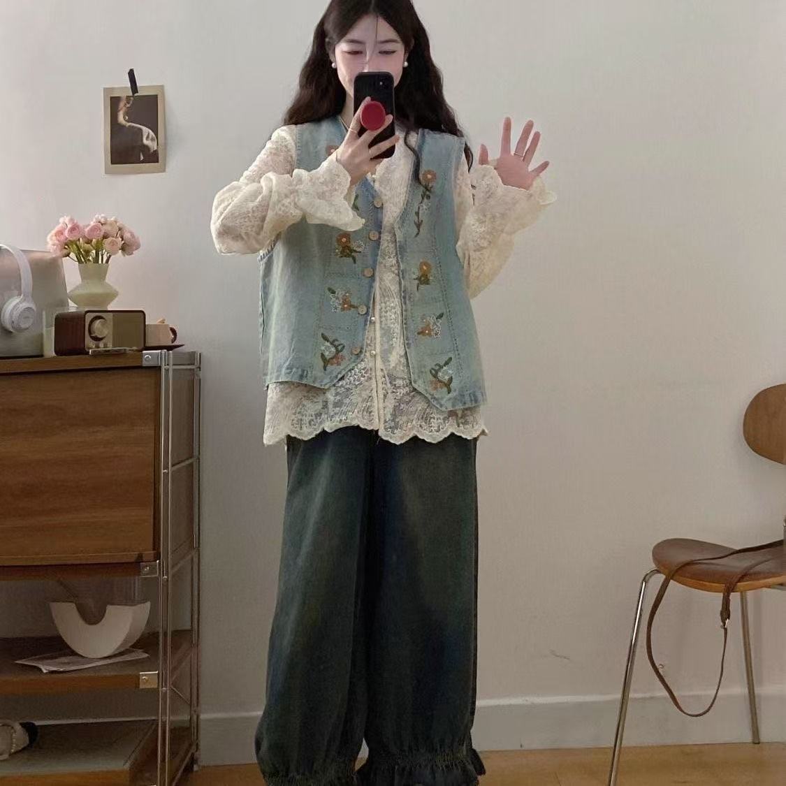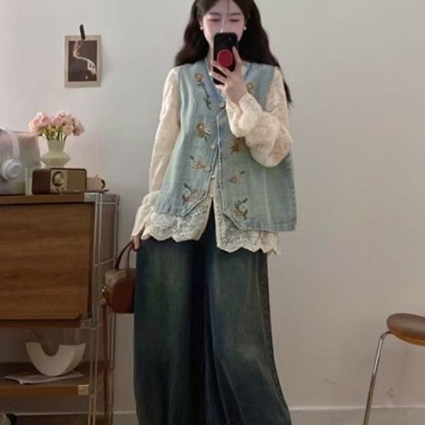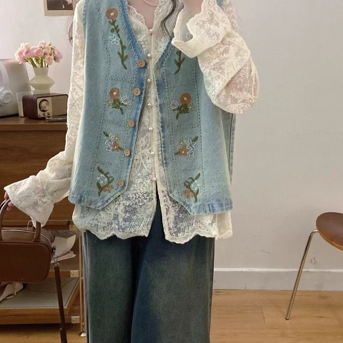 빅사이즈 솔트 스타일 의상 2026년 신상 봄 자수 데님 조끼 여성 캐주얼 탑 슈퍼 예쁘고 날씬해 보이고 달콤해 보인다스토어 가기