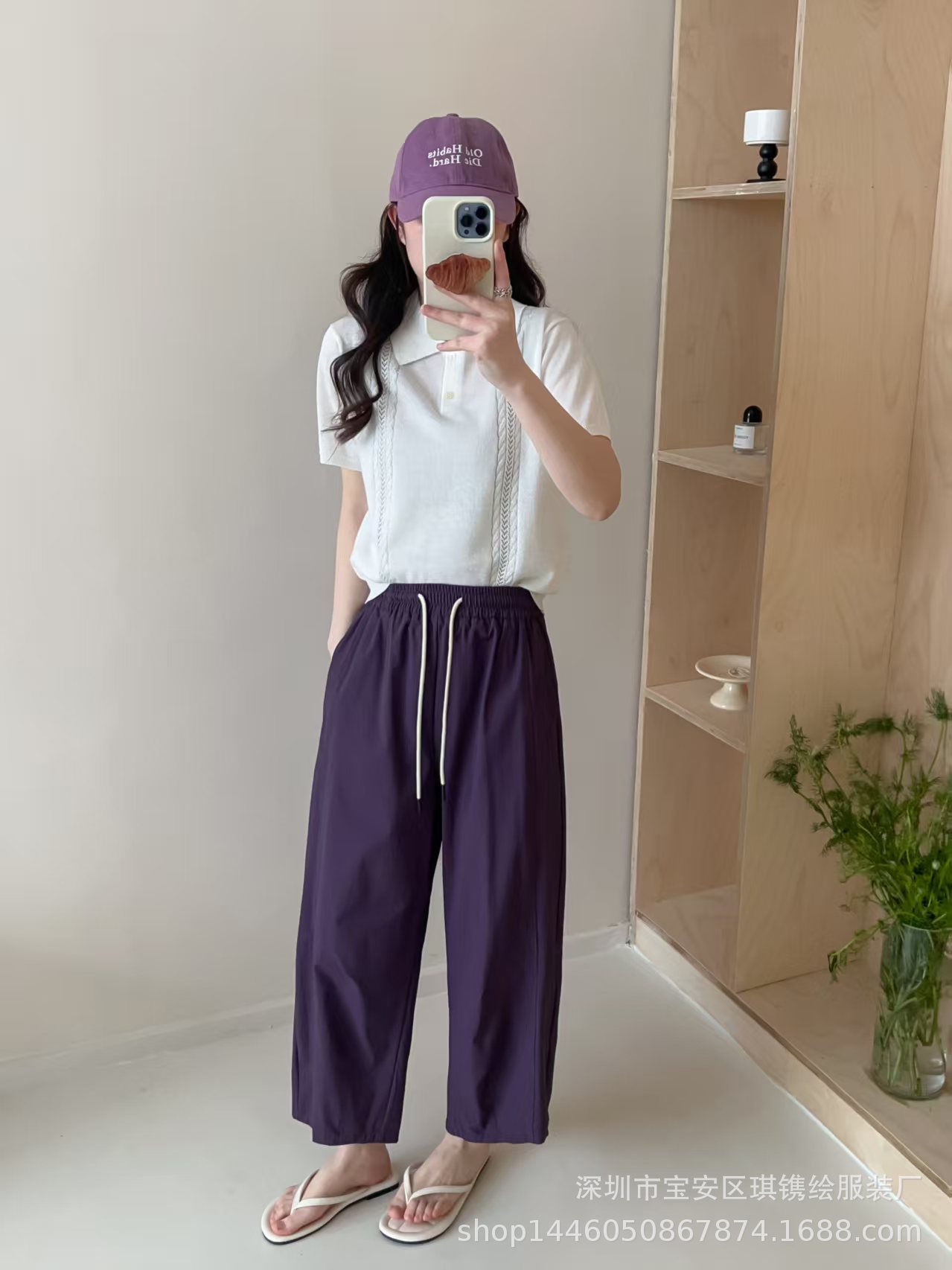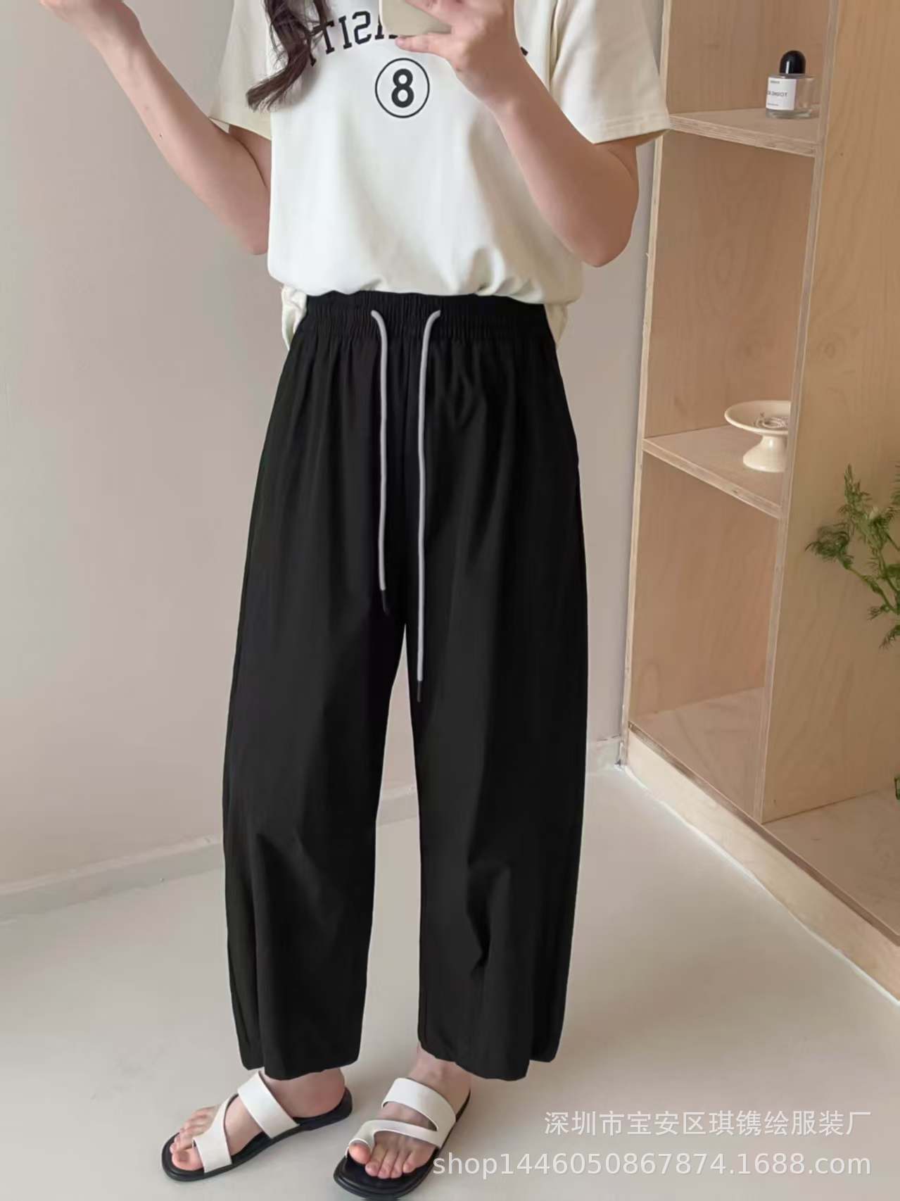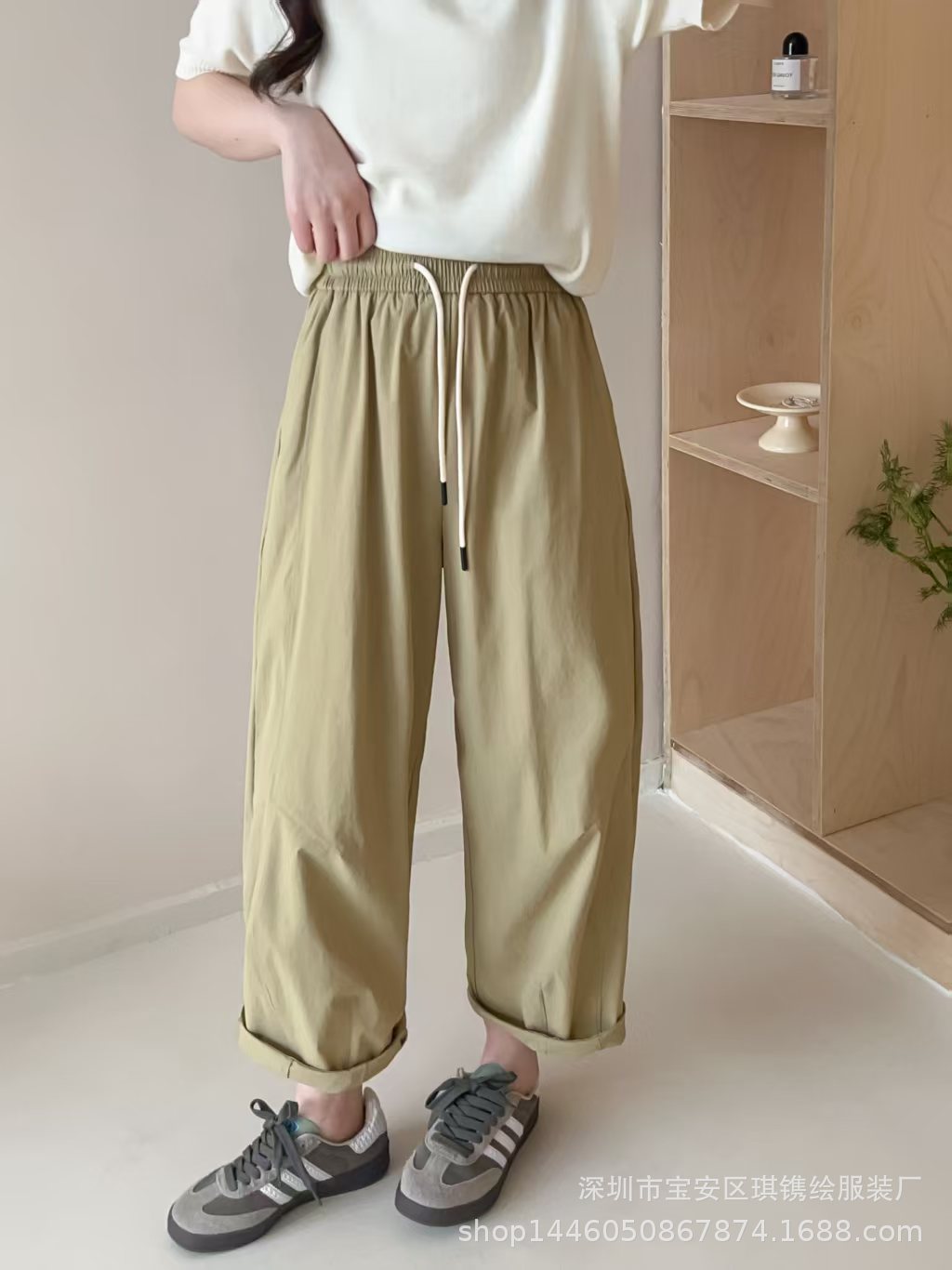 Qi 새겨진 그림 캐주얼 올 매치 솔리드 컬러 탄성 허리 끈 Harlan 바지 여자 여름 새로운 느슨한 슬리밍 바지스토어 가기