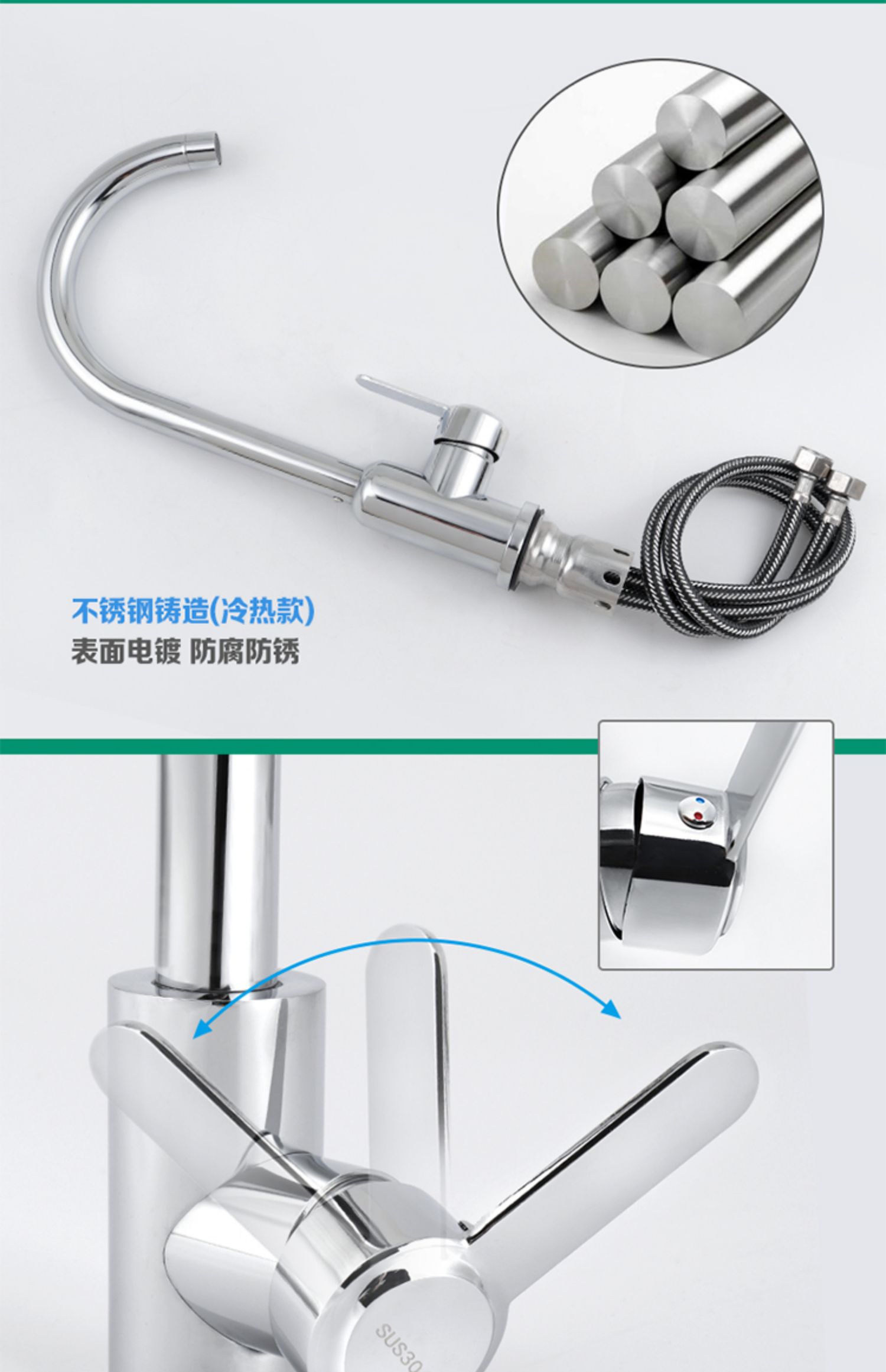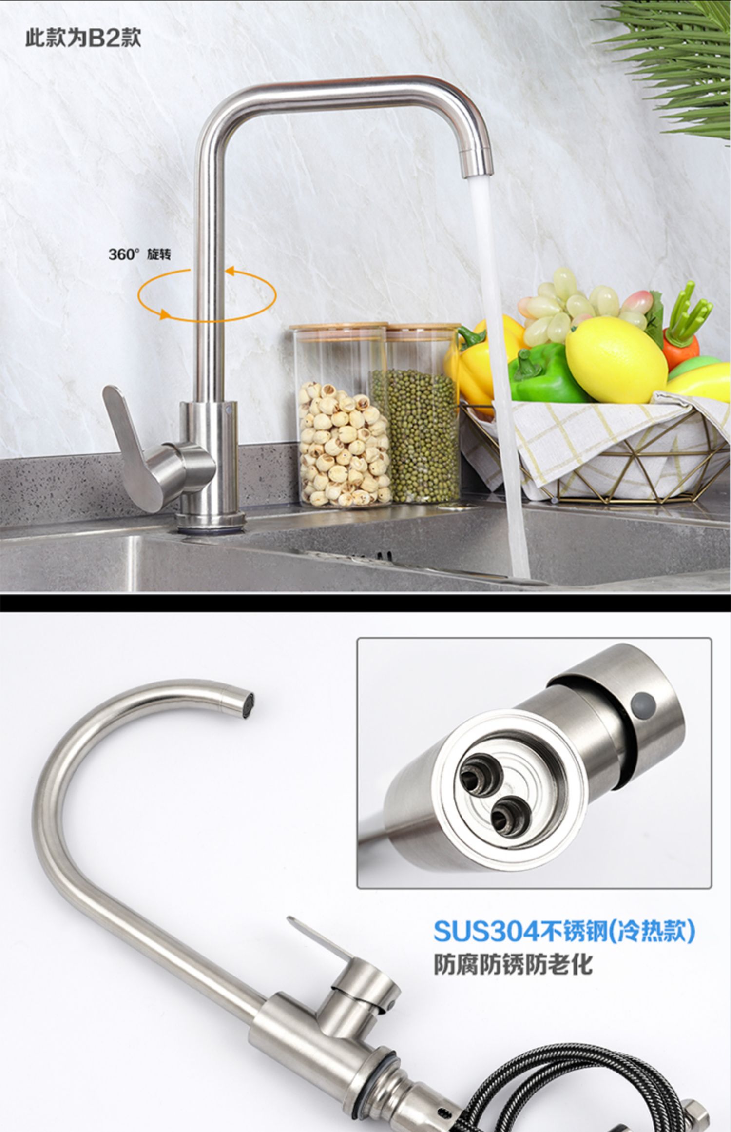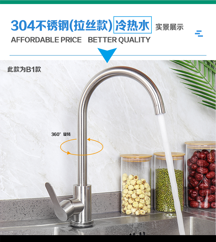 ✅주방 야채 분지 뜨겁고 차가운 수도꼭지 304 스테인레스 스틸 식기 세척 싱크대 단일 콜드 싱크 수도꼭지 회전 굴곡