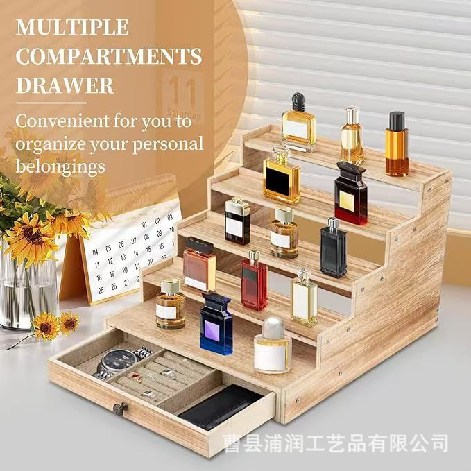 서랍이있는 맞춤형 목재 다층 스토리지 랙 데스크탑 화장품 스토리지 랙 단단한 나무 향수 에센셜 오일 디스플레이 랙