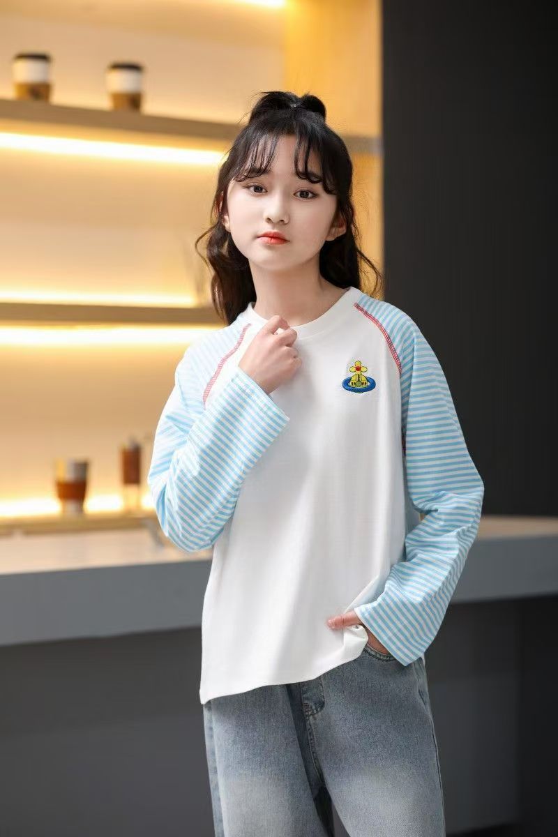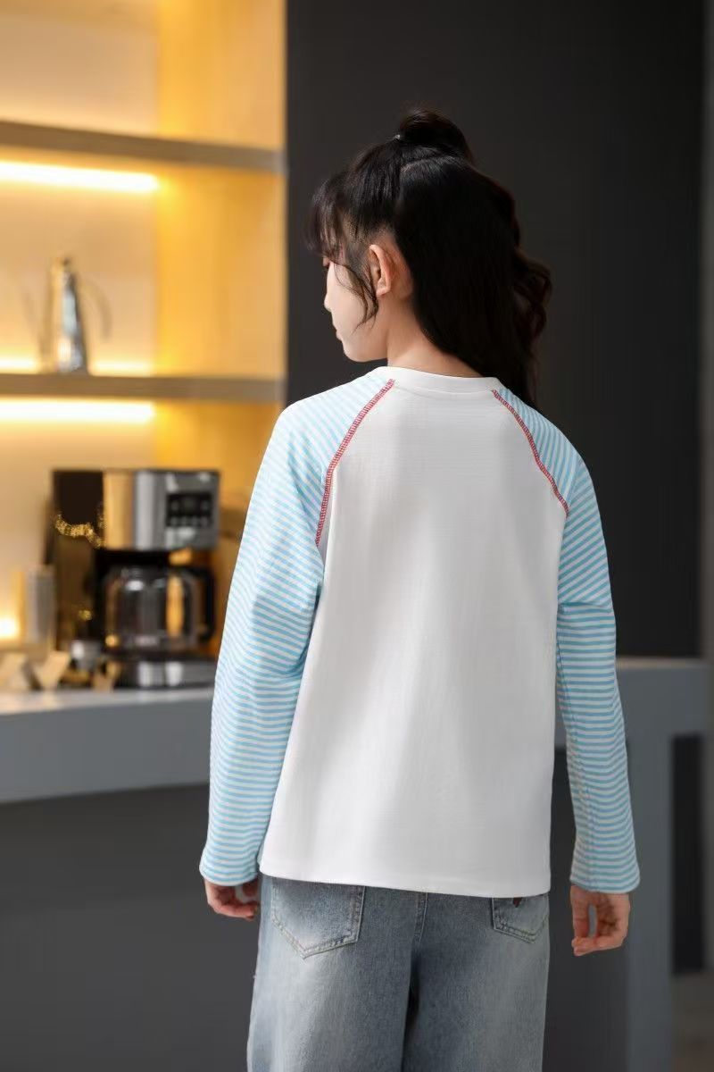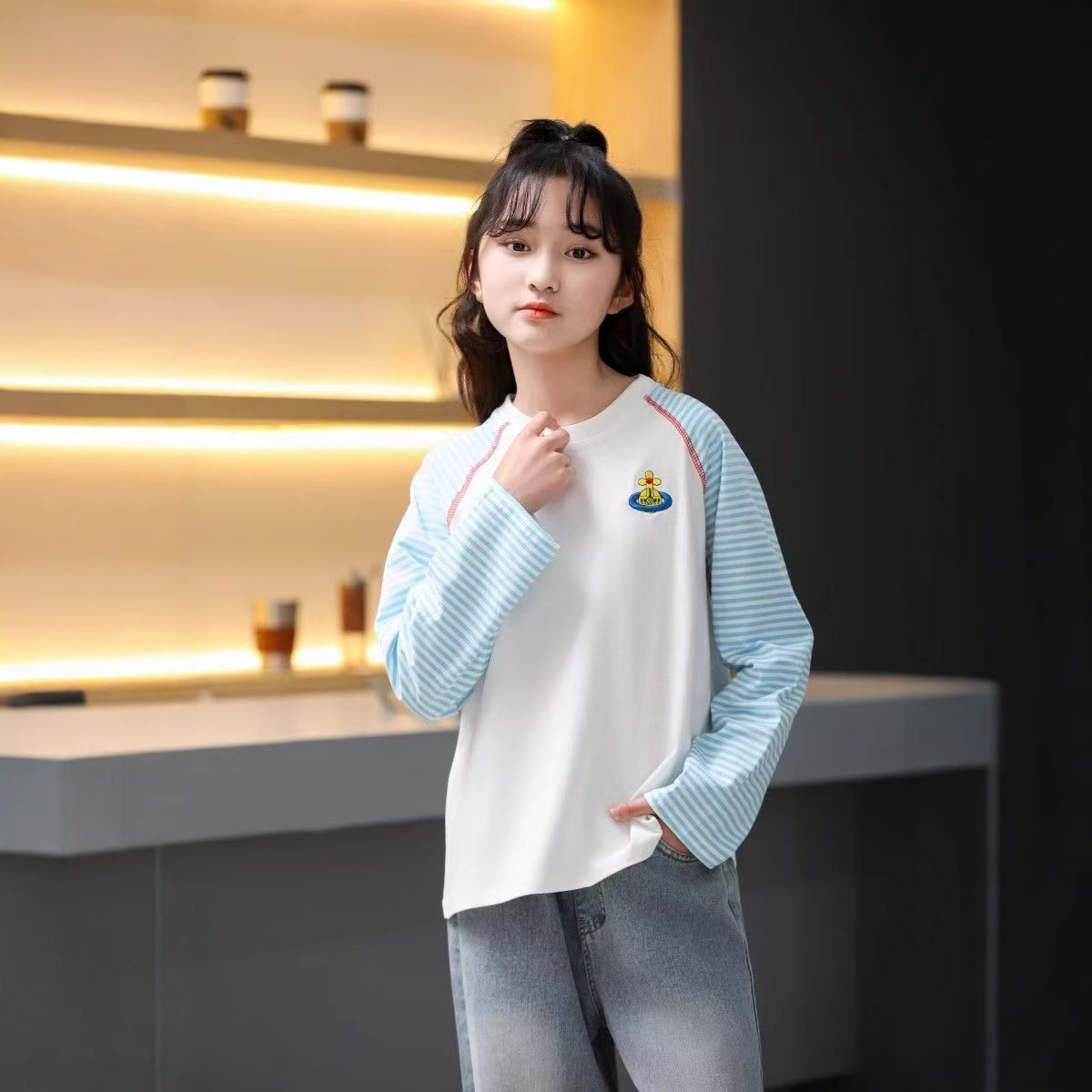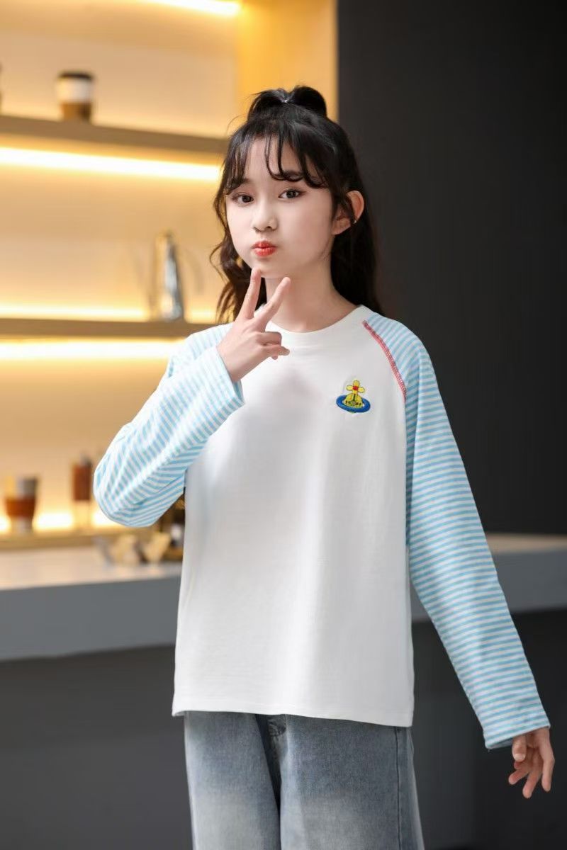 중대형 어린이 순면 줄무늬 라글란 슬리브 대비 색상 탑 어린이 가을 새로운 만화 수 놓은 긴팔 티셔츠 소녀스토어 가기