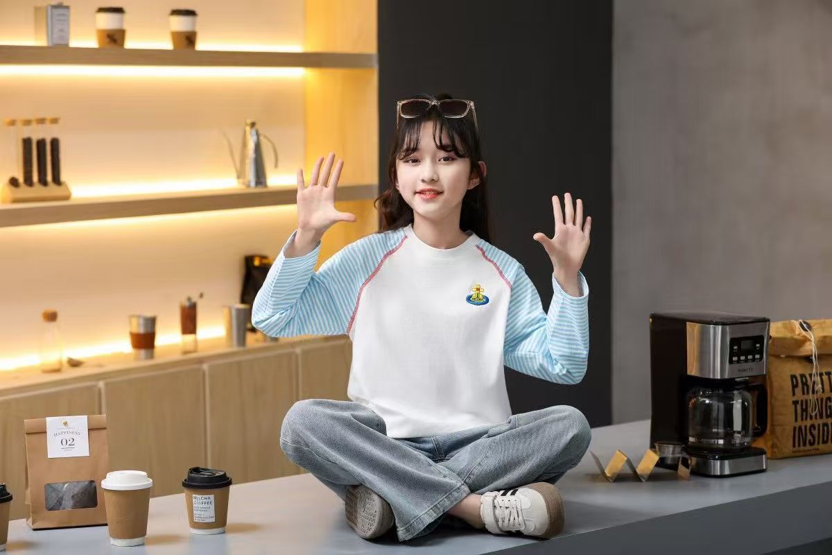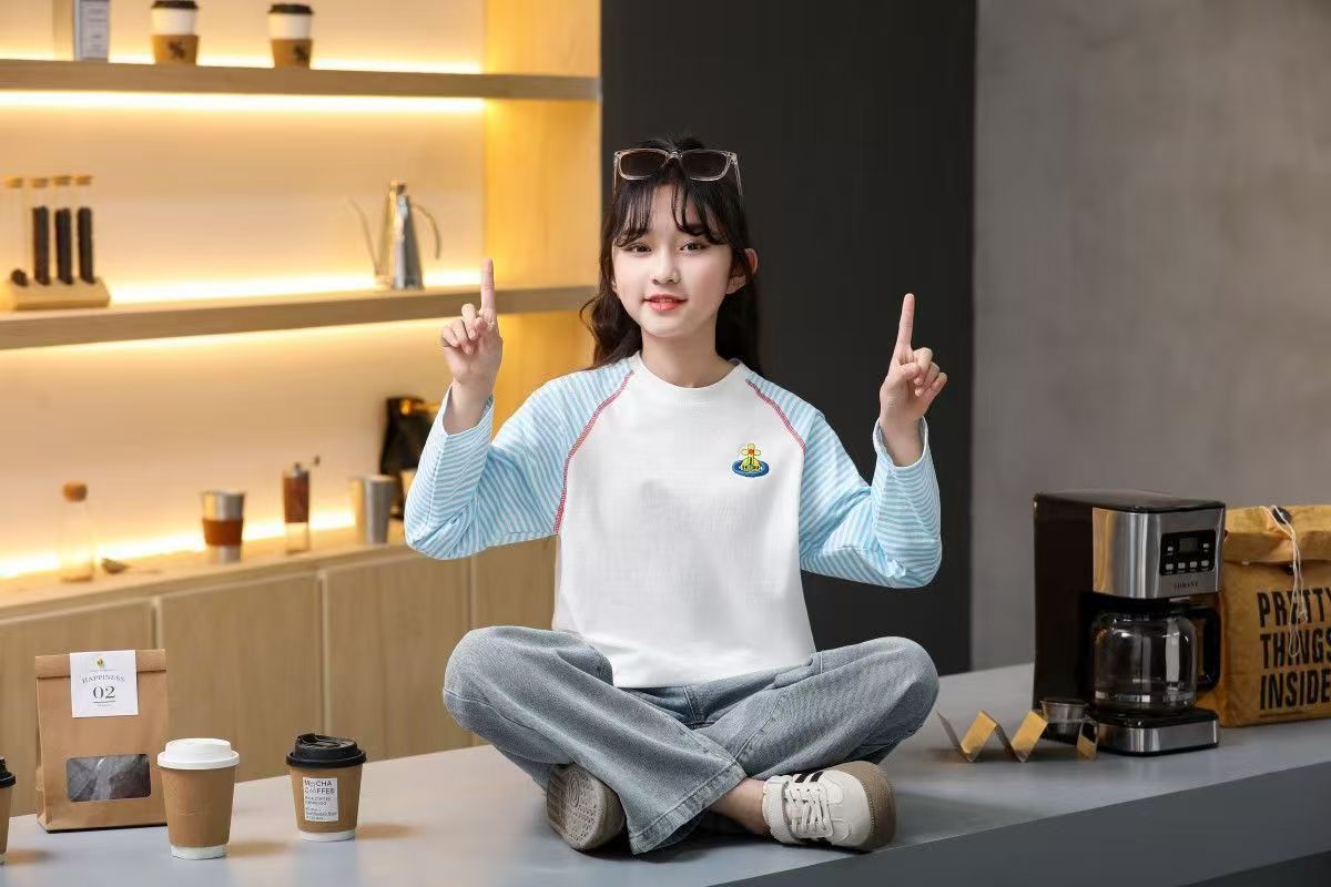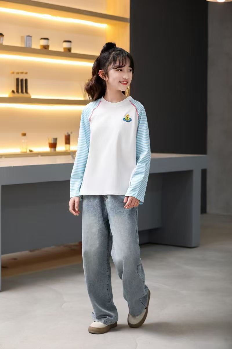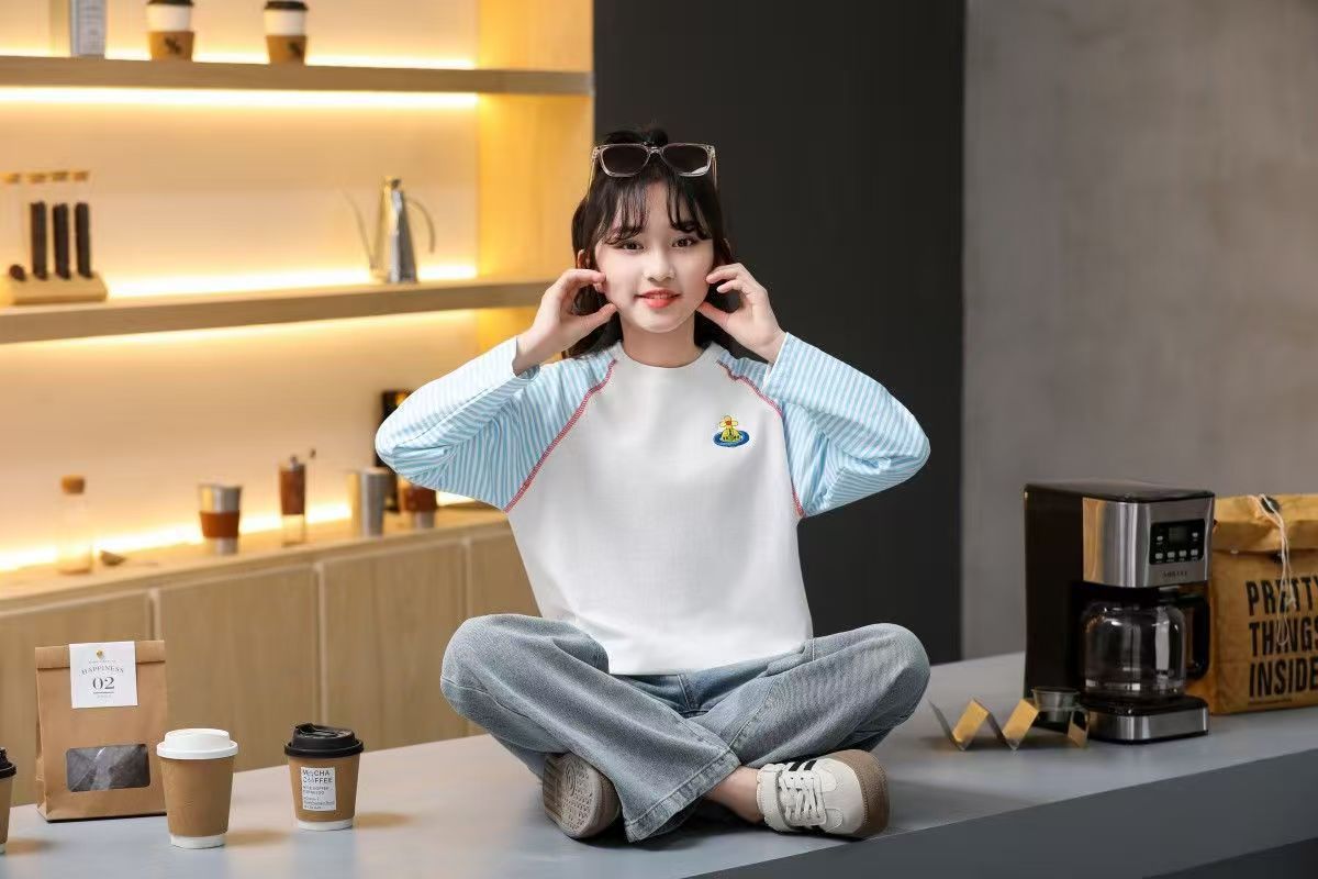 중대형 어린이 순면 줄무늬 라글란 슬리브 대비 색상 탑 어린이 가을 새로운 만화 수 놓은 긴팔 티셔츠 소녀스토어 가기