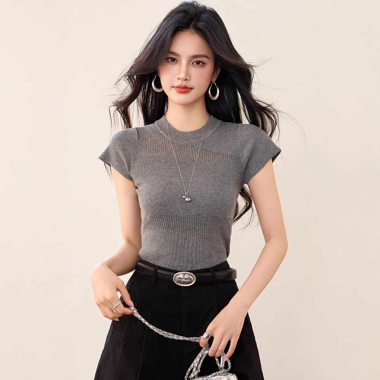 2025 년 여름 새로운 한국 스타일 가볍게 성숙한 착용 슬리밍 우아한 반팔 중공 디자인 짧은 니트 탑 여성