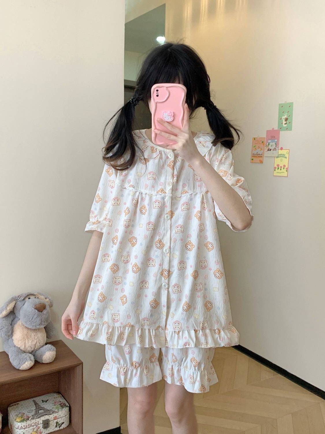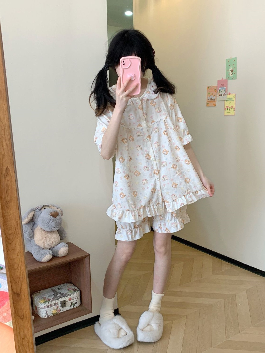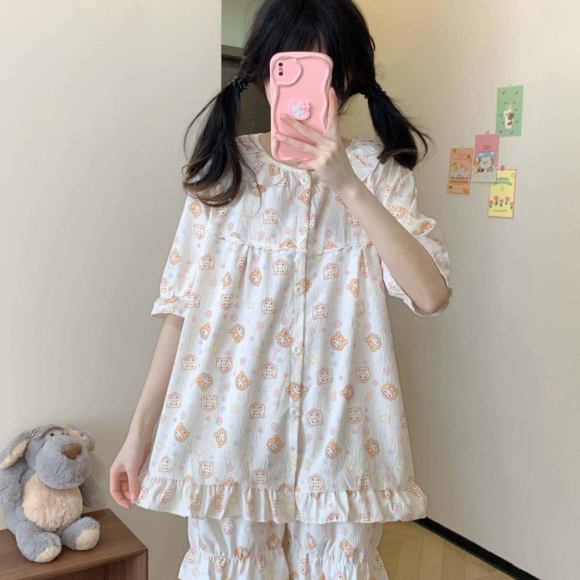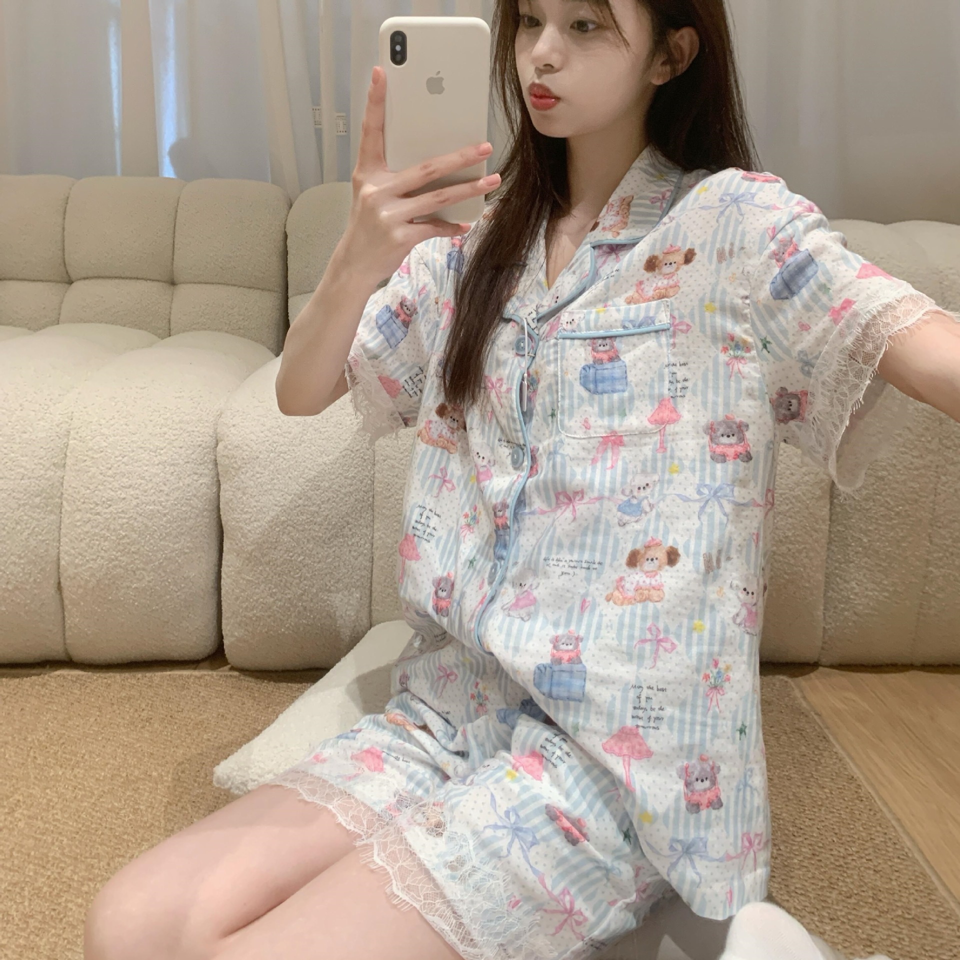 딸기 편안 베어 파자마 여성 여름 새 스타일 레이스 반팔 일본식 귀여운 학생 홈 의류 세트 외복스토어 가기