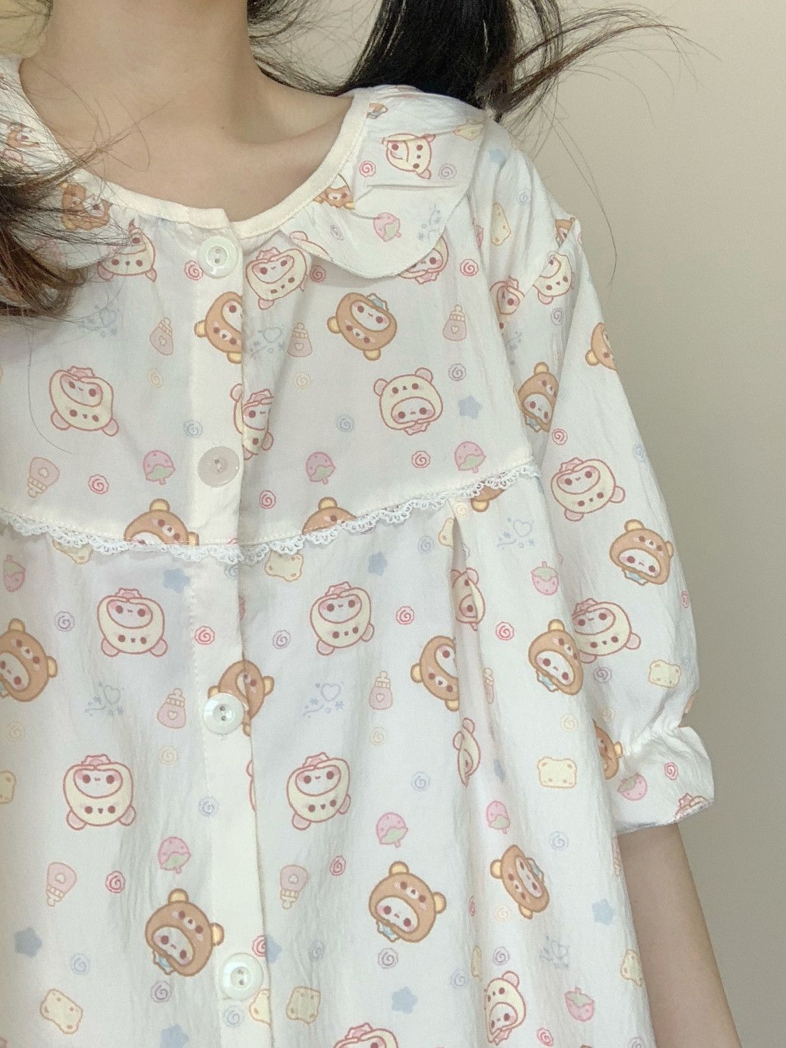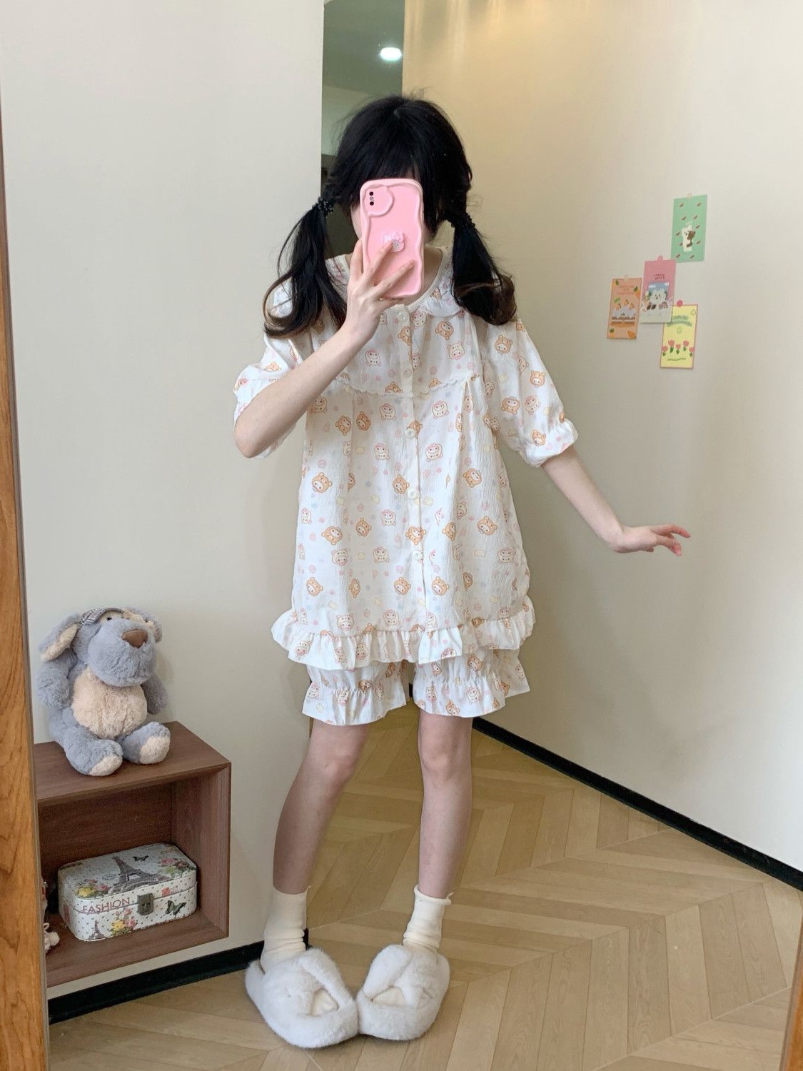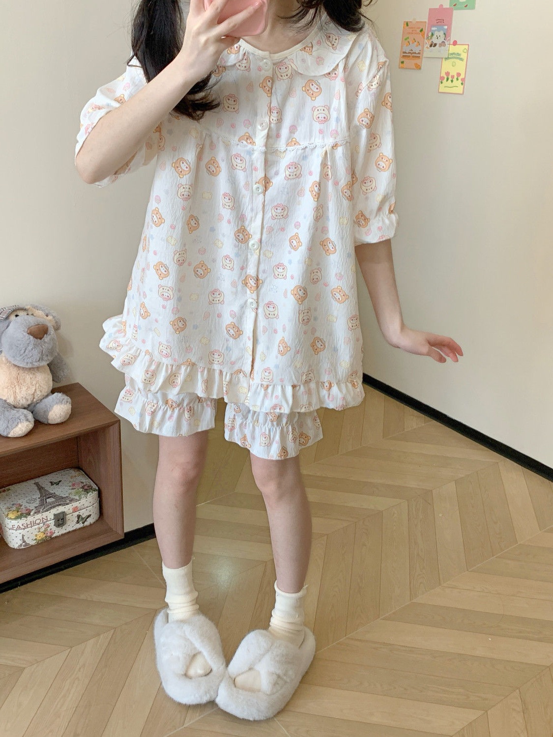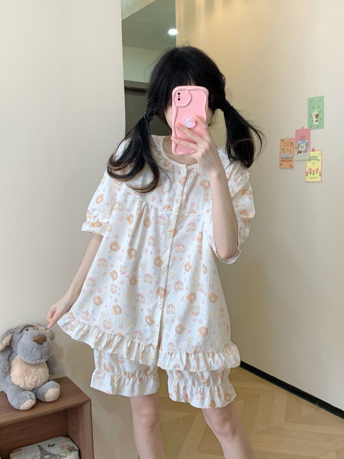 딸기 편안 베어 파자마 여성 여름 새 스타일 레이스 반팔 일본식 귀여운 학생 홈 의류 세트 외복스토어 가기