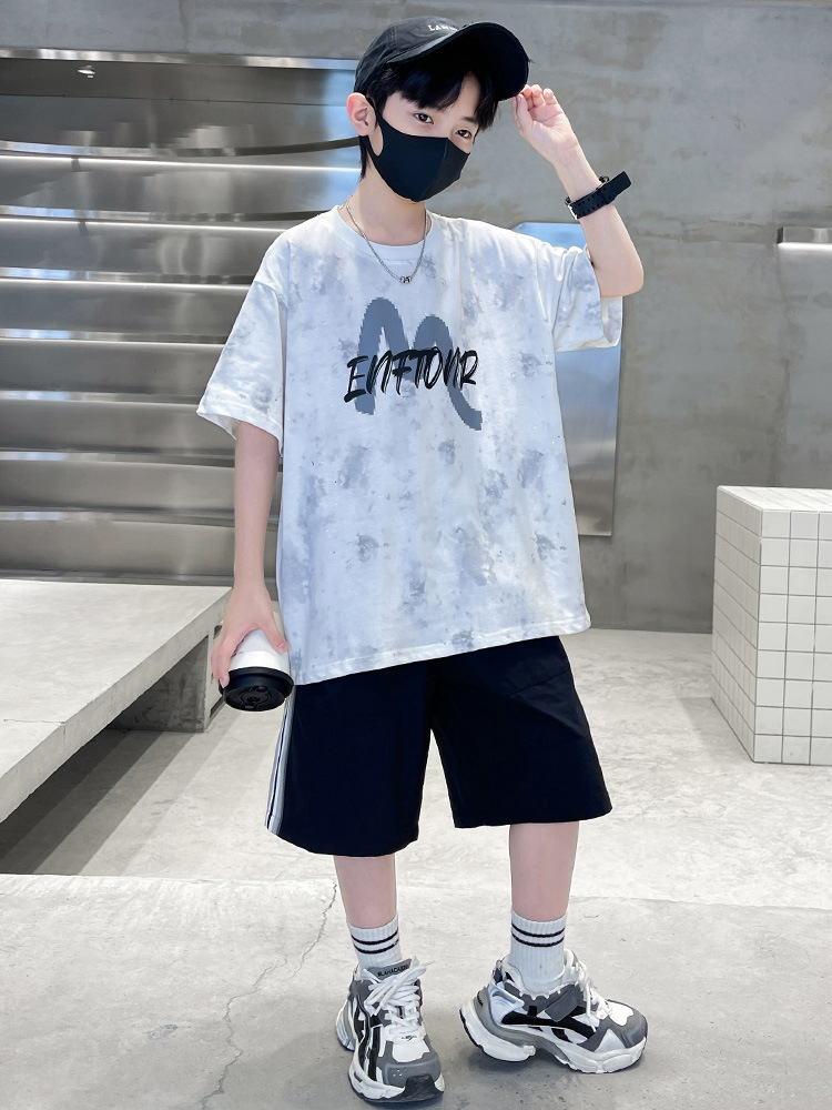 소년 반팔 티셔츠 세트 2025 여름 새 스타일 중대형 아동용 얇은 상의와 5부 바지 투피스 세트