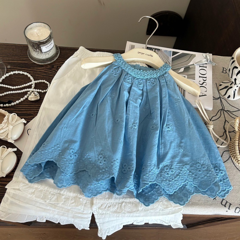 한국식 아동복 2025 새 여름 소녀 할로우 레이스 넥 탑 올매치 화이트 트렌디 바지 투피스 세트