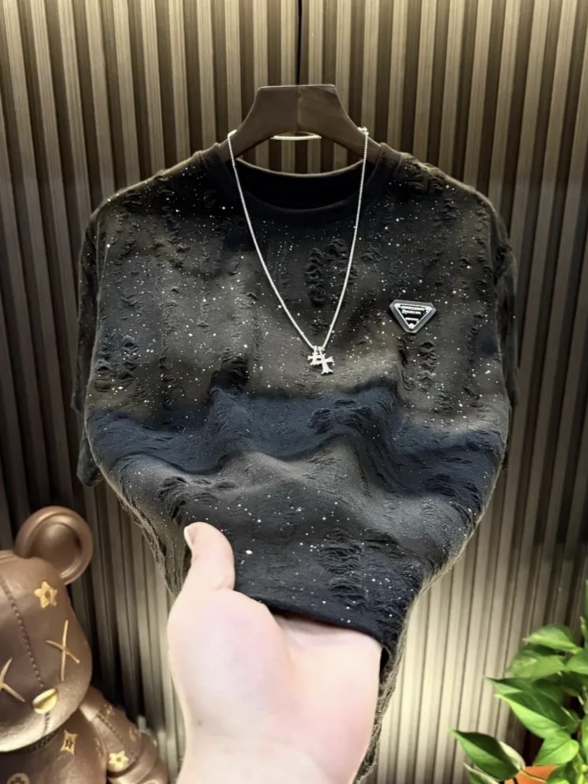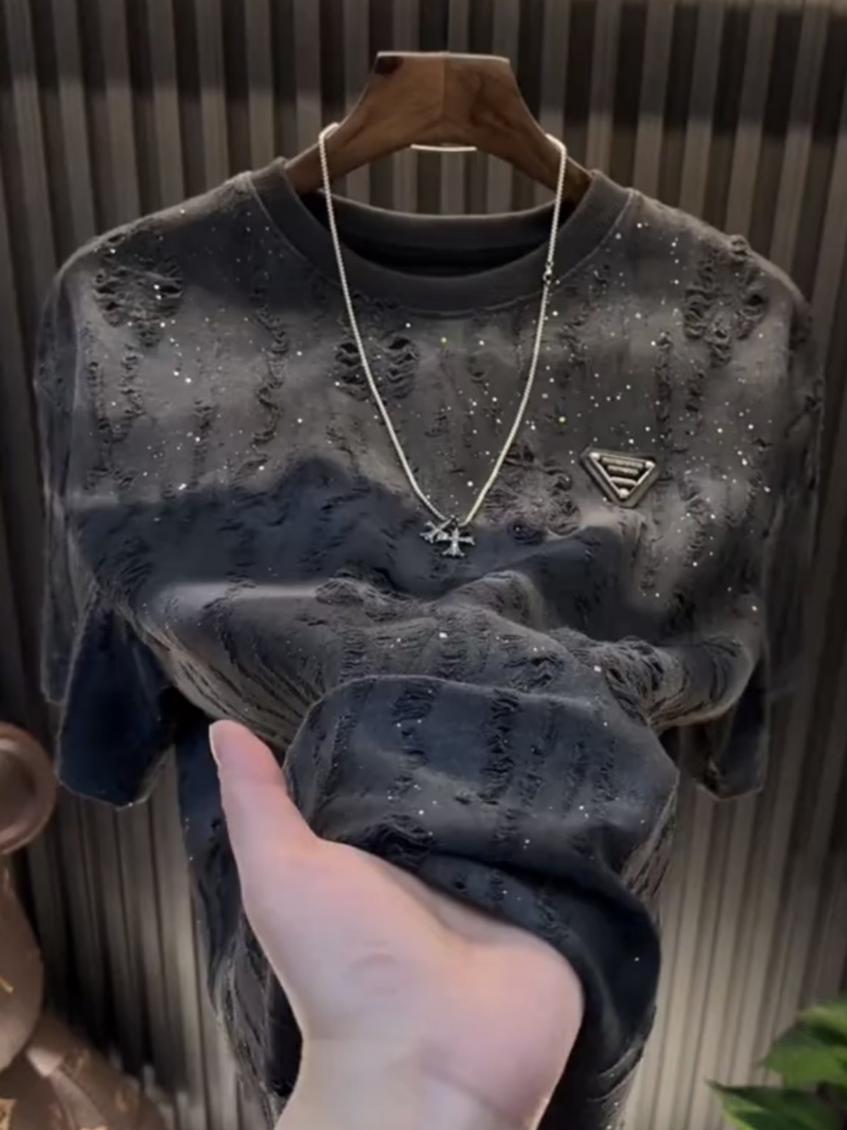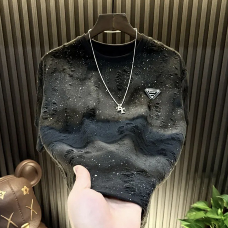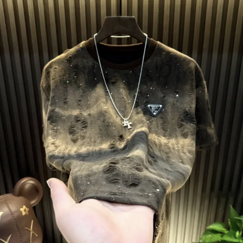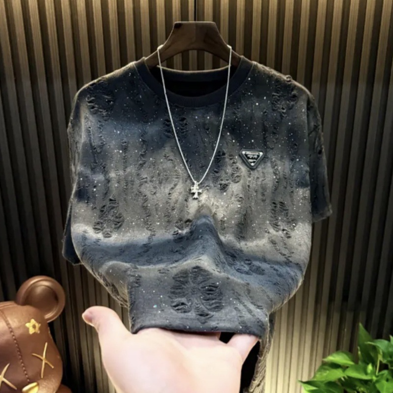 대외 무역 신작 2025 안개꽃 티셔츠 트렌디 브랜드 하이엔드 라운드 넥 탑 스팽글 루즈 찢어진 반팔 티셔츠 남성용스토어 가기