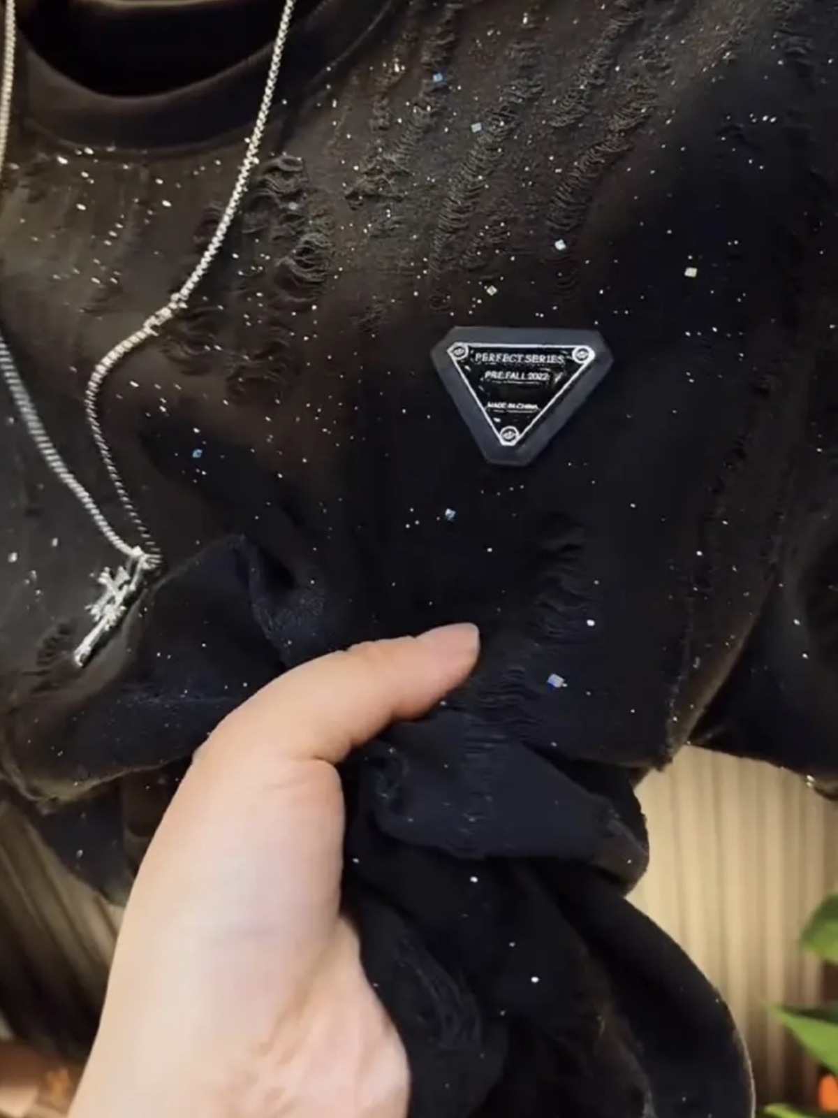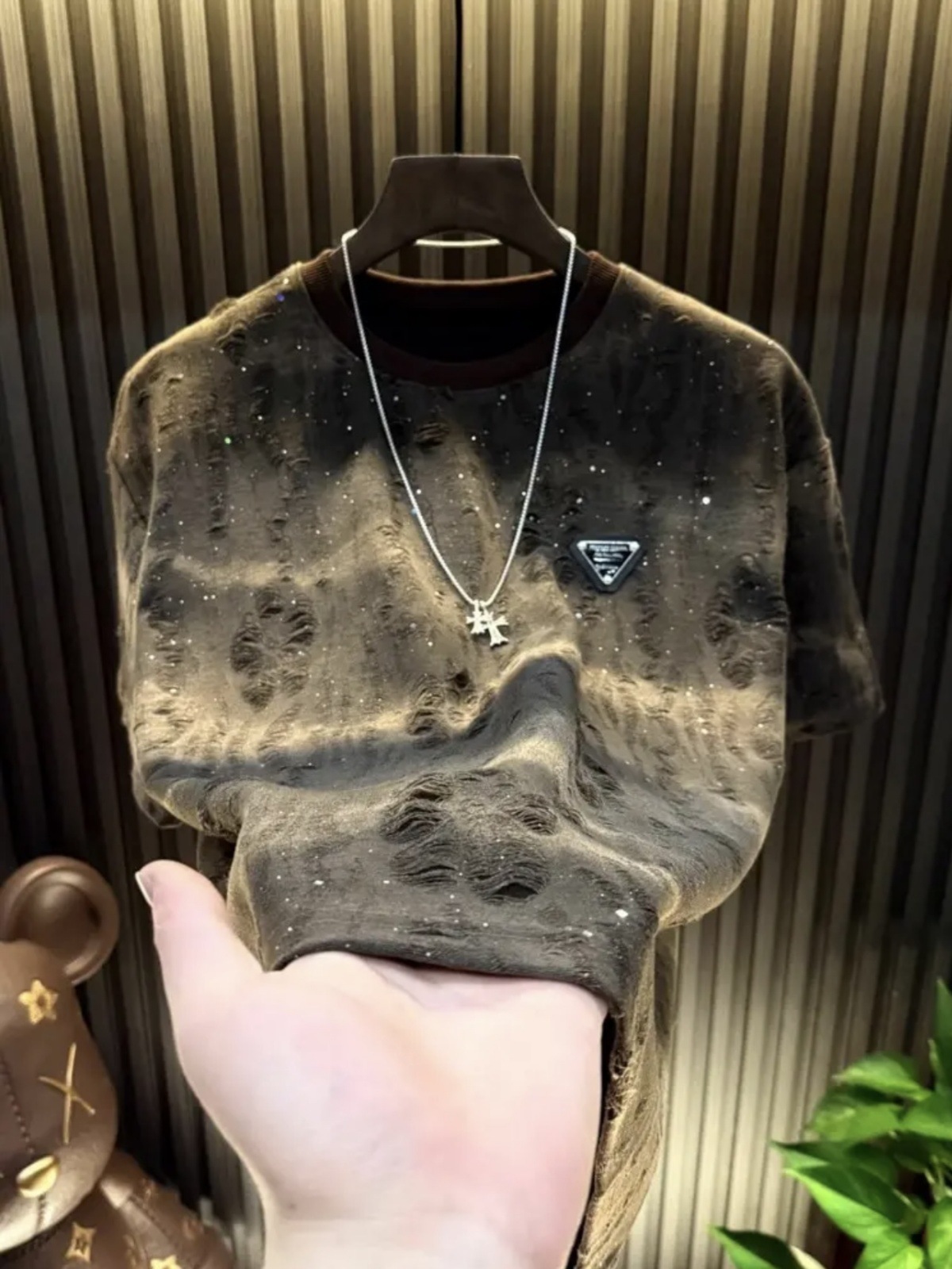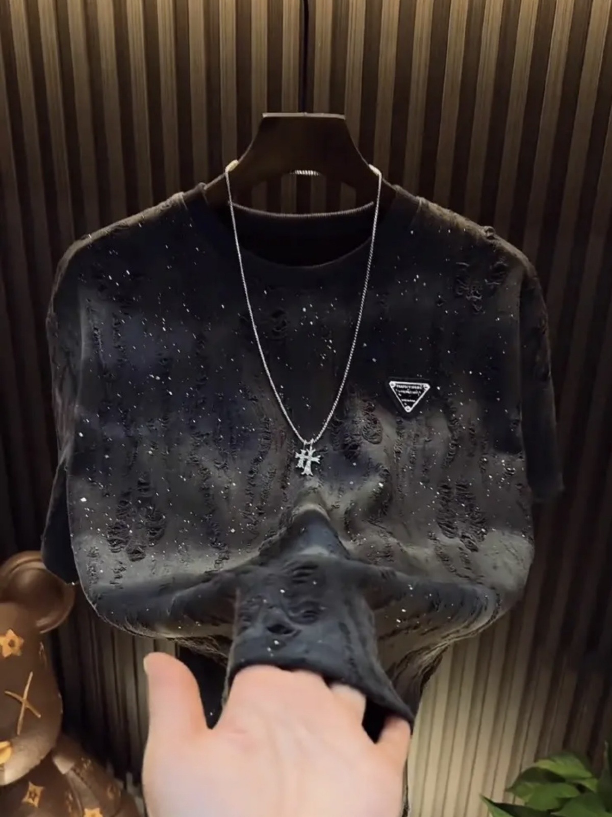 대외 무역 신작 2025 안개꽃 티셔츠 트렌디 브랜드 하이엔드 라운드 넥 탑 스팽글 루즈 찢어진 반팔 티셔츠 남성용스토어 가기