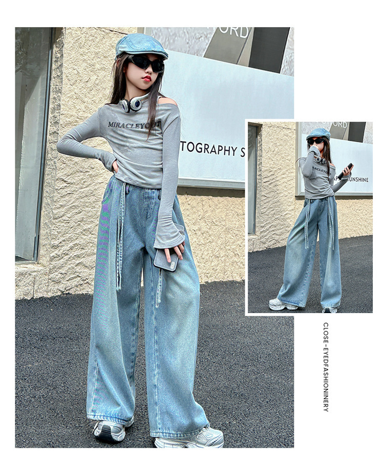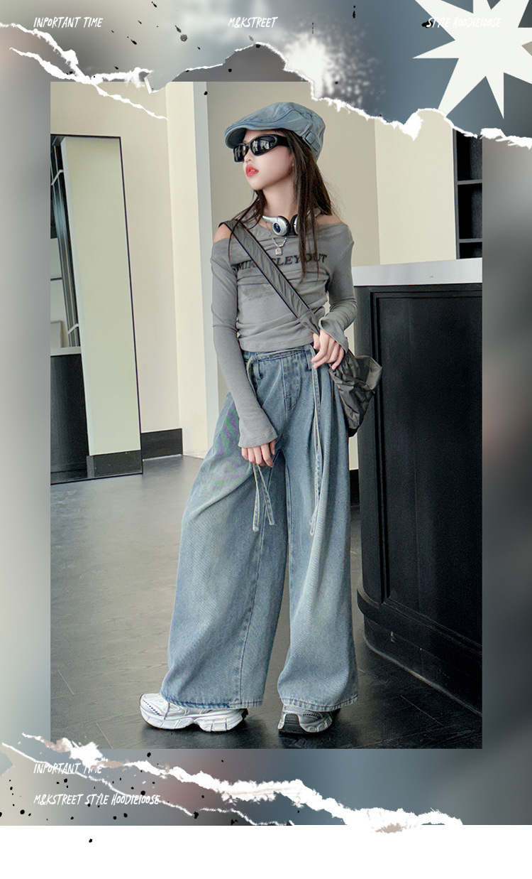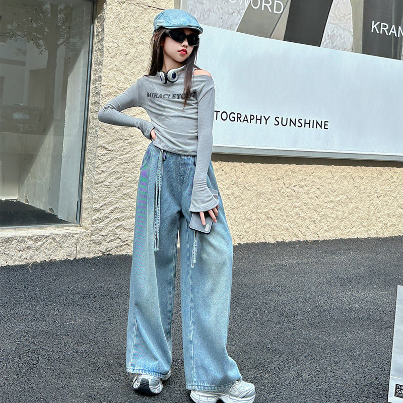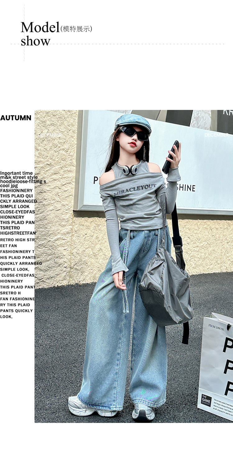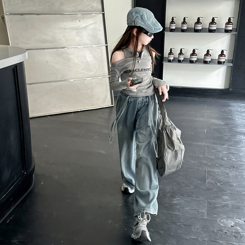 어린이 및 소녀의 가을 세트 긴팔베이스 2024 셔츠 새 스타일 중대형 어린이 데님 와이드 레그 바지 투피스 웨스턴 스타일스토어 가기