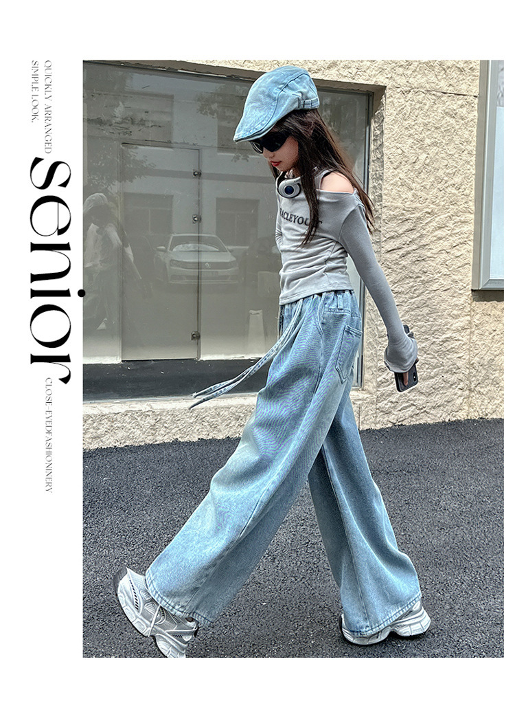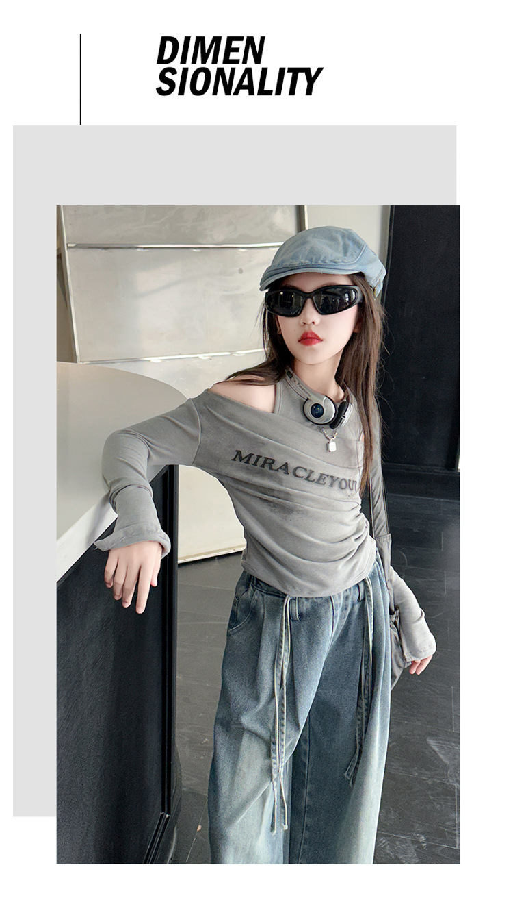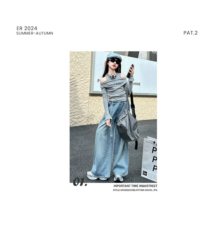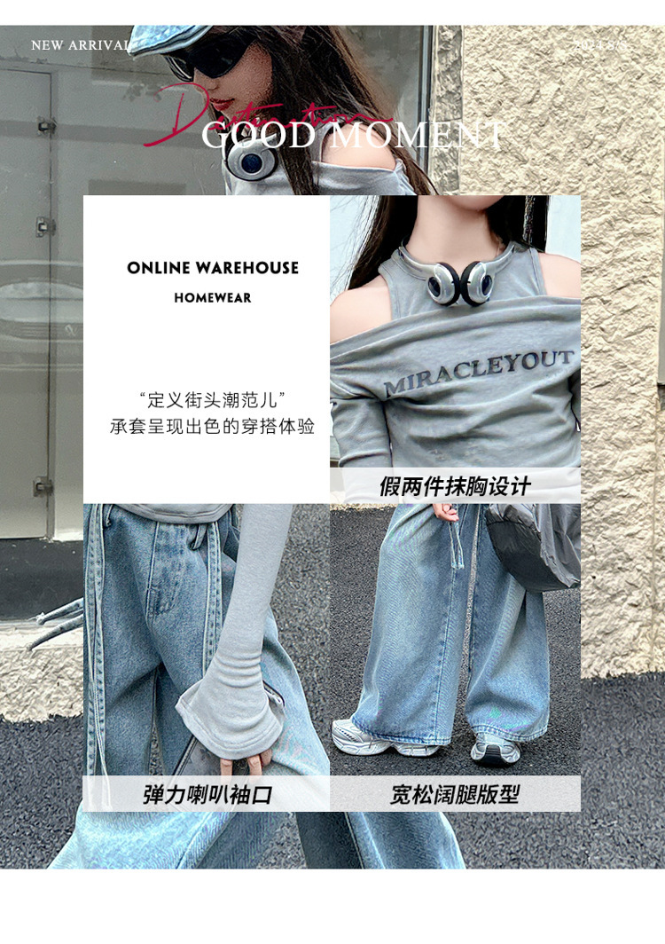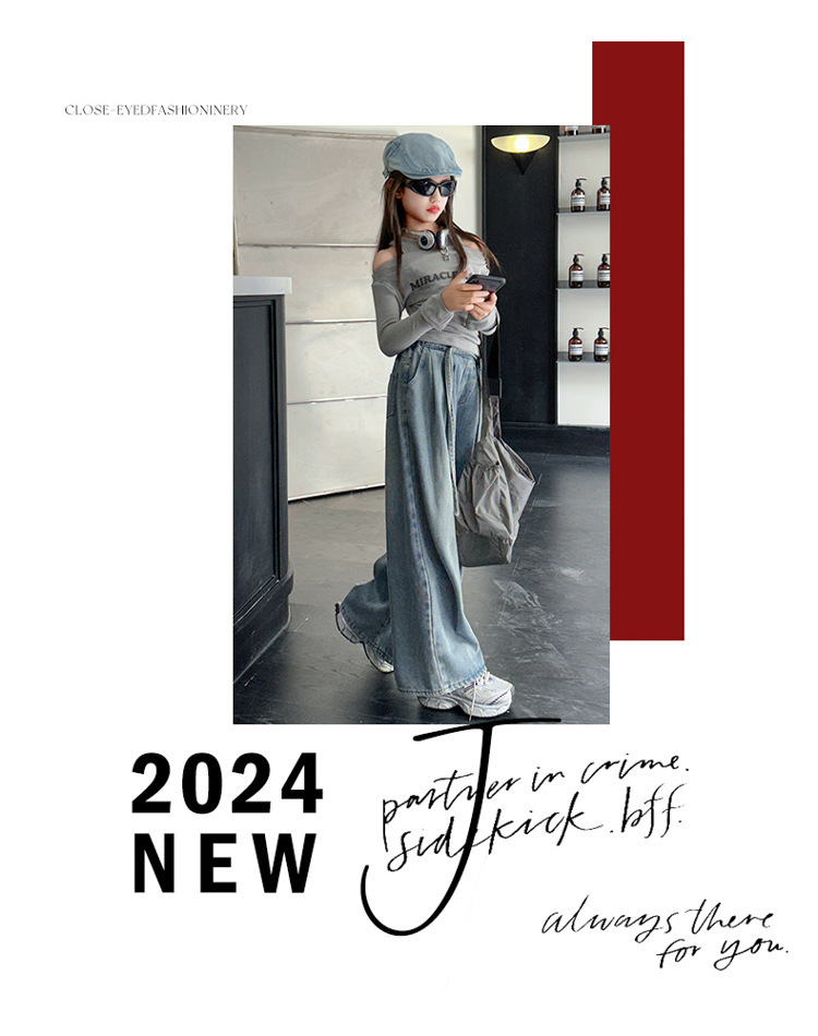 어린이 및 소녀의 가을 세트 긴팔베이스 2024 셔츠 새 스타일 중대형 어린이 데님 와이드 레그 바지 투피스 웨스턴 스타일스토어 가기