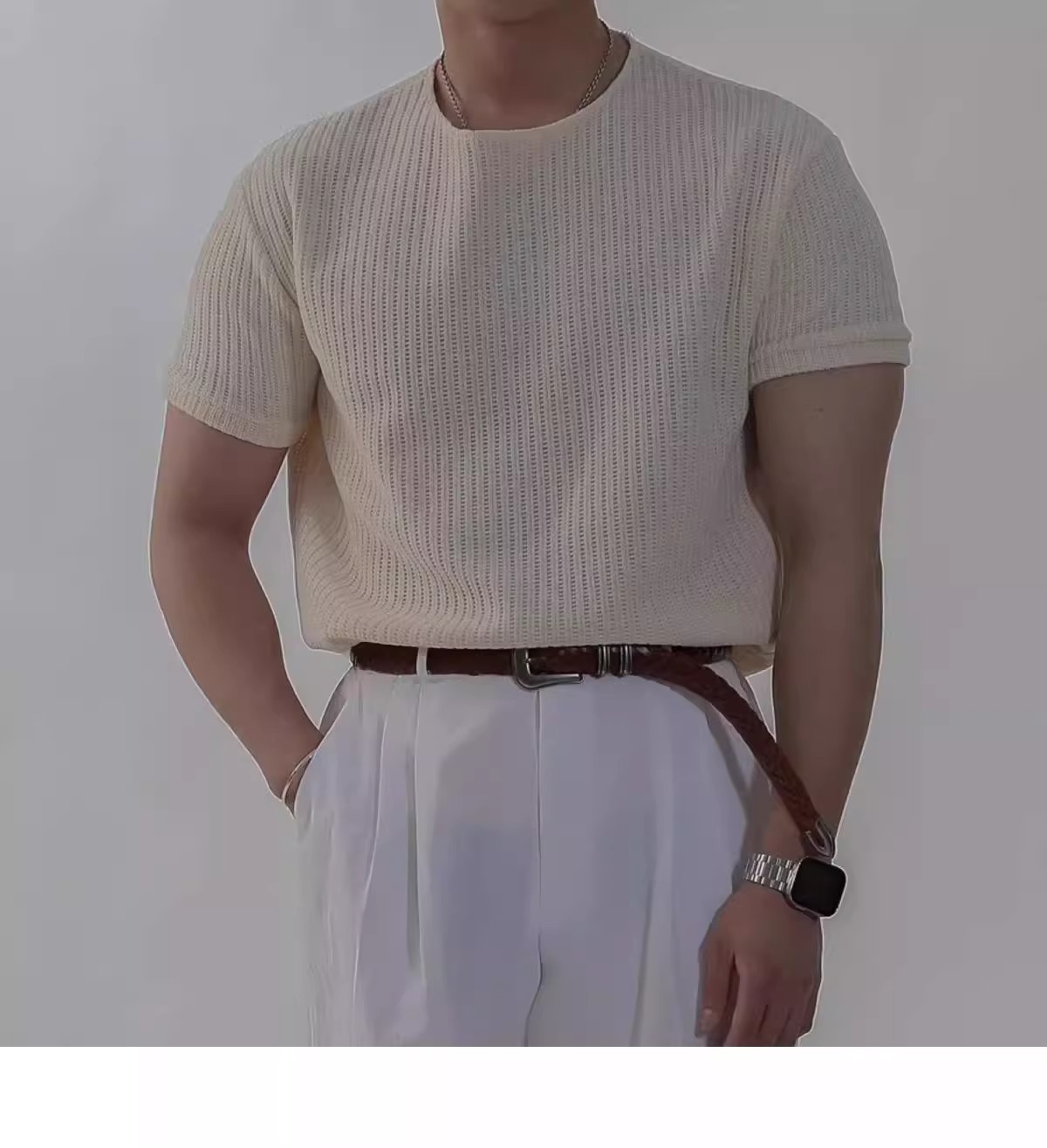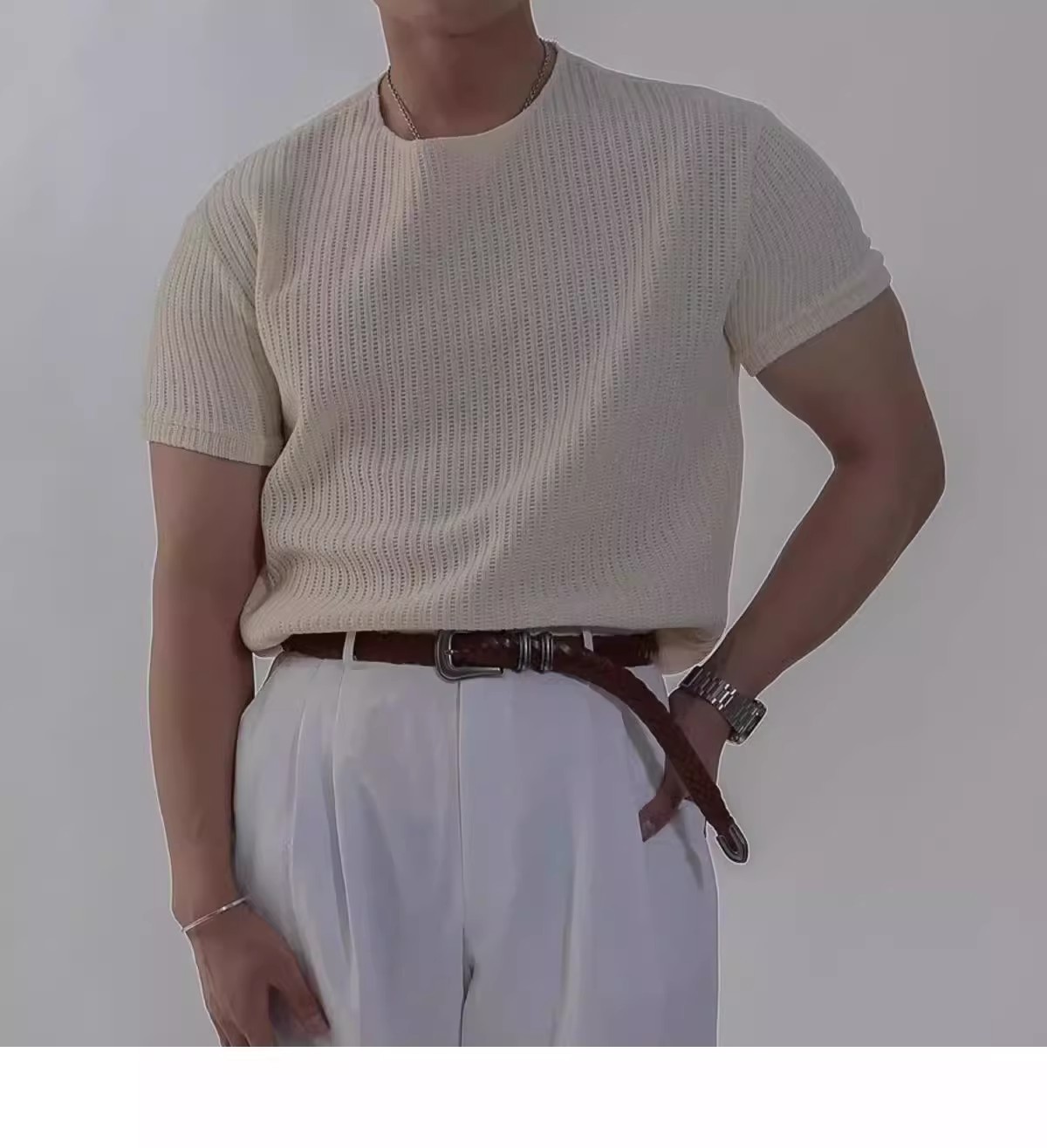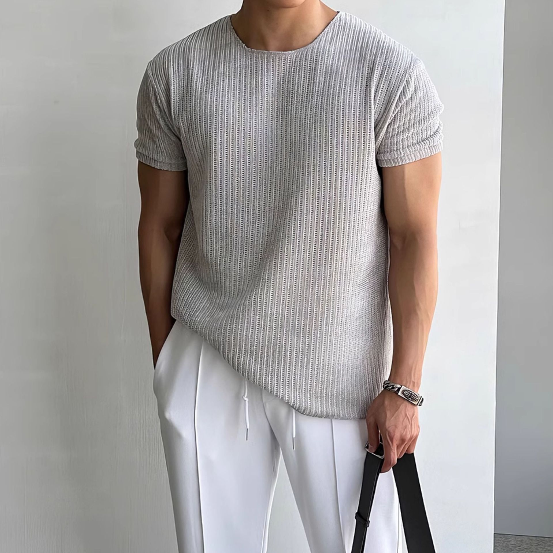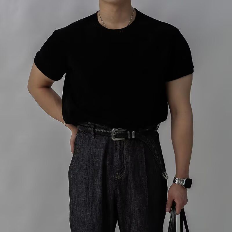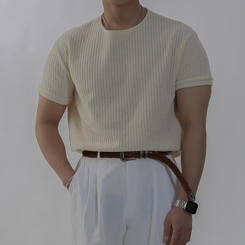캐주얼 니트 반팔 남성 영국 복고풍 가볍고 성숙한 스타일 중공 얼음 실크 통기성 슬림 티셔츠 탑 바닥 셔츠스토어 가기