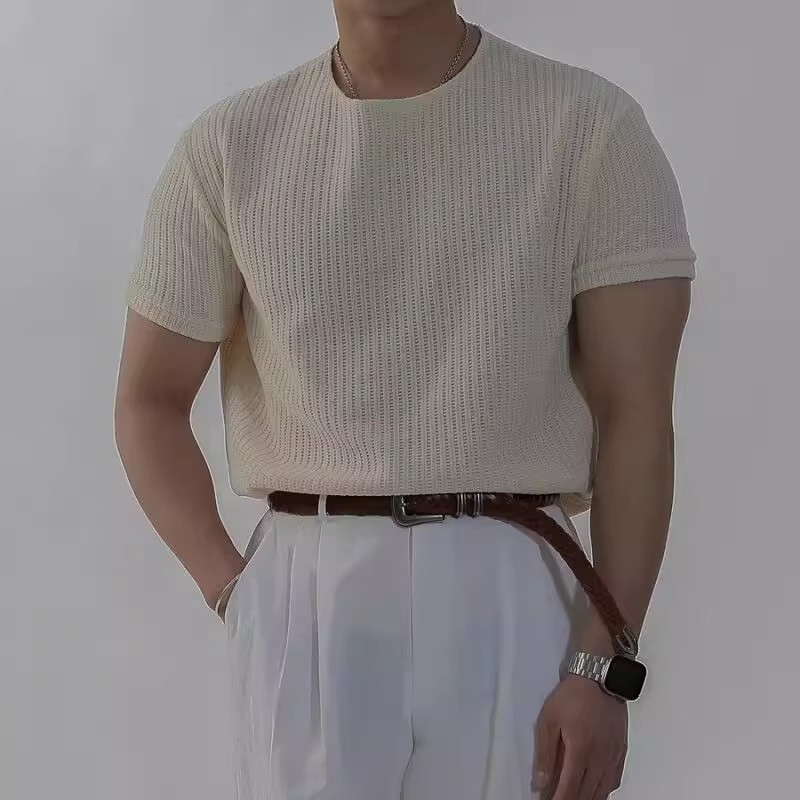 캐주얼 니트 반팔 남성 영국 복고풍 가볍고 성숙한 스타일 중공 얼음 실크 통기성 슬림 티셔츠 탑 바닥 셔츠