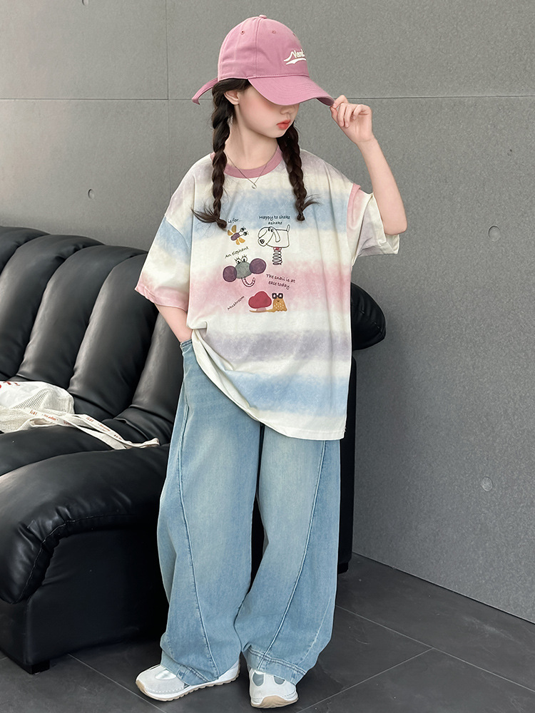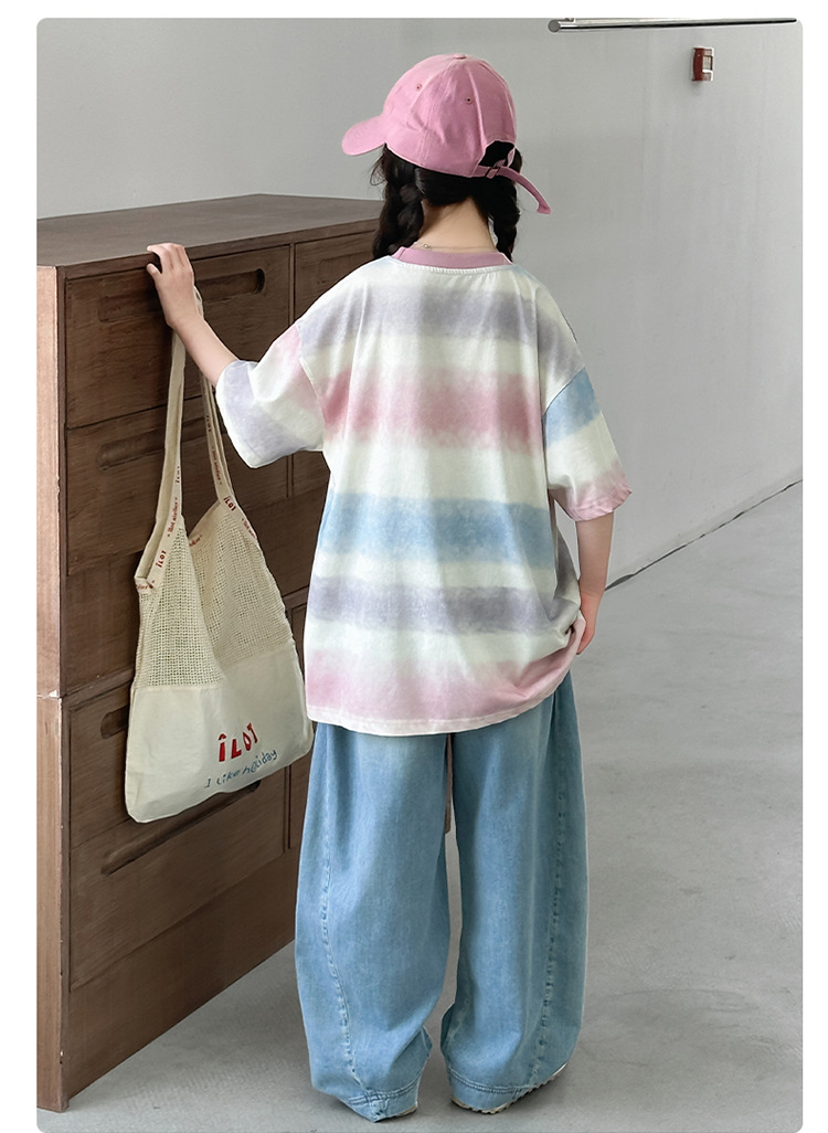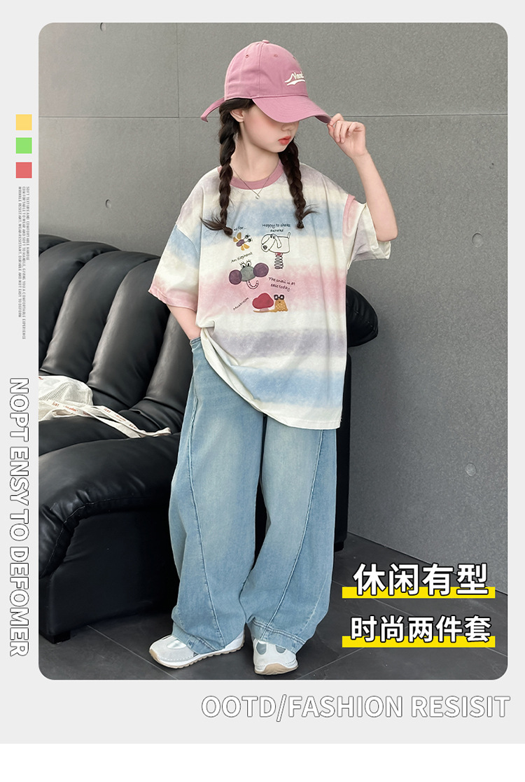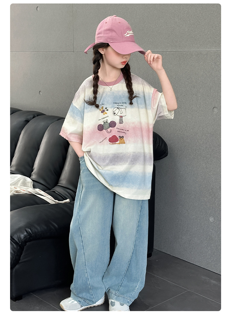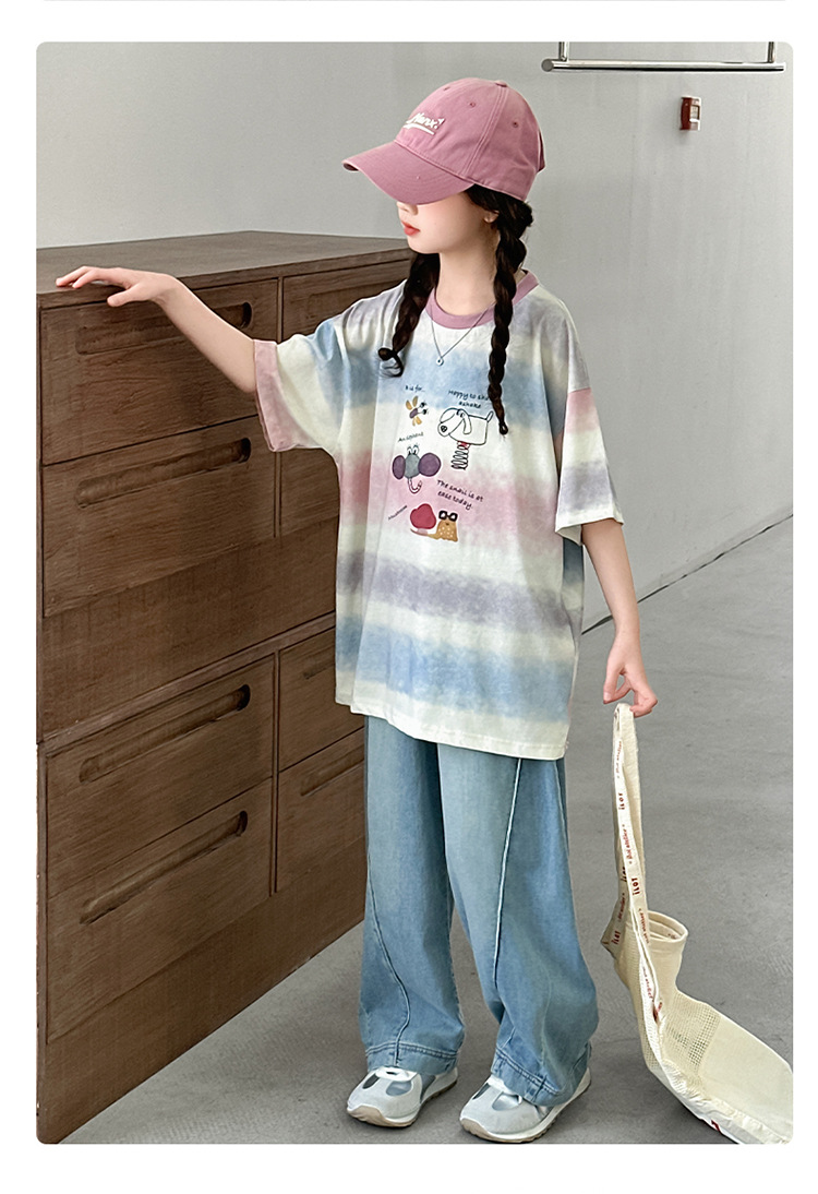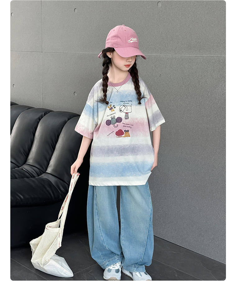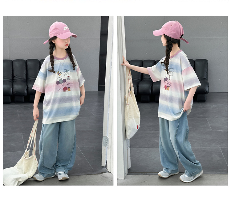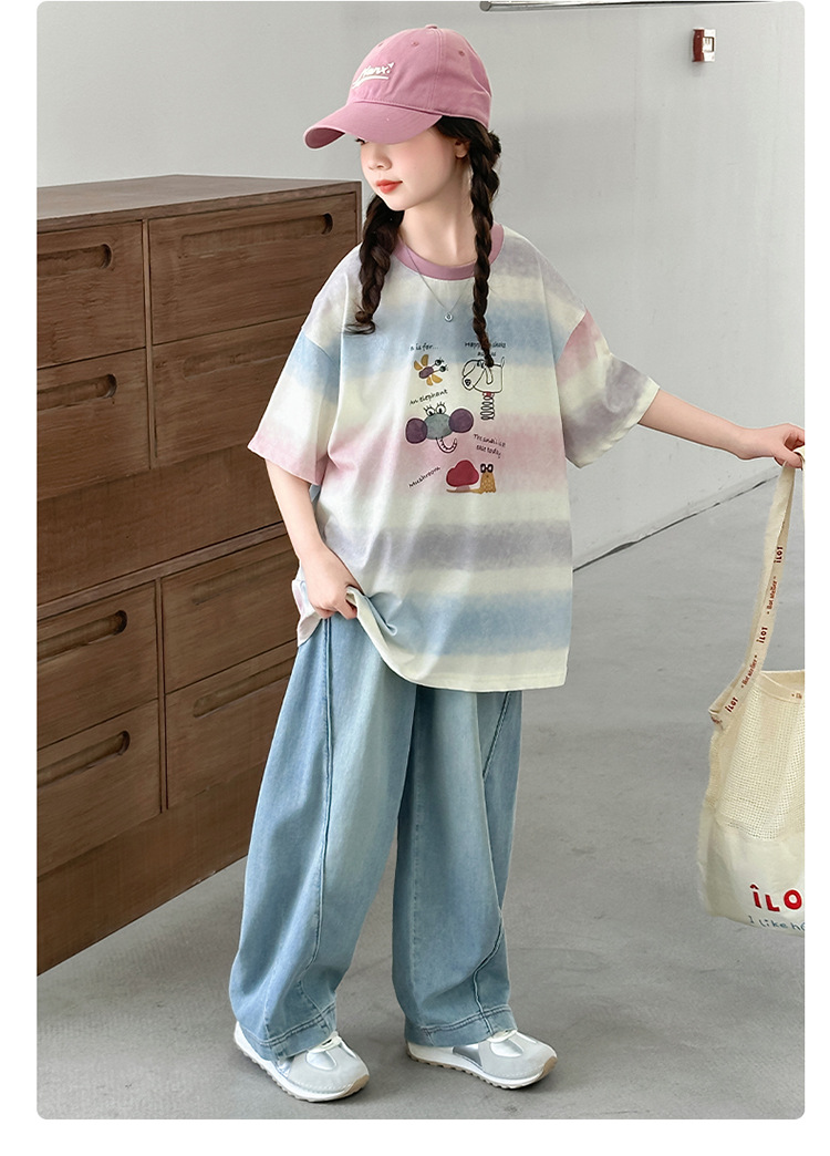 여자 여름 캐주얼 세트 2025 새로운 어린이 서양식 줄무늬 반팔 탑 데님 와이드 레그 바지 투피스 세트스토어 가기